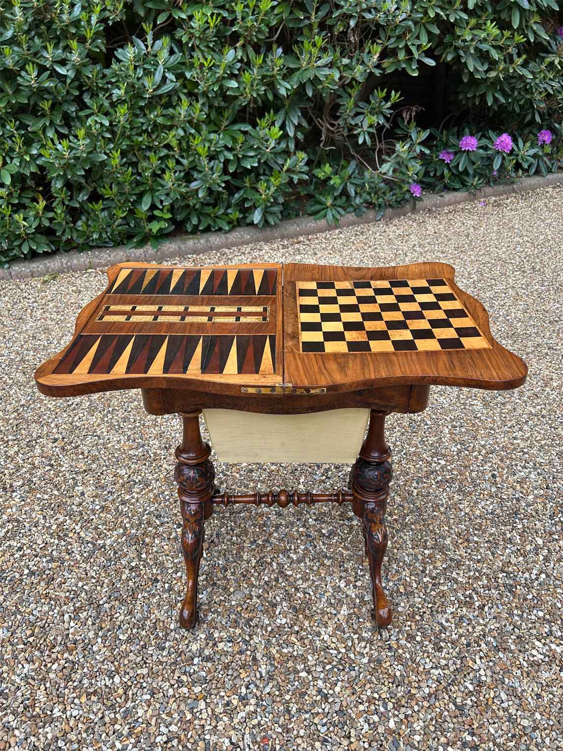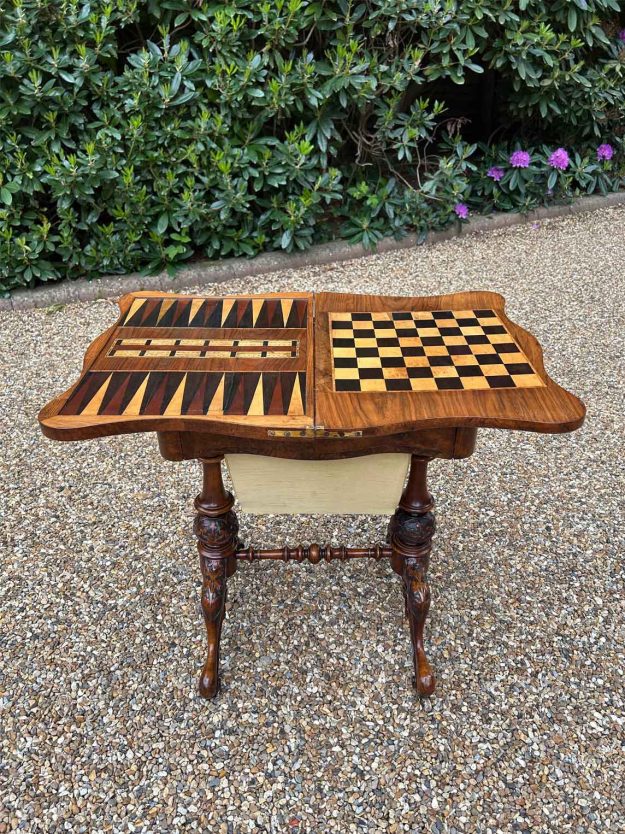 A very high qauality Victorian Burr Walnut Games Table. Opening up the top reveals a tulipwood and boxwood chess/draughts board, a boxwood, ebony and tulipwood backgammon board and a cribbage board. Beneath the top is a single drawer and a work box for extra storage. The table has 2 carved end supports on carved cabriole…