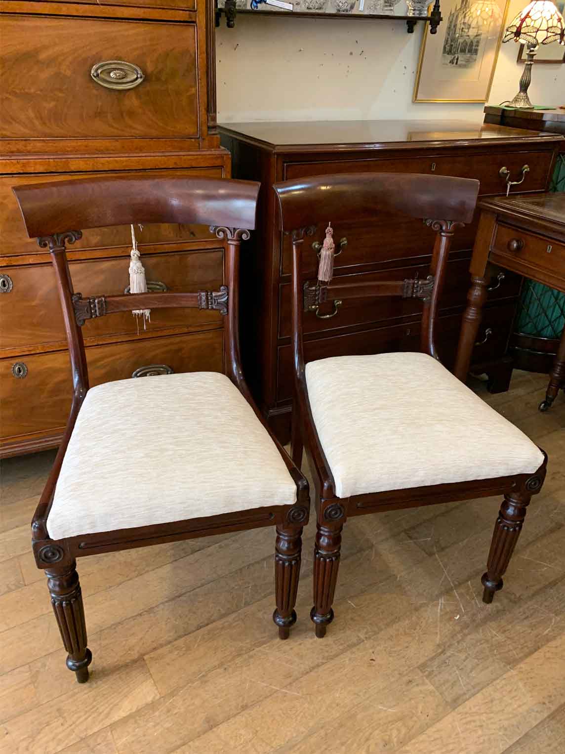 A pair of Regency Mahogany Barback Dining Chairs with drop in seats, carving and splayed sabre legs. Circa: 1820 Dimensions: Height: 34 inches – 87 cms Width: 18.5 inches – 47 cms Depth: 16 inches – 41 cms Height to Seat: 19 inches – 48 cms Reference: CP2220 POA