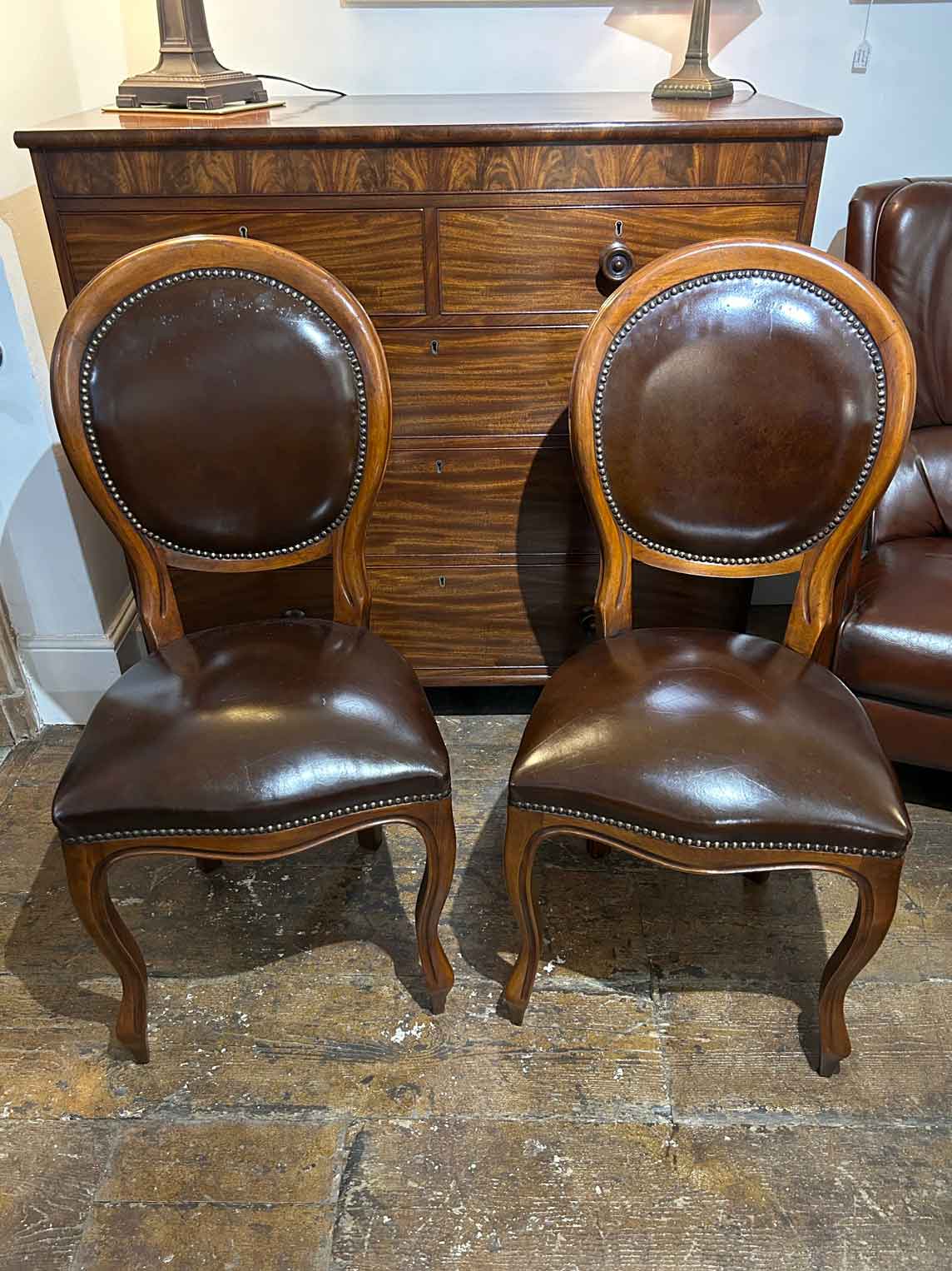 A pair of Mahogany Balloon Back Dining Chairs, with leather upholstery and cabriole legs. Dimensions: Height: 39 inches – 99 cms Width: 19 inches – 49 cms Depth: 18 inches – 46 cms H, Seat: 19 inches – 49 cms Reference: CH2304 POA