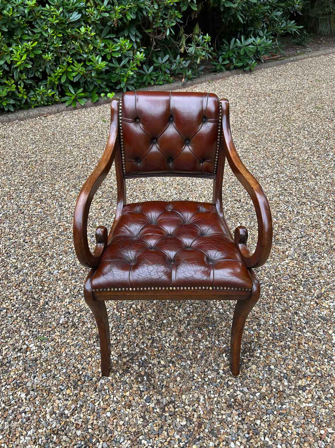 Vintage Mahogany Button Back Carver Chair with drop in a seat and sabre legs Dimensions: Height: 33 inches – 84 cms Width: 20 inches – 51 cms Depth: 17.5 inches – 44 cms Height to seat: 19 inches – 48 cms Reference: CH2401 POA