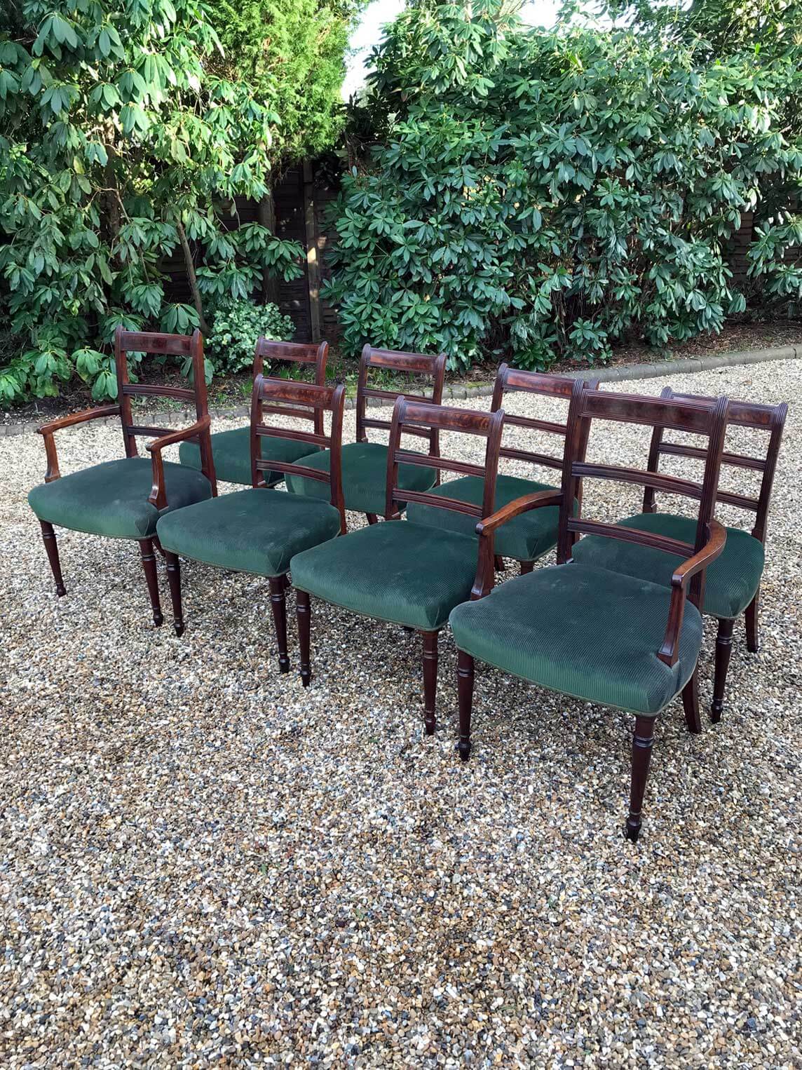 A very good quality set of 8 original George III Mahogany Bar Back Dining Chairs, comprising two carvers and six standard chairs, upholstered in green cord fabric on turned legs. Circa: 1820 Dimensions: Carver Chair Dimensions: Height to Top:  38 inches –  97 cms Height to Seat:   18 inches –  46 cms Width:   22 inches –  56 cms Depth:…