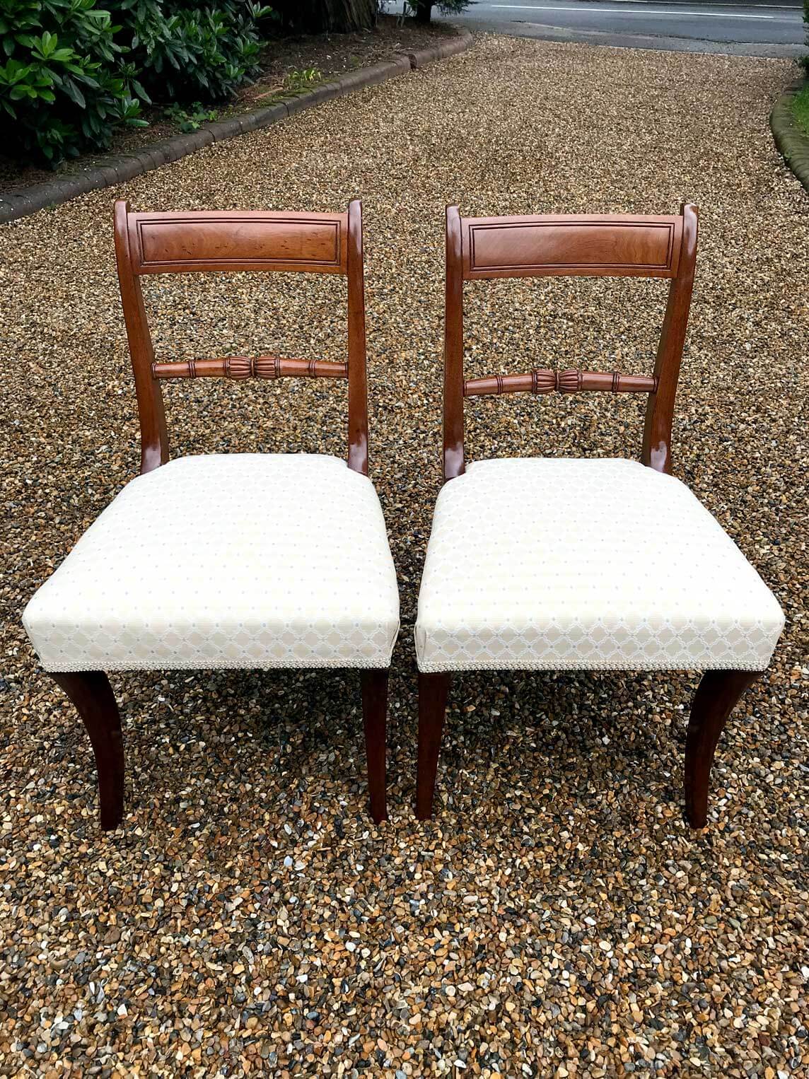 A pair of 19th Century Regency Walnut Chairs with newly upholstered seats with button backs, carving on the top and turned reeded legs. Circa: 1820 Dimensions: Height:  37 inches – 94 cms Height to seat: 19 inches – 48 cms Width: 18 inches – 46 cms Depth: 18 inches – 46 cms Reference: CH2002 POA