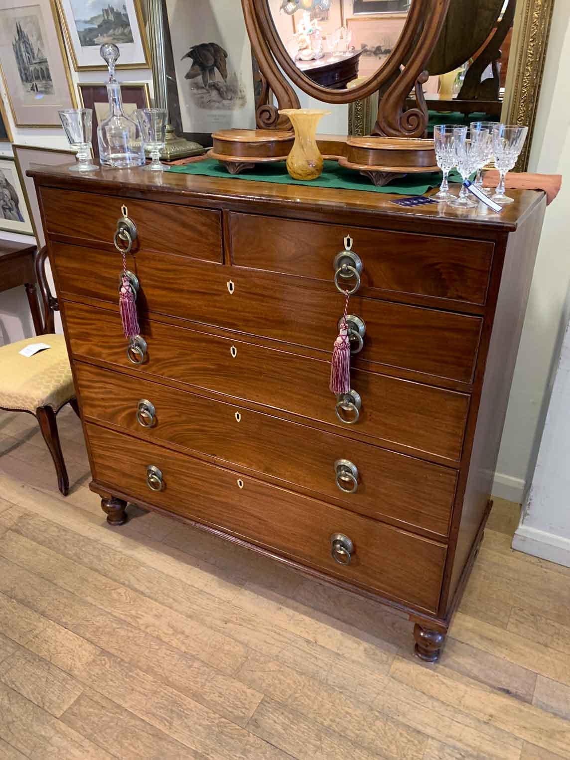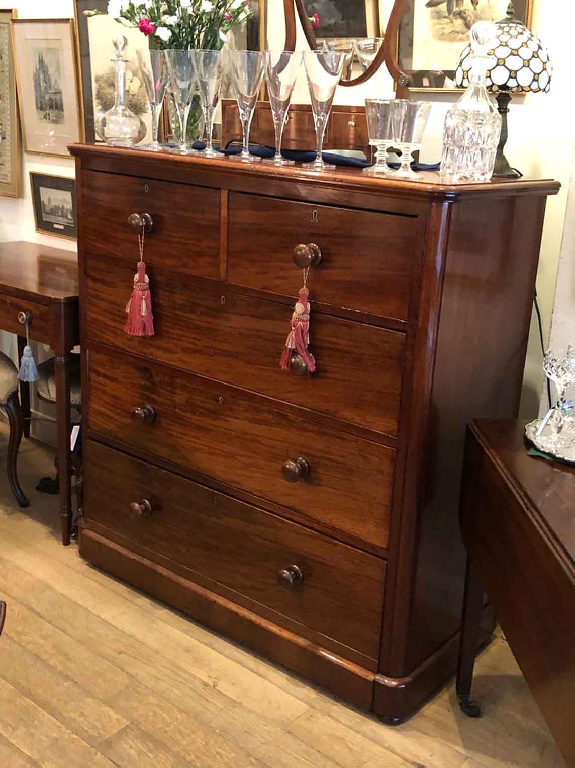 19th Century Victorian Mahogany Chest Of Drawers with two short, three long solid mahogany drawers with bun handles, raised on a platform base. Circa: 1860 Dimensions: Height: 41 inches – 105 cms Width: 41 inches – 105 cms Depth: 19.5 inches – 50 cms Reference: C2102 POA
