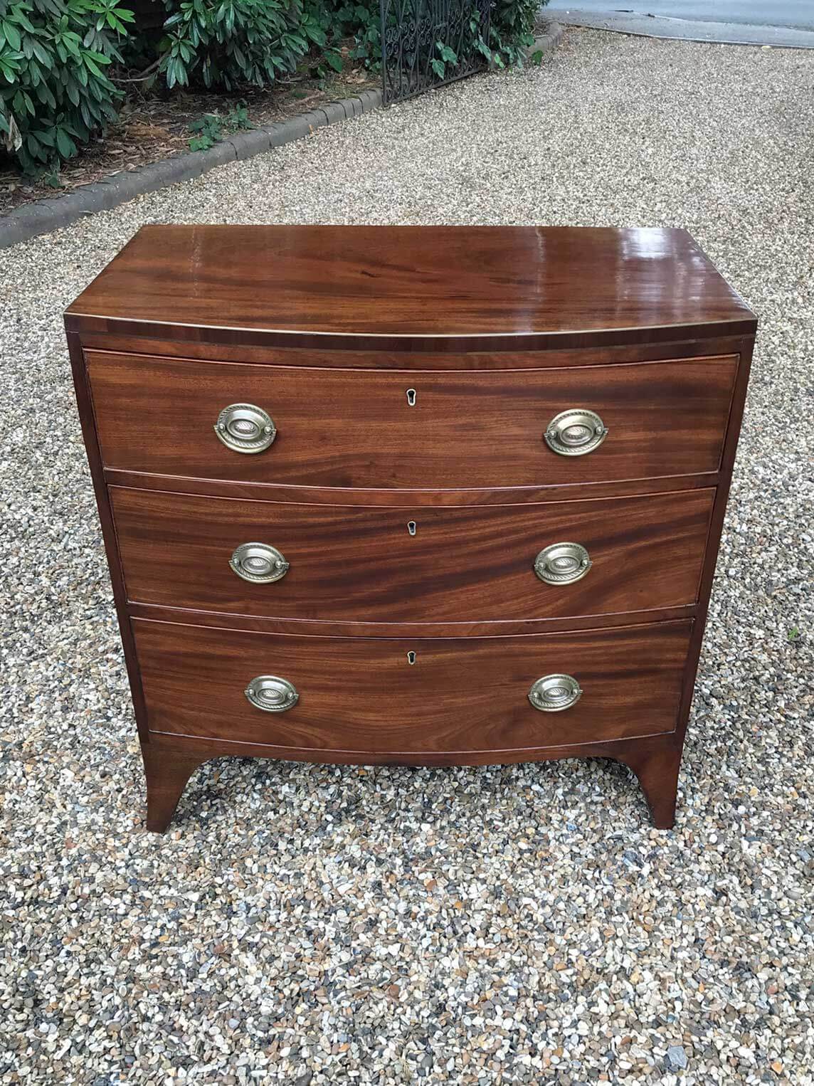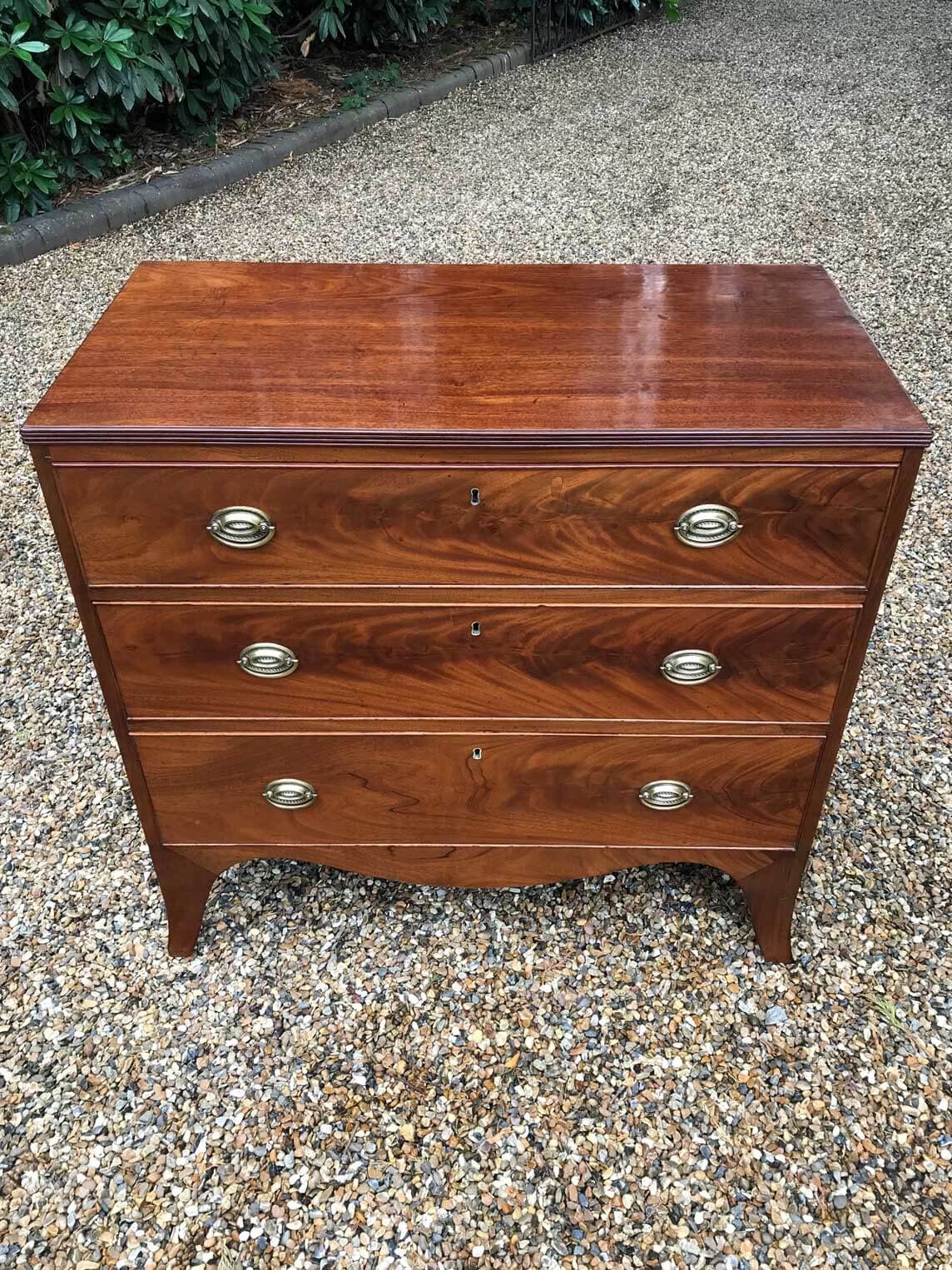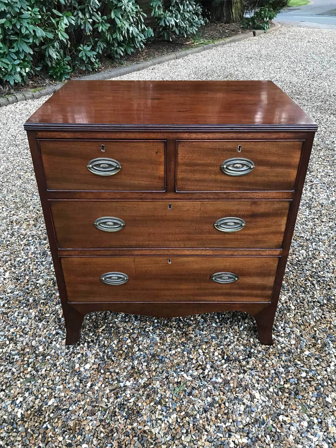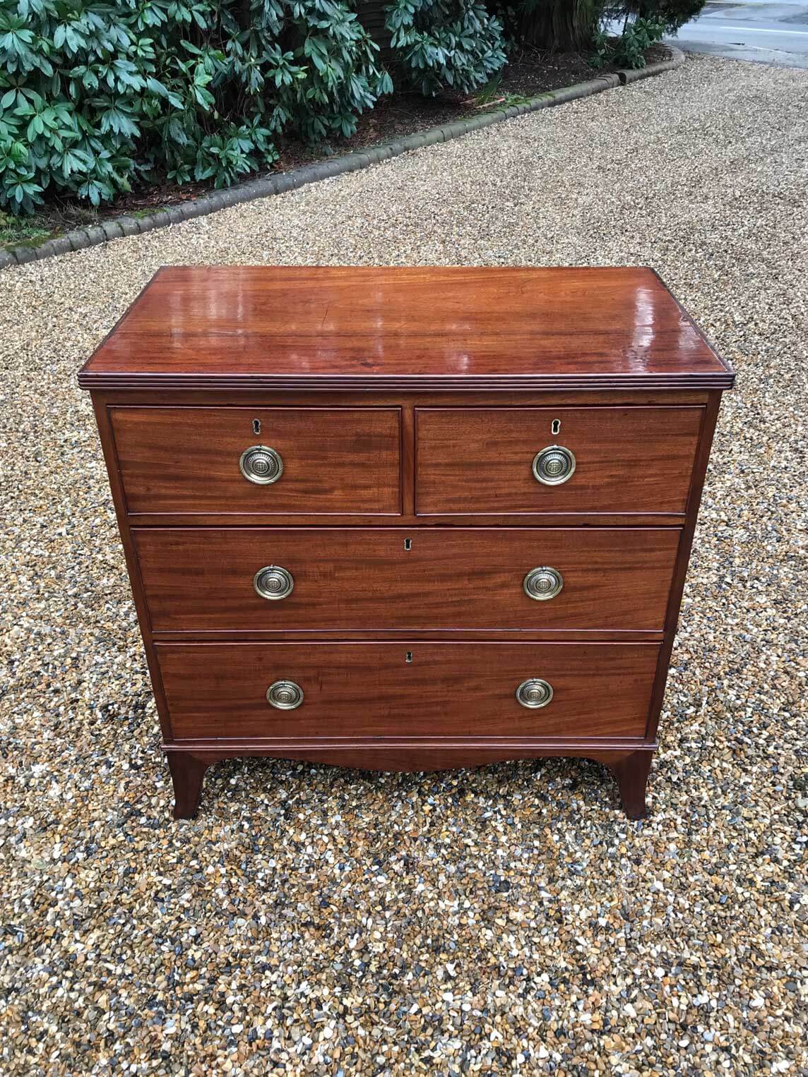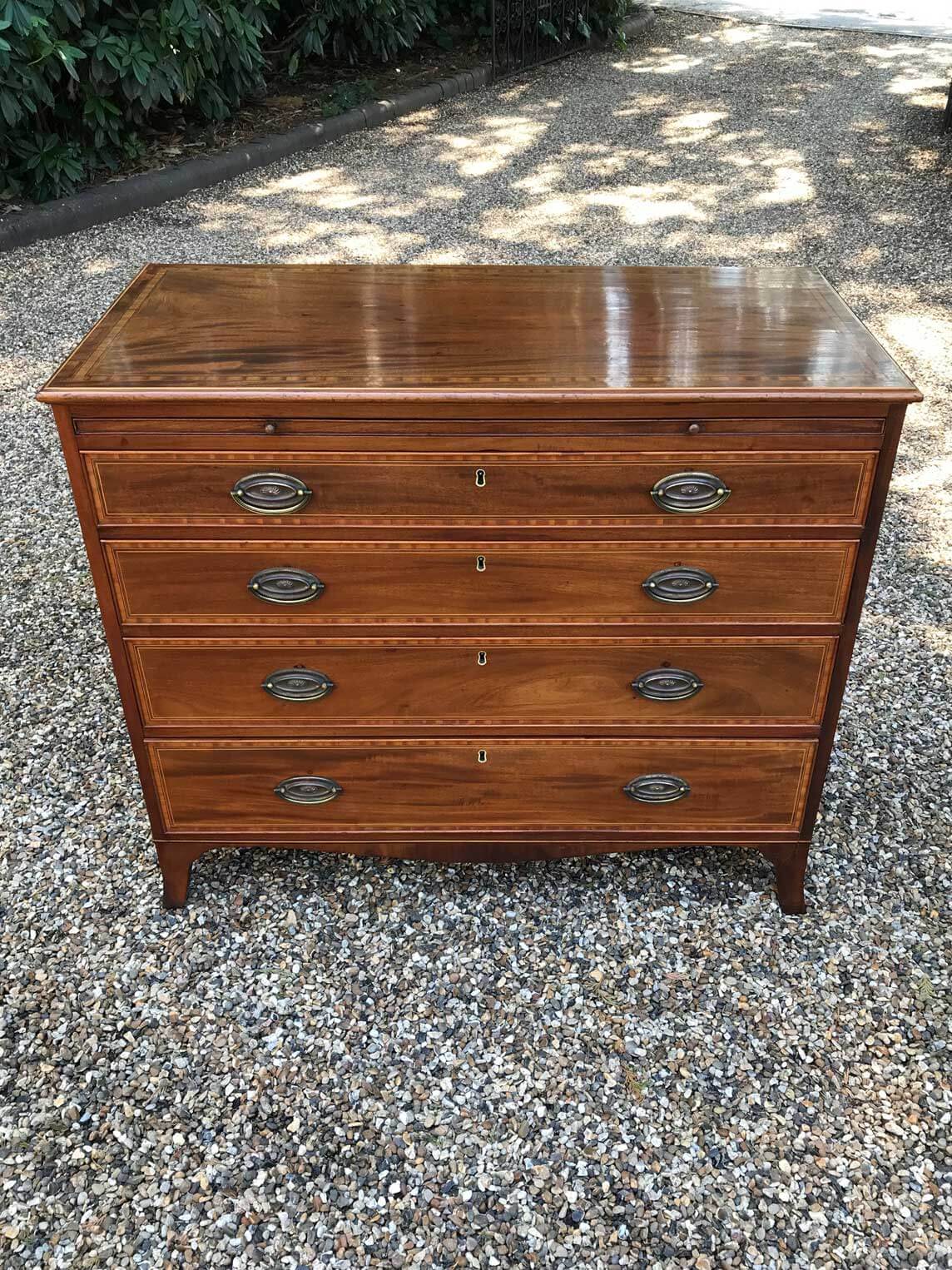 A good quality18th Century Georgian Mahogany Secretaire Chest of Drawers. The Secretaire has the fitted desk drawer over three long drawers and solid brass ring handles, with figured mahogany throughout. The interior has a green leather writing surface with ten strung drawers and eight pigeon holes. The chest stands on four ogee shaped feet and has a moulded edge to…