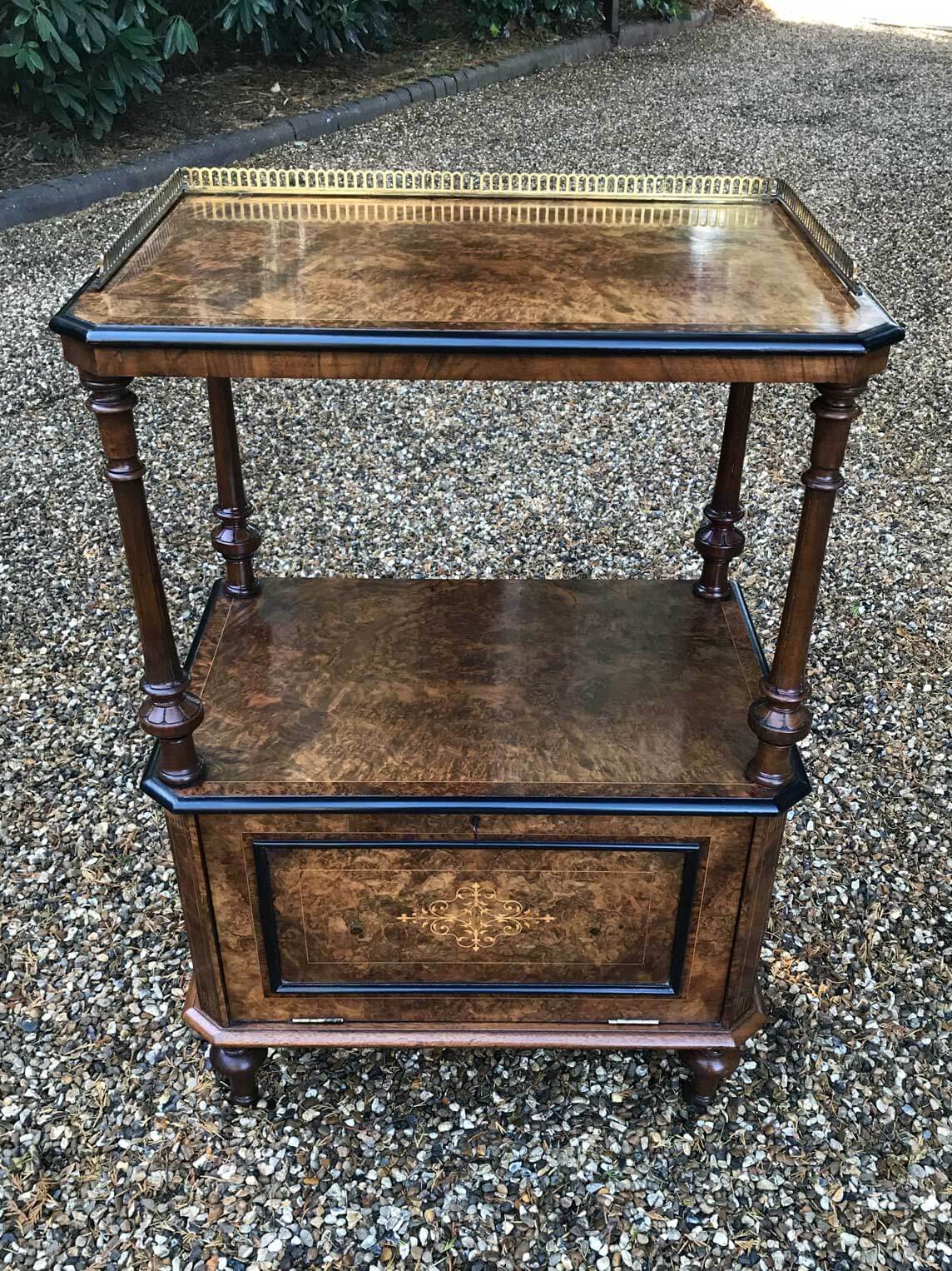 A very high quality Regency Burr Walnut Whatnot / Etagere, with brass gallery on top and 2 tiers raised on turned columns and cupboard on the base, all standing on turned legs terminating in castors. Circa: 1820 – 1830 Dimensions: Width:  24 inches –  61 cms Height:  36.5 inches –  93 cms Depth:  16 inches –  41 cms Reference: WNET1801 POA