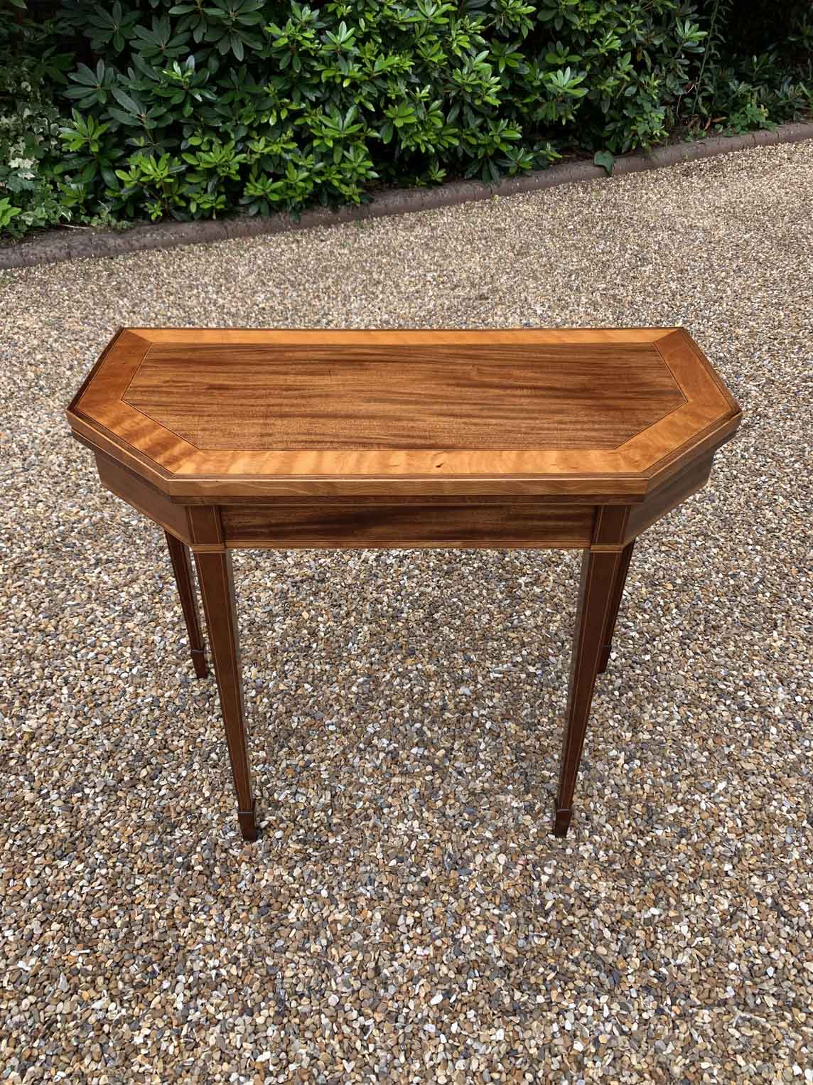 George III Mahogany & Satinwood fold-over card table with cross banding throughout, on square tapering legs with green baize inside. Circa: 1820 / 1830 Dimensions: Height: 29 inches – 73 cms Width: 35 inches – 89 cms Depth: 17.5 inches – 45 cms Reference: CT2006 POA