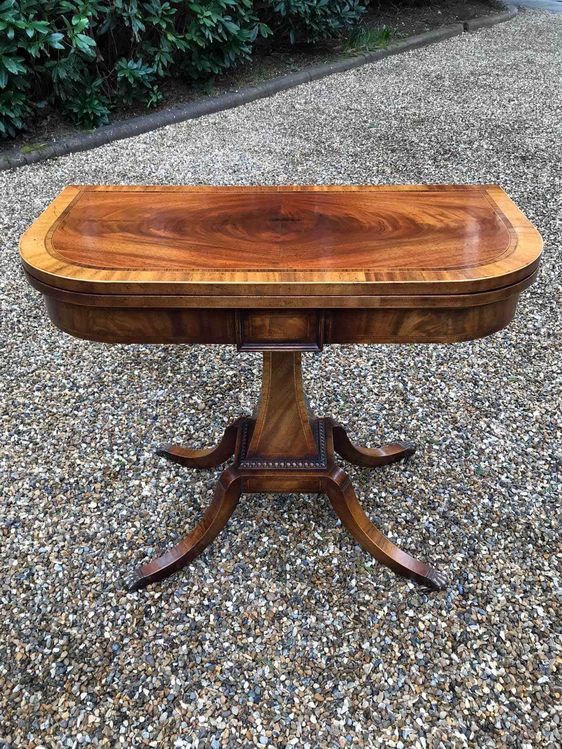 An original 19th Century Regency Inlaid Crossbanded D Shaped Mahogany Card Table with baize interior. Raised on a tempered chamfered column and splayed leg supports ending with brass claw feet and castors. The top swivels open to become a card table. Circa: 1830 Dimensions: Height: 31 inches – 78 cms Width: 36 inches – 91 cms Depth: 18 inches –…