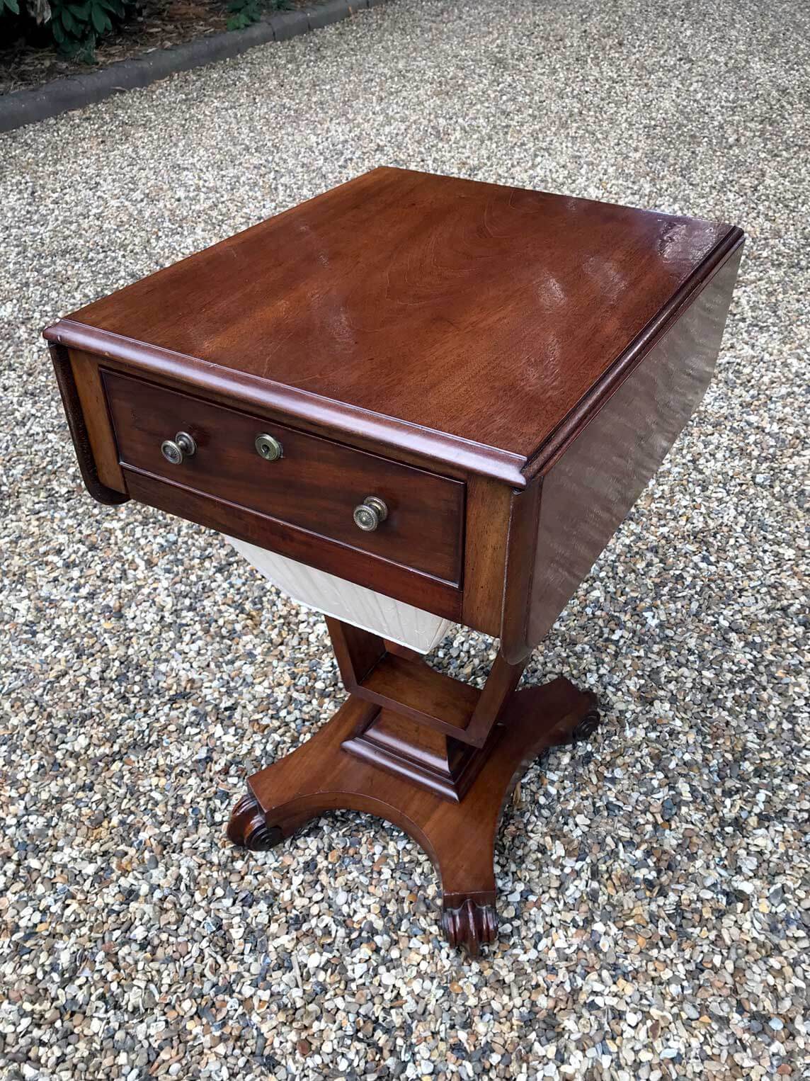 A William IV Mahogany Drop Leaf Work Table, fitted with a drawer and well, on a platform base Circa: 1837 Dimensions: Width: 17.5 inches – 44 cms Width Open: 31 inches – 79 cms Height: 28.5 inches – 72 cms Depth: 21 inches – 53 cms Reference: DLWT1801 POA
