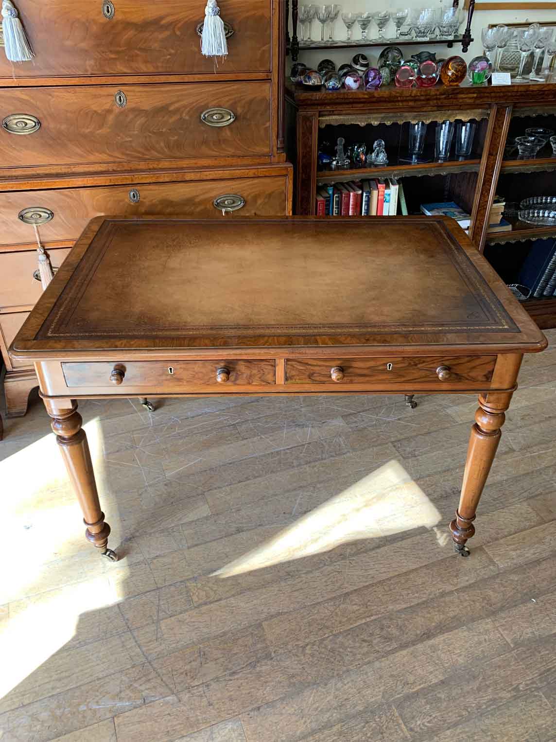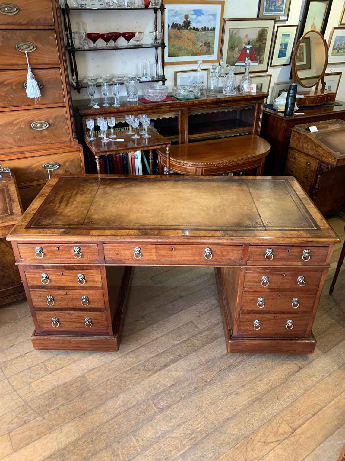 19th Century Walnut Pedestal Desk. The front has nine drawers with brass lion ring handles. A newly leathered writing surface on top. Comes apart in three separate sections with key. Circa: 1870 Dimensions: Height: 29 inches – 75 cms Width: 60 inches – 153 cms Depth: 29 inches – 75 cms Reference: CP2006 POA
