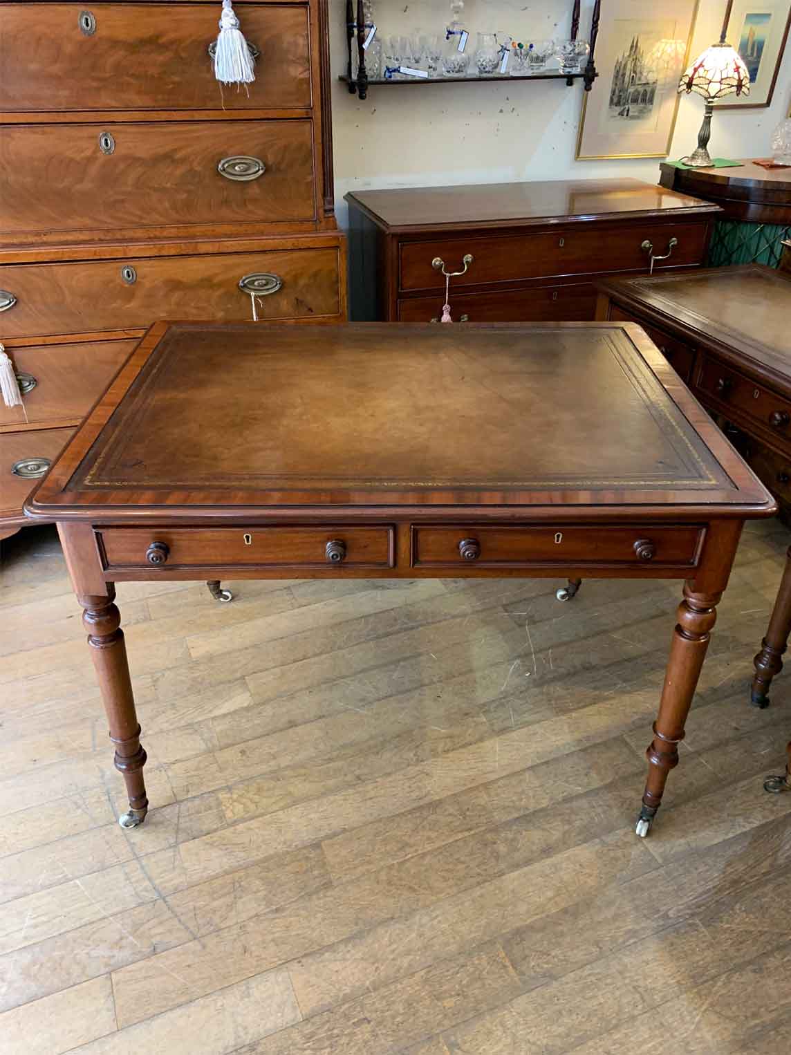 Victorian Mahogany Writing Table with cabinet maker James Shoolbred stamp est.1820 (jas shoolbred & co) and a tooled leathered writing surface, two fitted mahogany drawers with key on turned supports and castors. Circa: 1860 Dimensions: Width:  36 inches – 91 cms Height: 30 inches – 76 cms Depth: 22 inches – 55 cms Reference: WT2003…