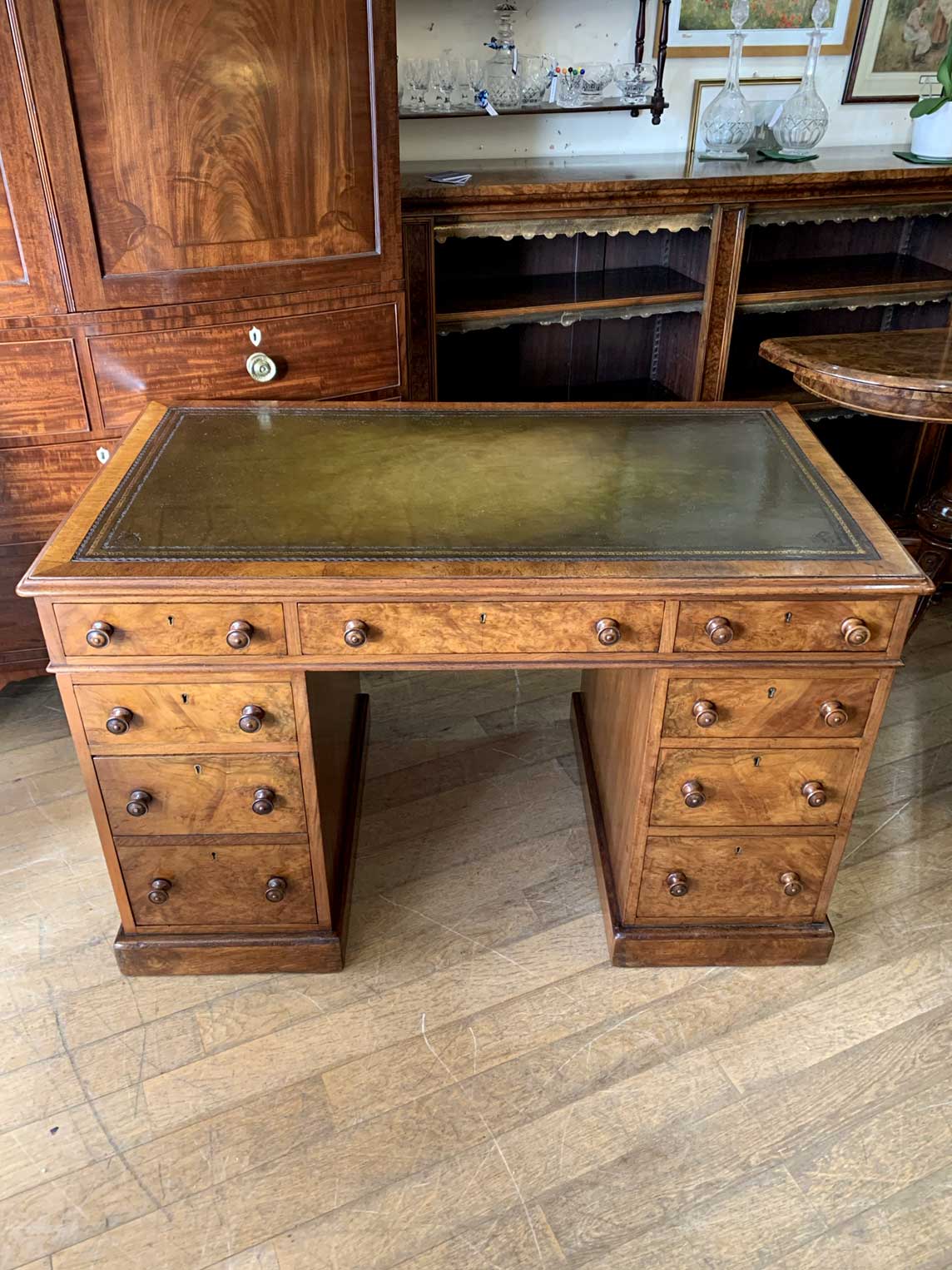 19th Century Walnut Pedestal Desk with tooled leathered writing surface. Nine drawers with turned bun handles on plinth base. Comes apart in three separate sections. Circa: 1870 Dimensions: Width:  48 inches – 122 cms Height: 30.5 inches – 77 cms Depth:  27 inches – 69 cms Reference: D2005 POA