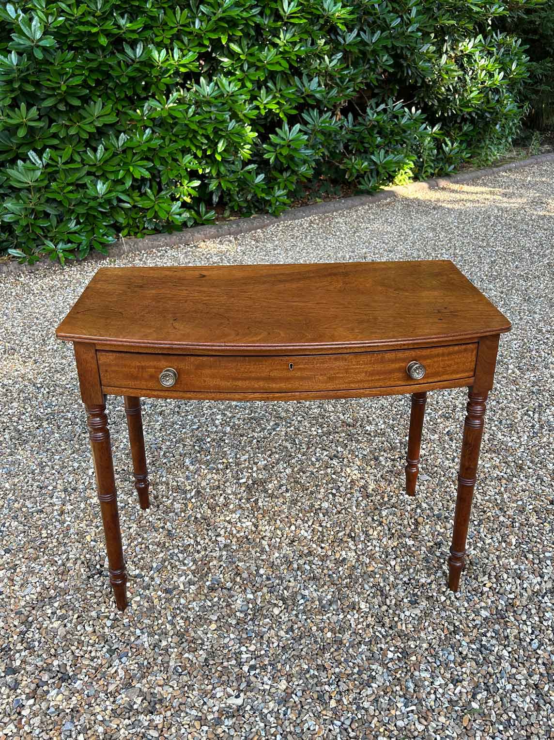 19th Century Georgian Mahogany Bow-Fronted Side Table with single mahogany drawer, round brass ring handles with working key. Circa: 1850 Dimensions: Height: 28 inches – 71 cms Width: 35 inches – 81 cms Depth: 18 inches – 46 cms Reference: ST2304 POA