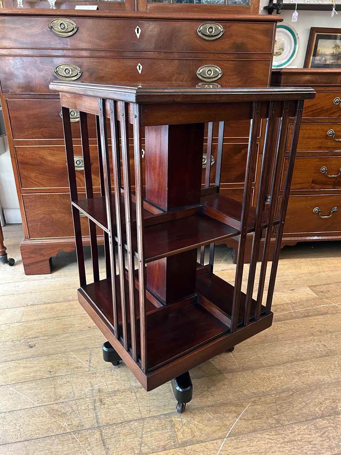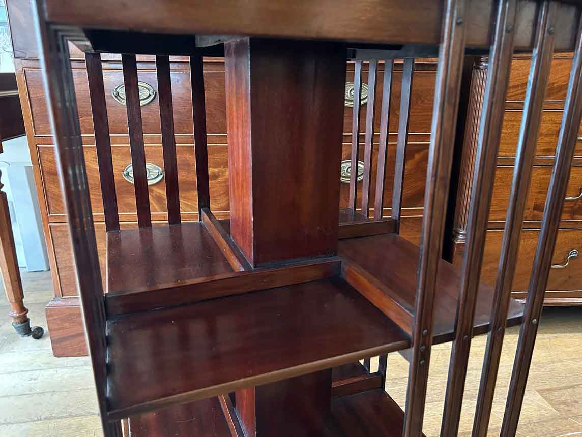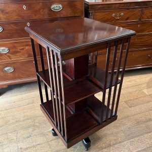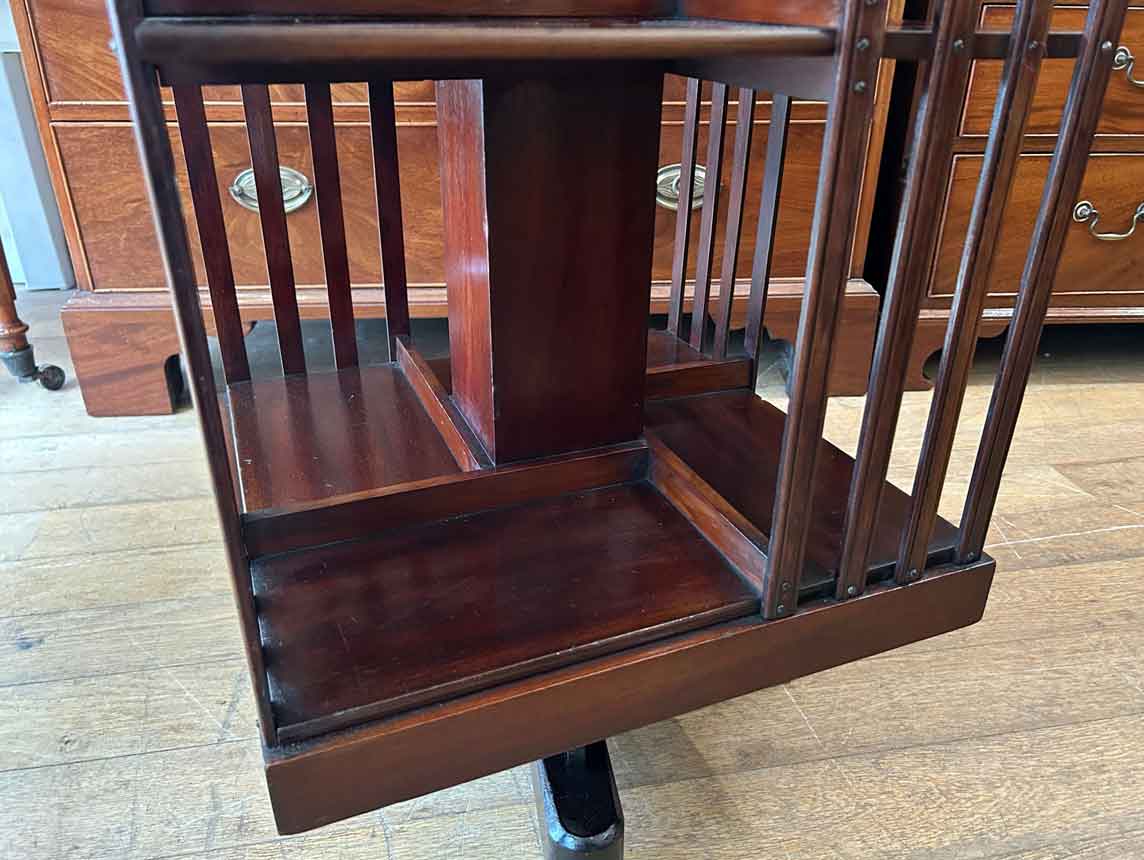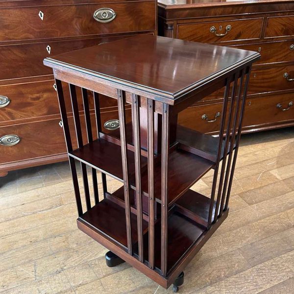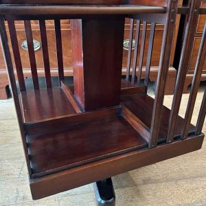 19th Century Victorian Mahogany Revolving Bookcase has two tiers of book storage and four vertical mahogany slats to each side and the revolving platform base.