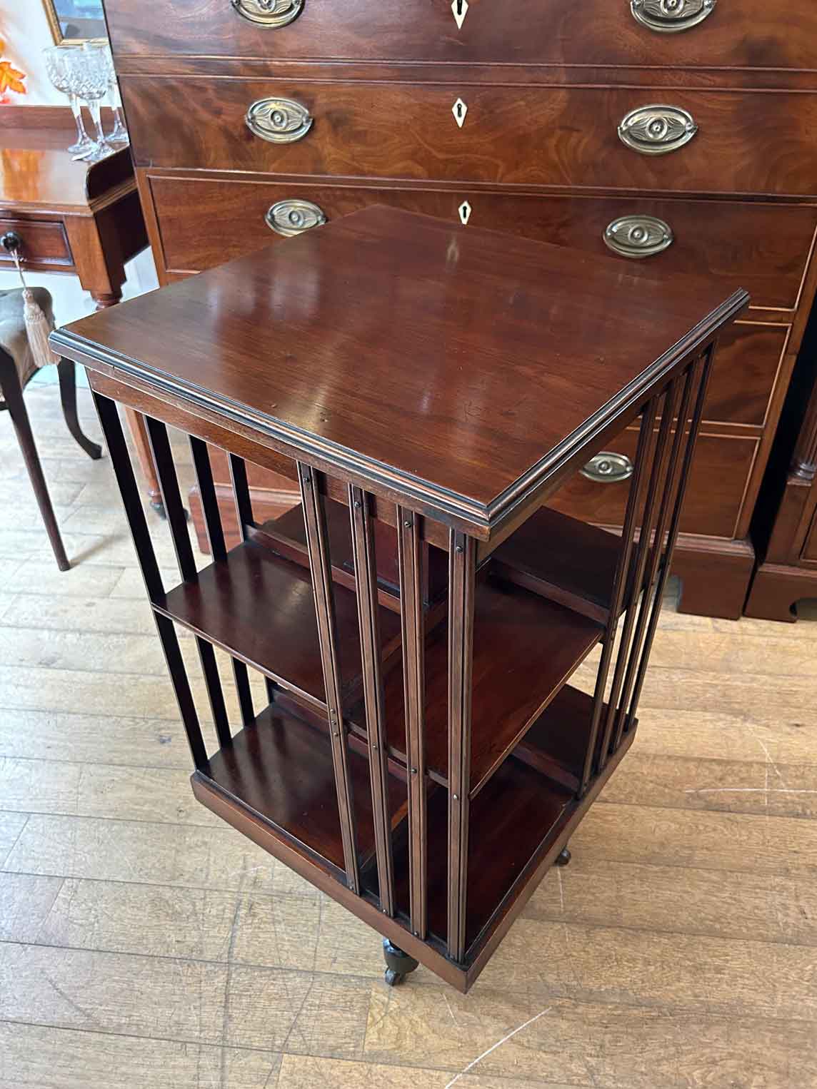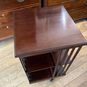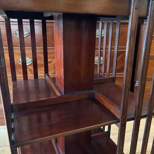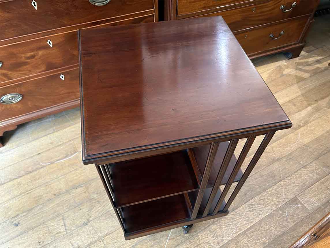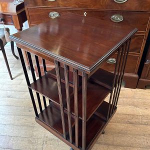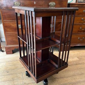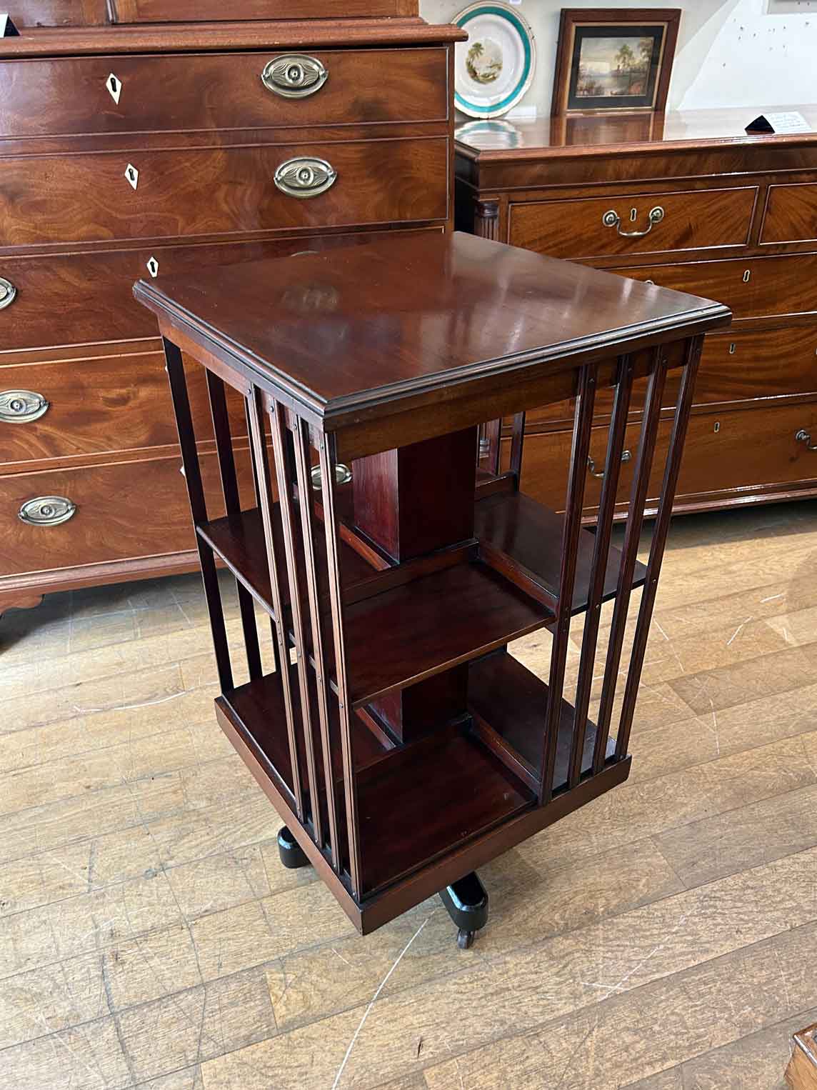 19th Century Victorian Mahogany Revolving Bookcase has two tiers of book storage and four vertical mahogany slats to each side and the revolving platform base.