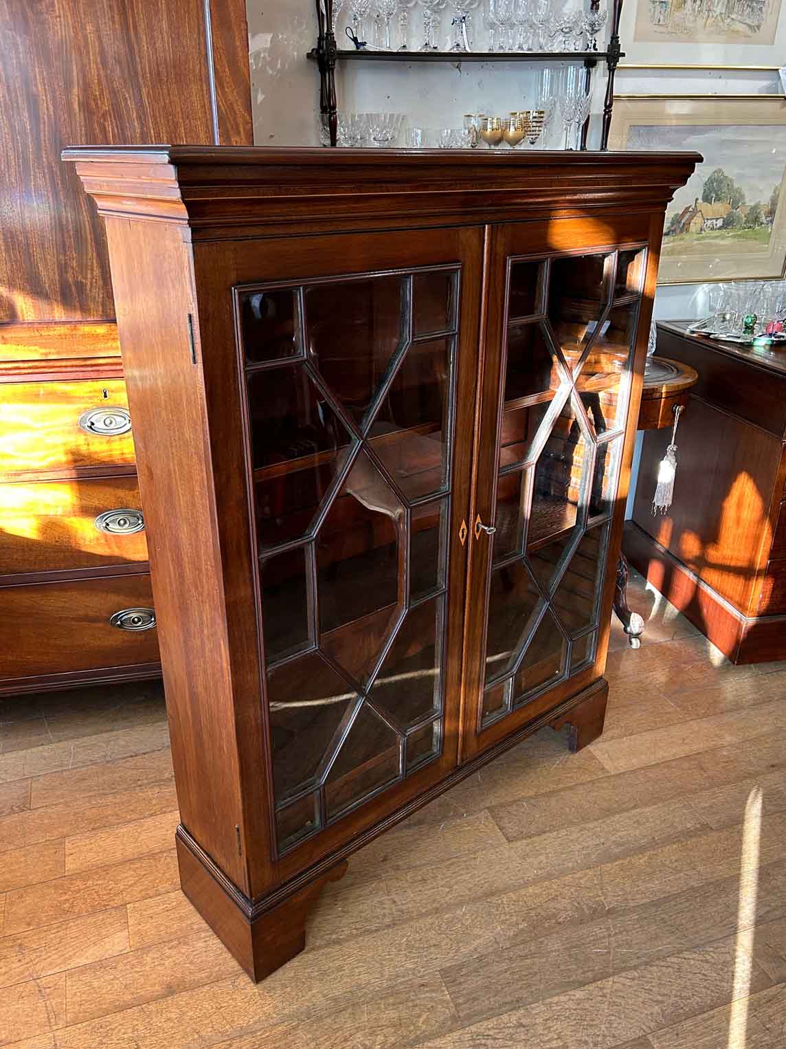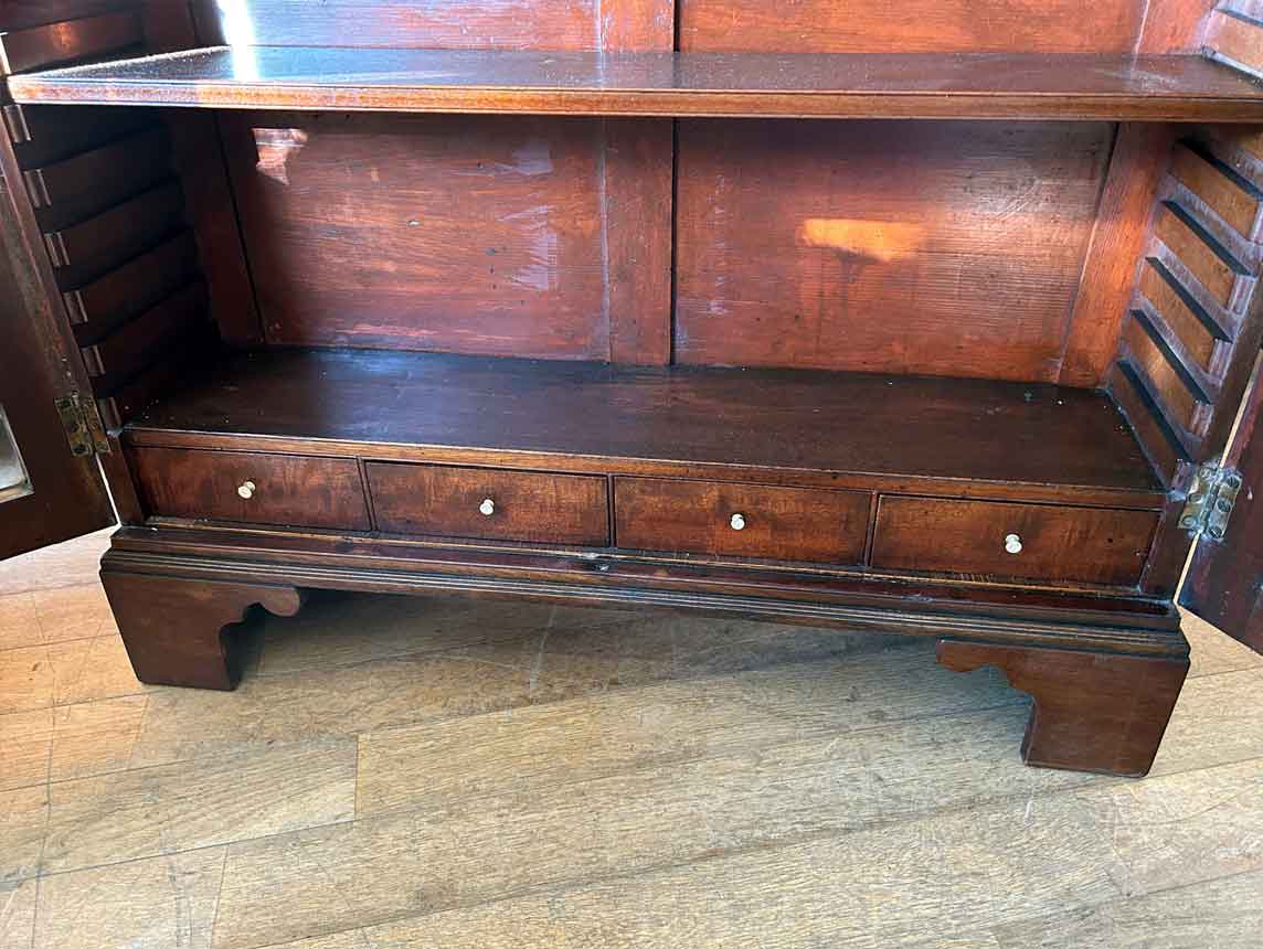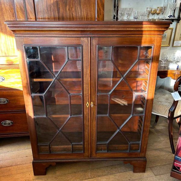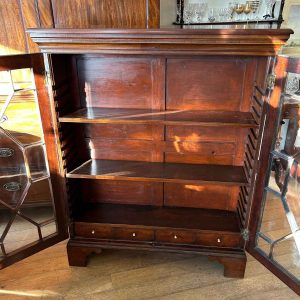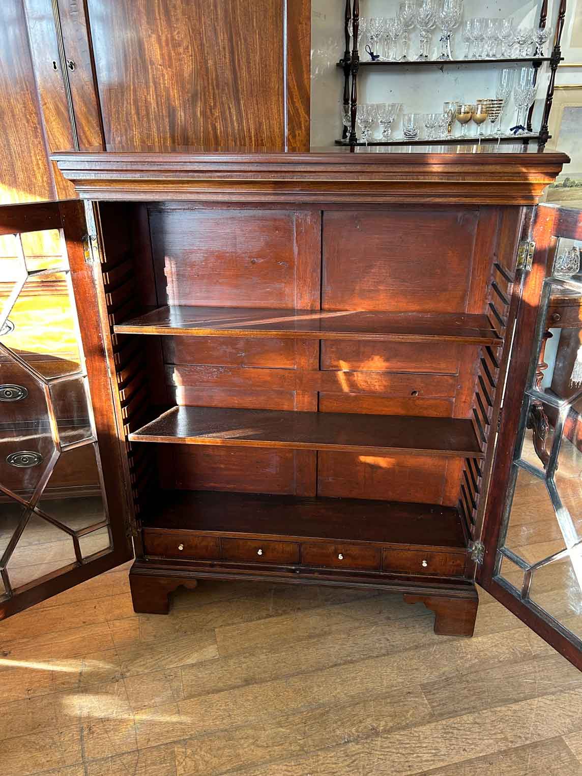 A high quality 19th Century Georgian Mahogany Bookcase with two original adjustable shelves, four small lower drawers, glazed doors with working key on bracket feet.