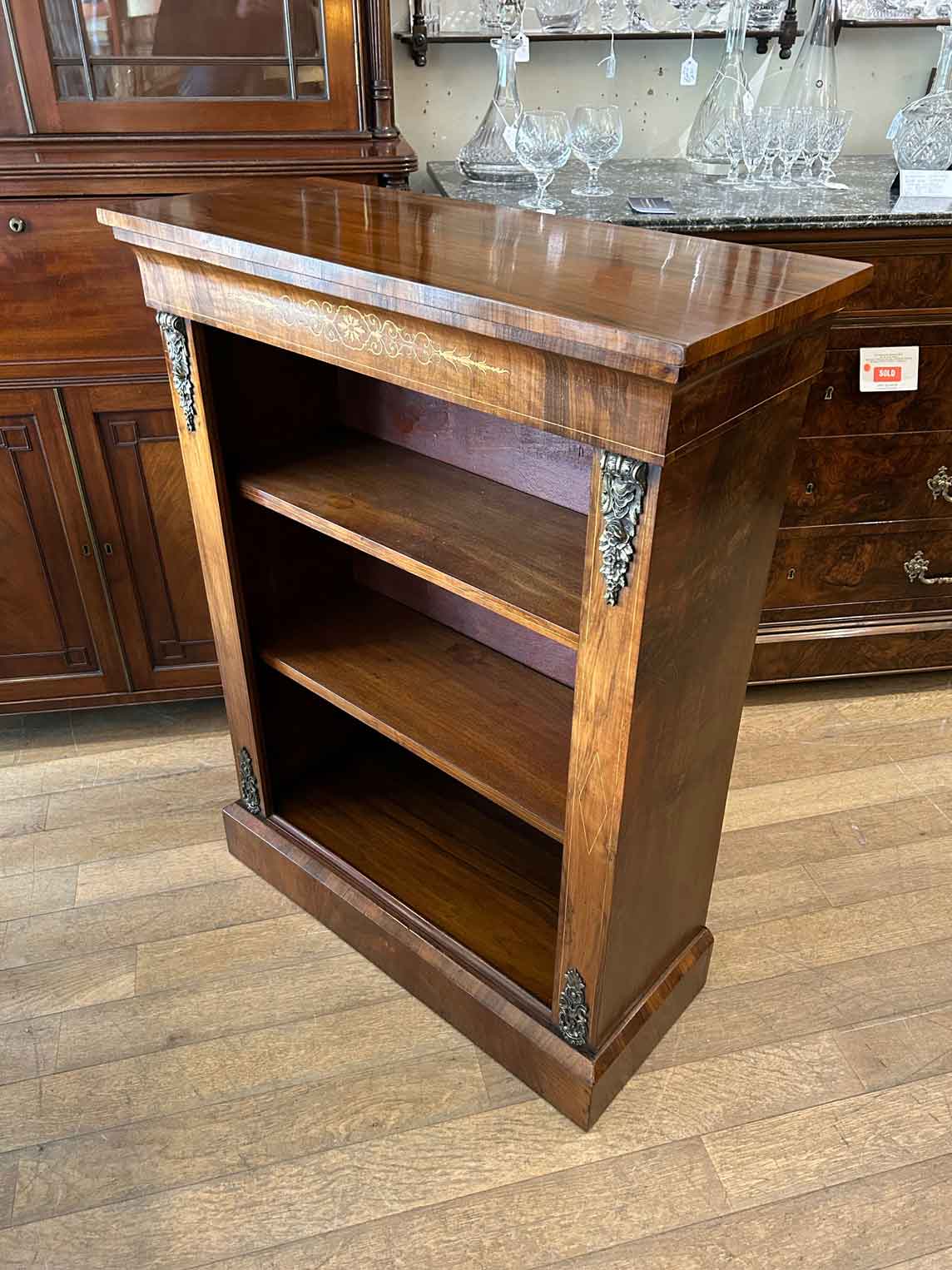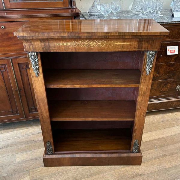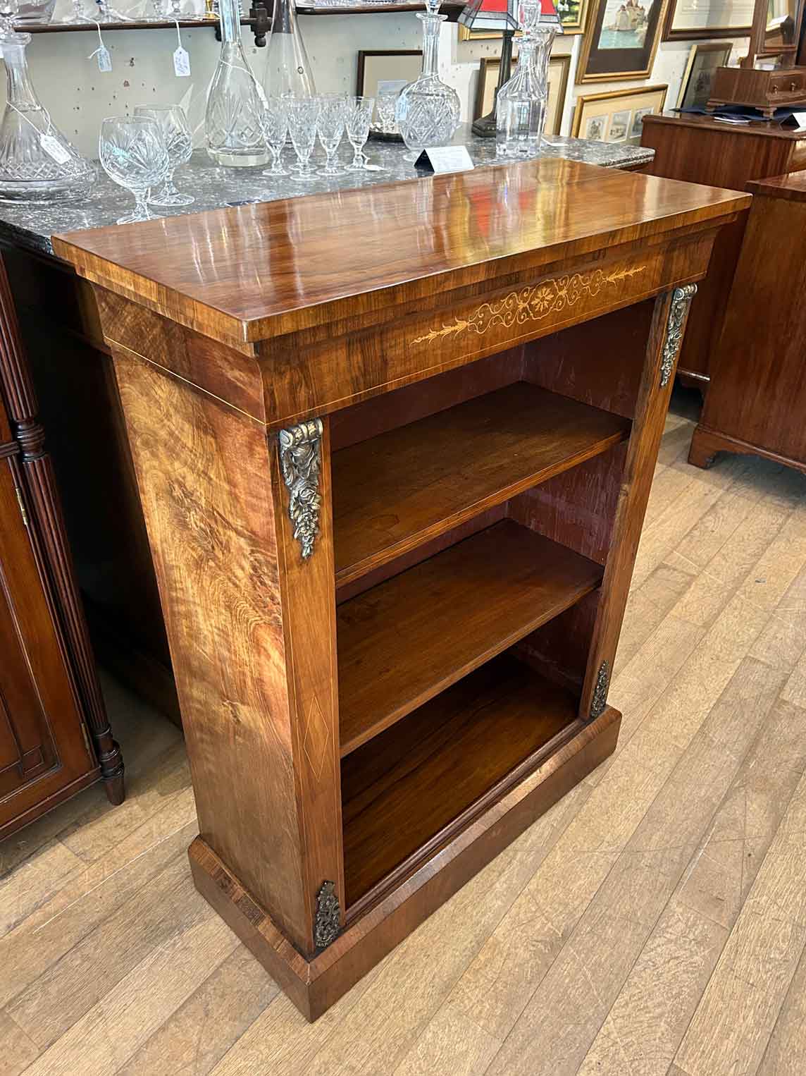 19th Century Victorian Burr Walnut Open Bookcase, with boxwood line inlay and ormolu mounts, two fitted shelves on a plinth base.