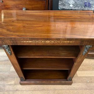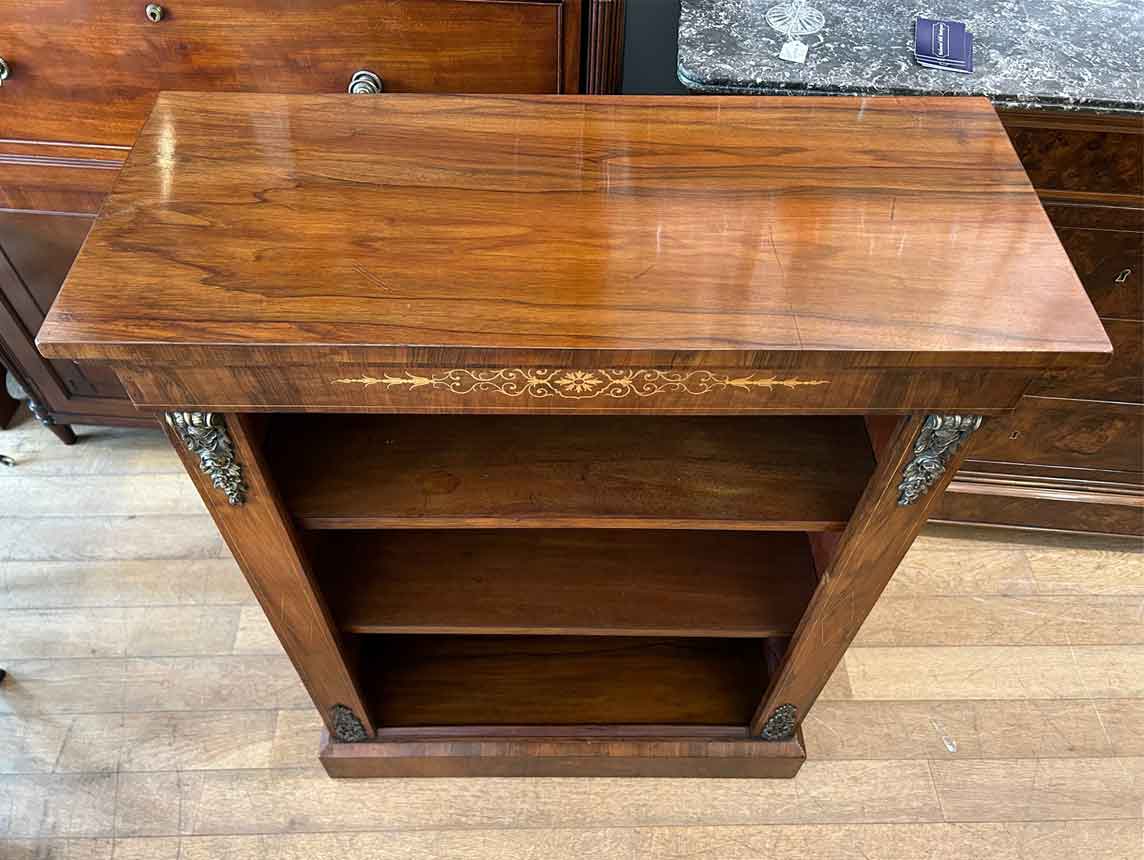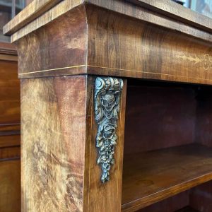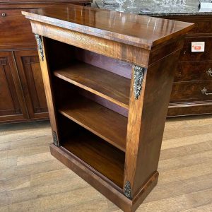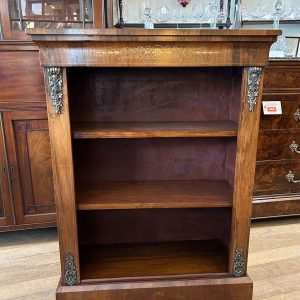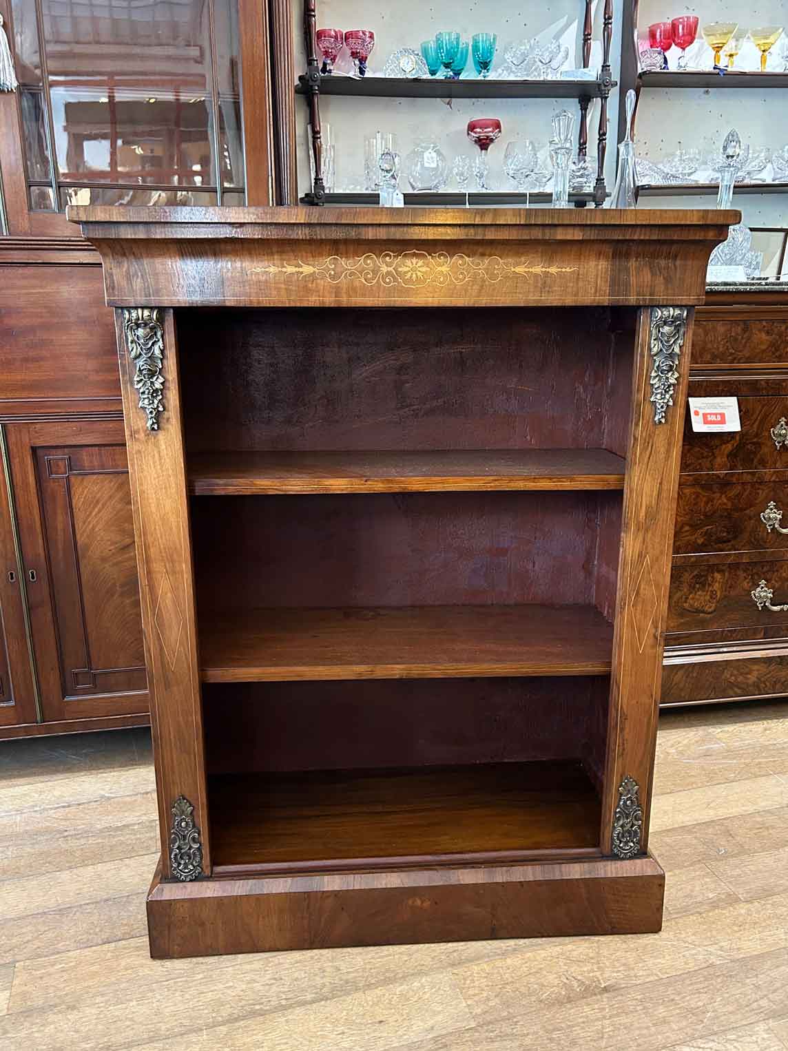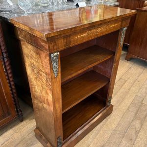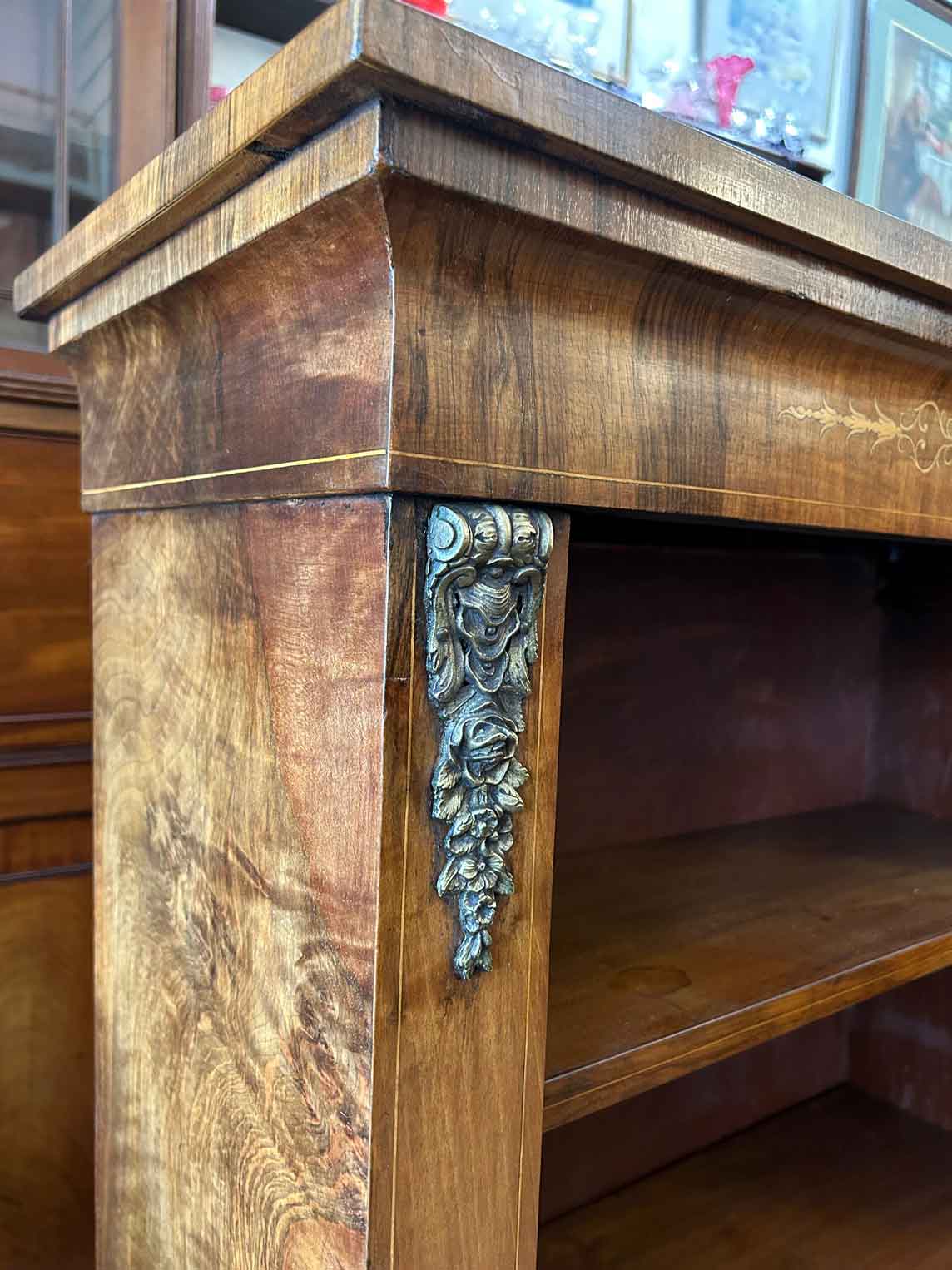 19th Century Victorian Burr Walnut Open Bookcase, with boxwood line inlay and ormolu mounts, two fitted shelves on a plinth base.