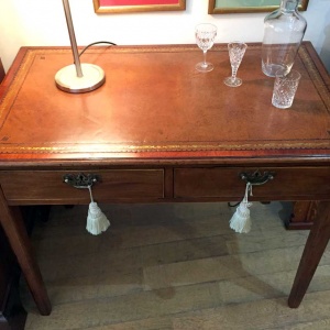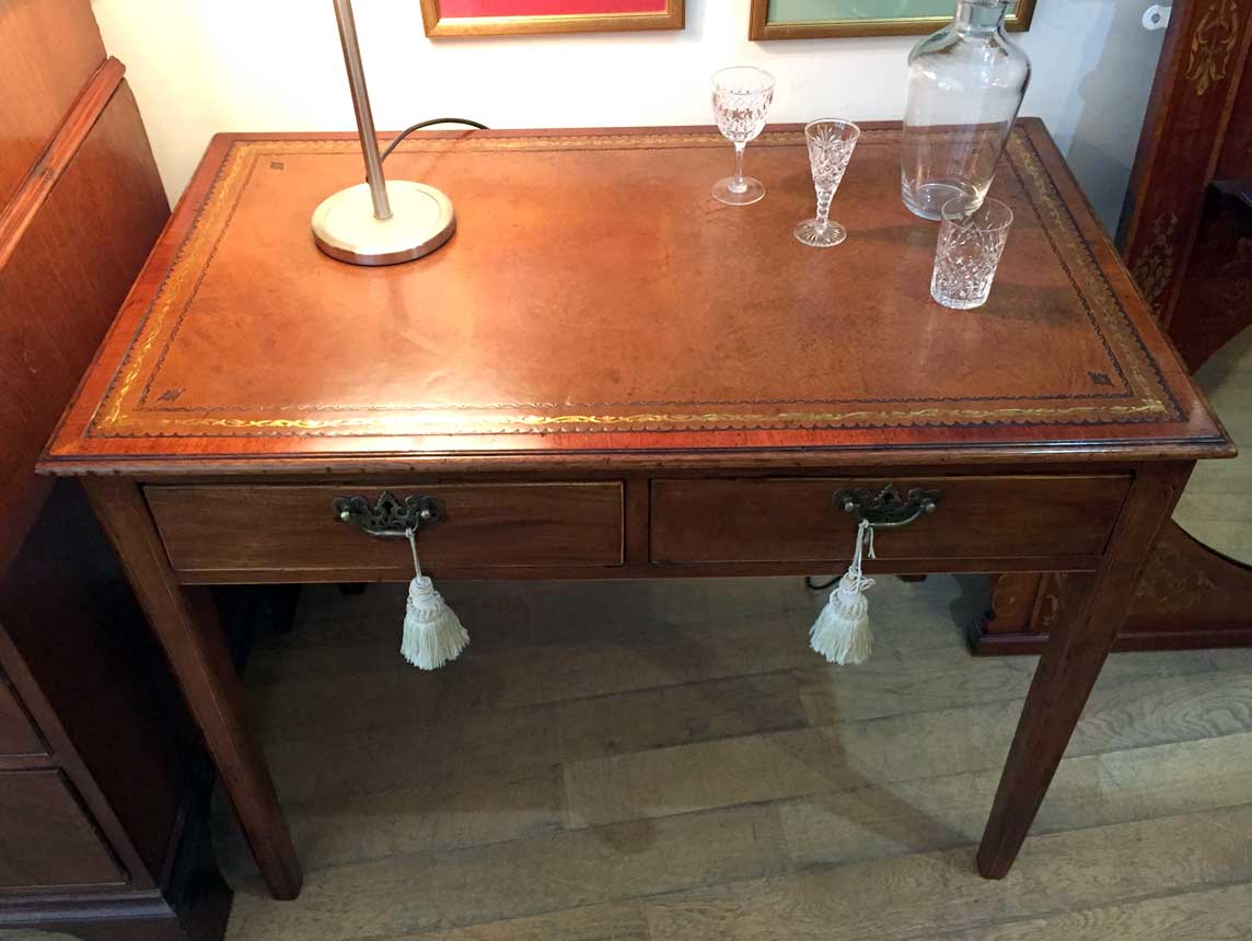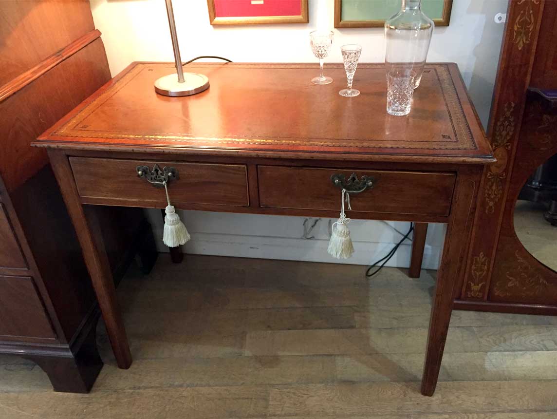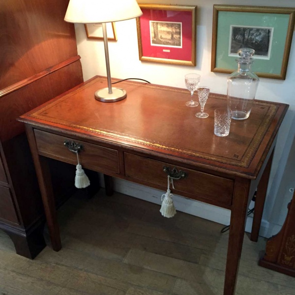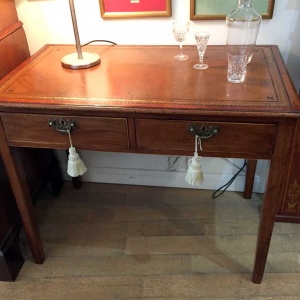 19th Century inlaid Mahogany Writing Table with leathered top and two drawers.