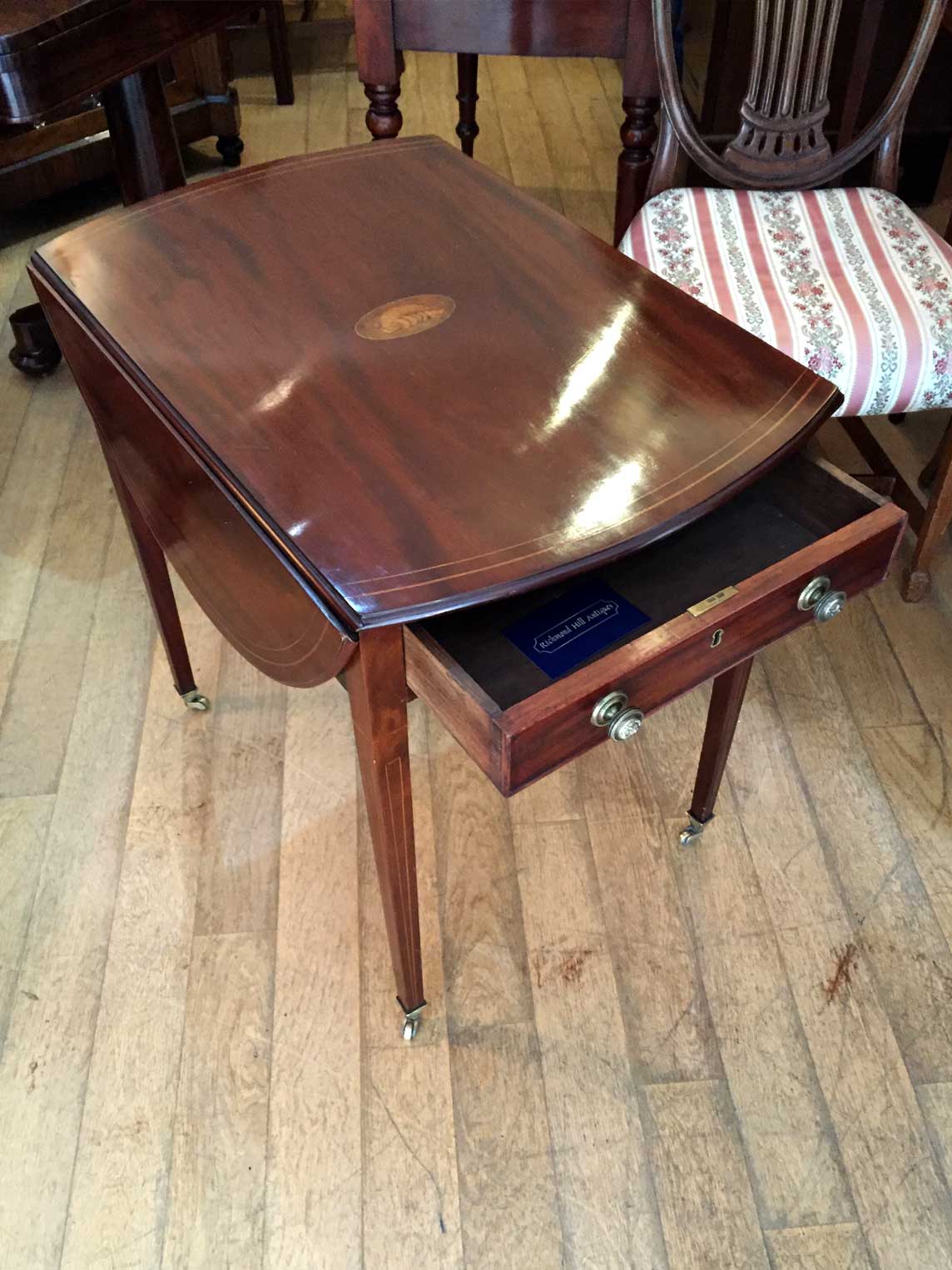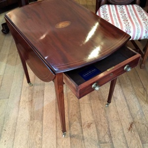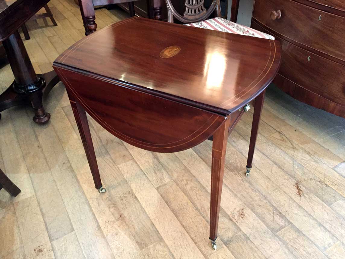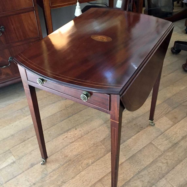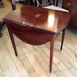 19th Century Georgian Mahogany Inlaid Pembroke Table with Drop Leaves and single Drawer. Standing on elegant inlaid tapering legs with original brass castors.