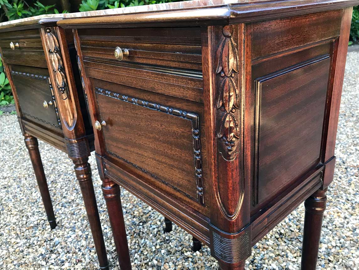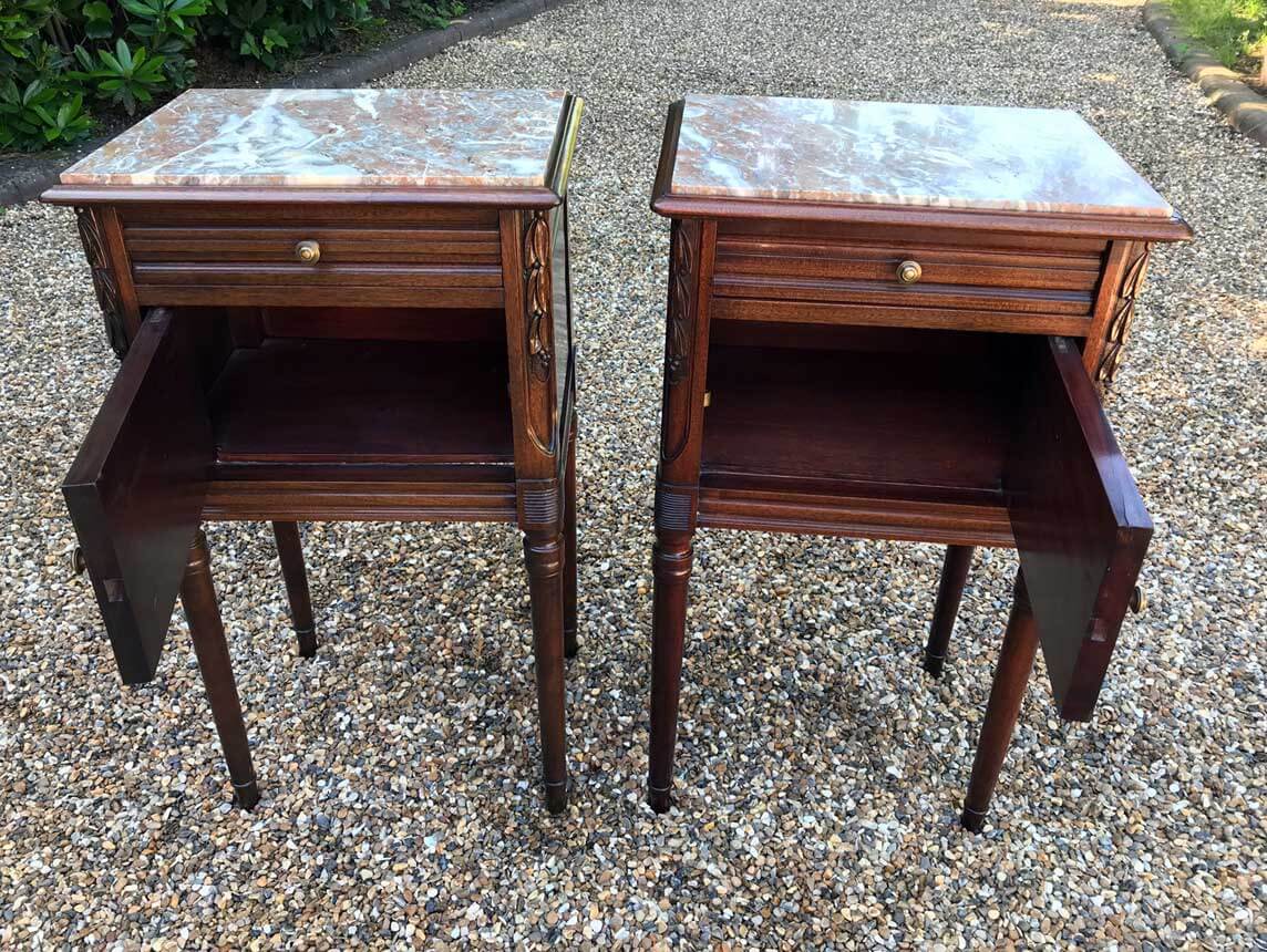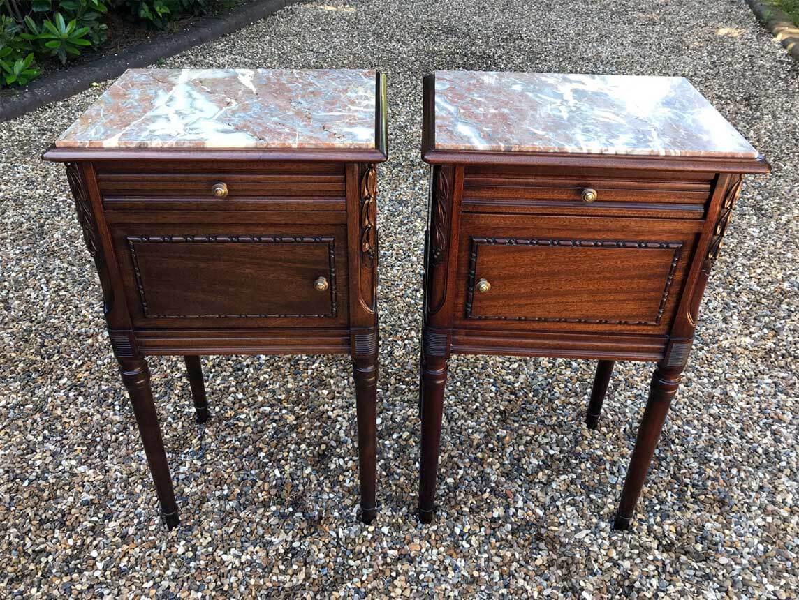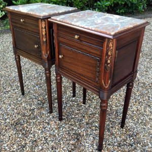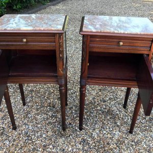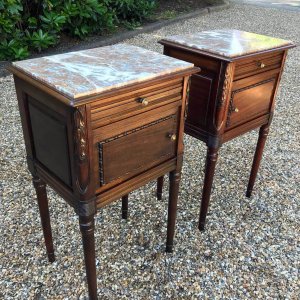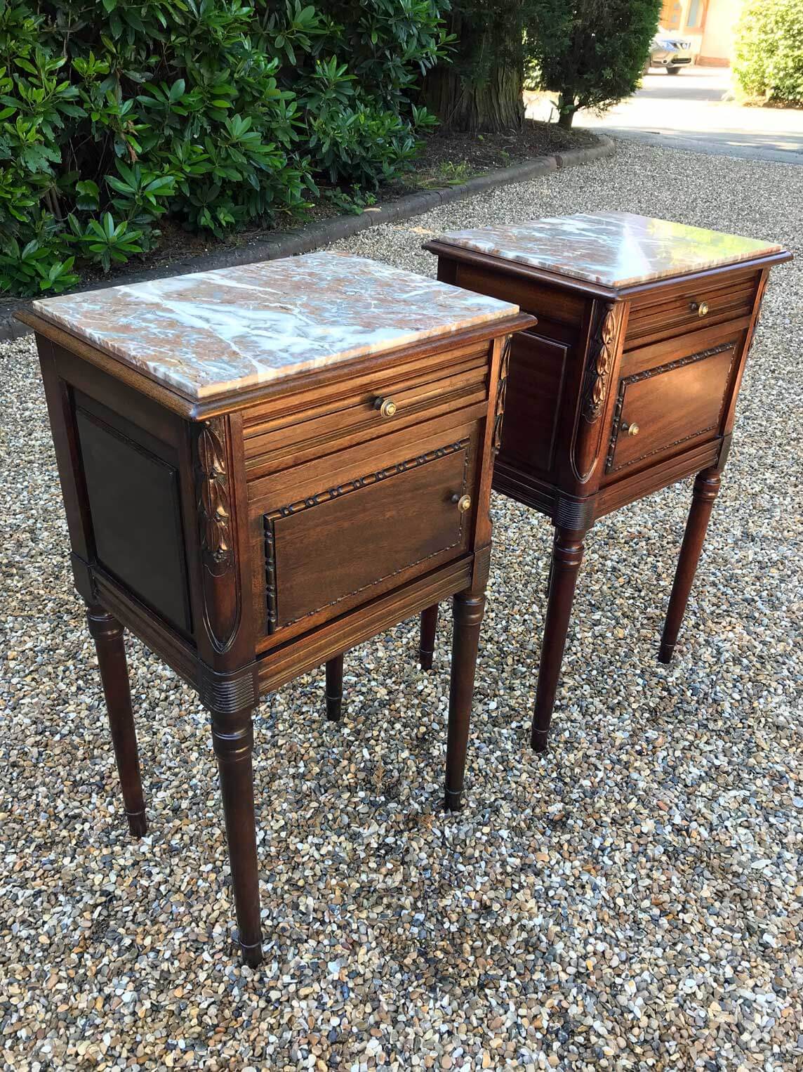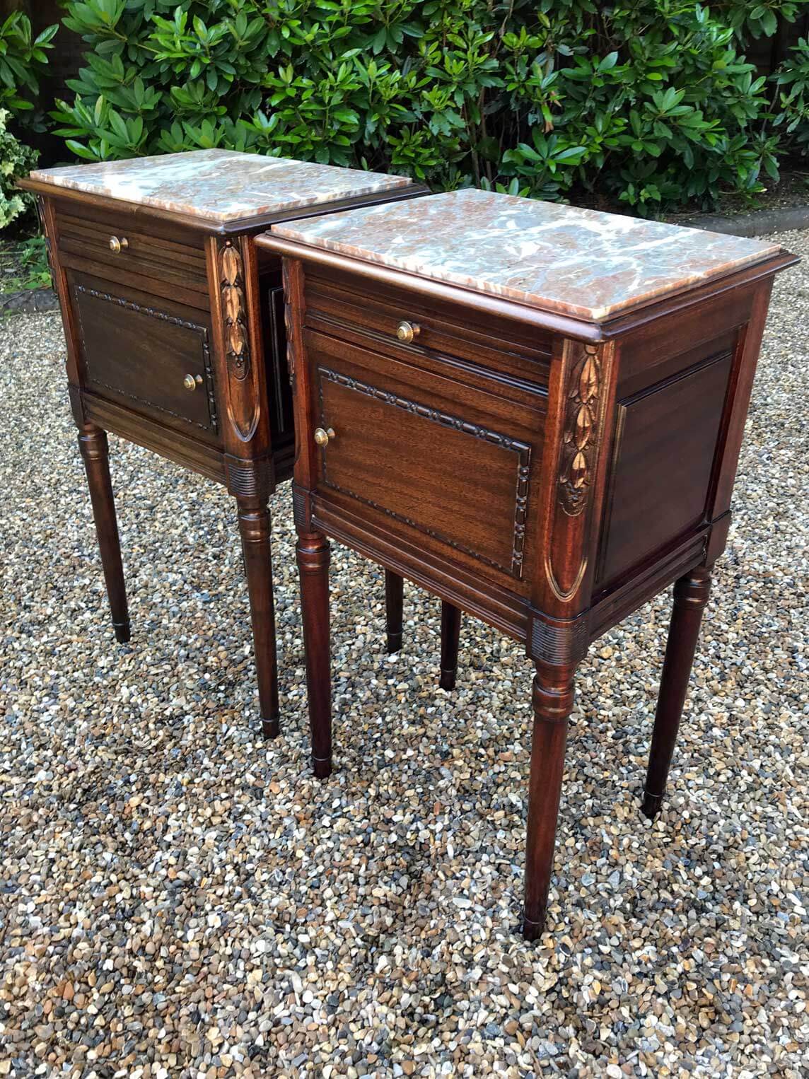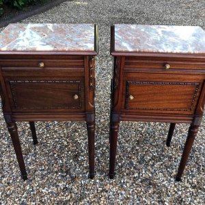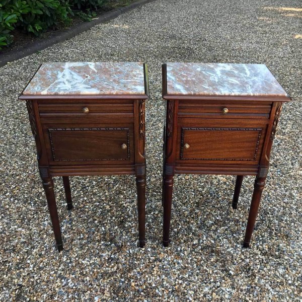 A Pair of Edwardian French Mahogany Bedside Tables each inset with Marble Tops, above a fitted drawer and door, raised on turned legs..