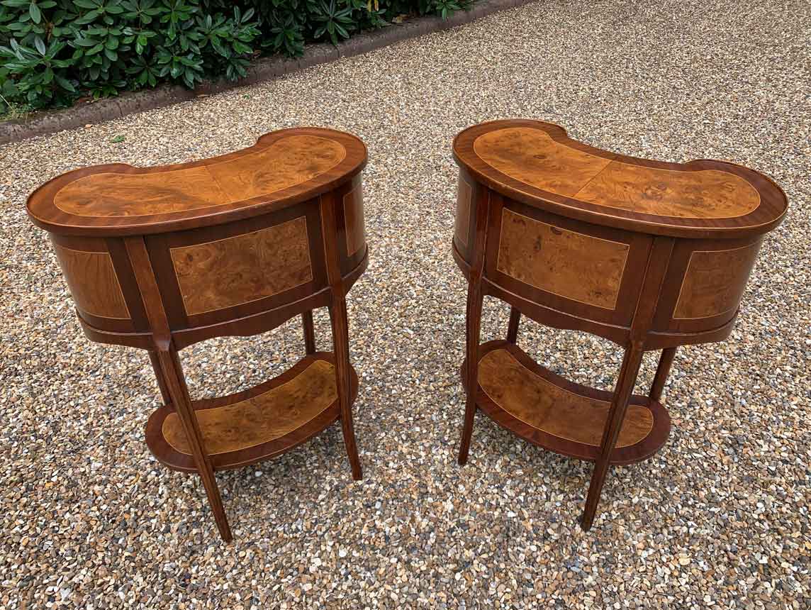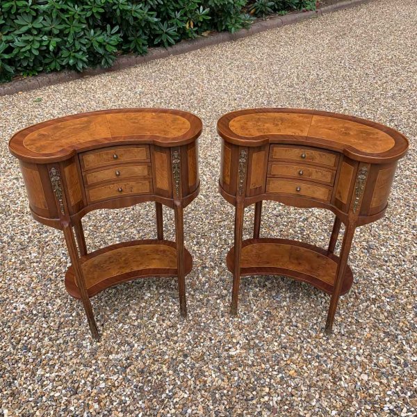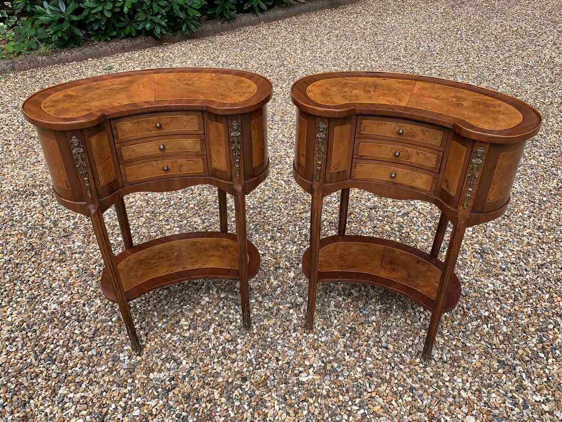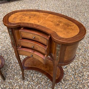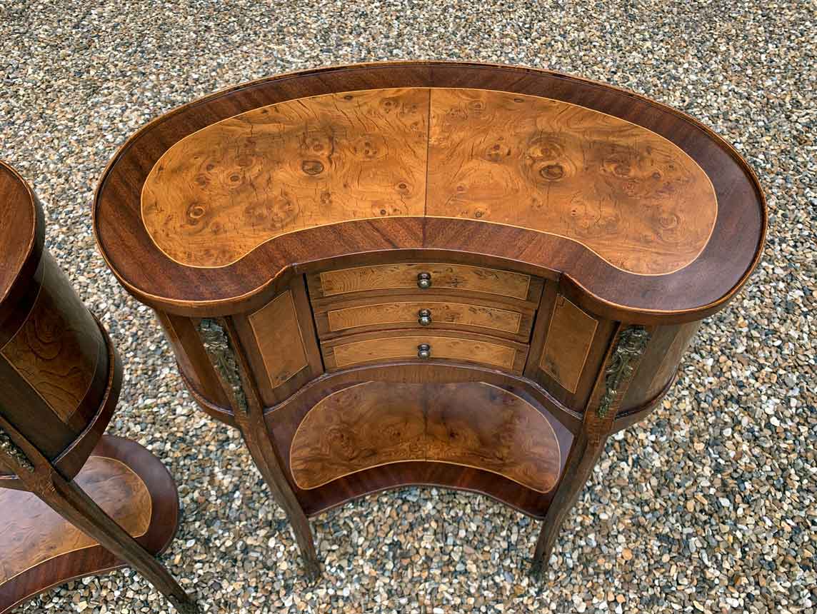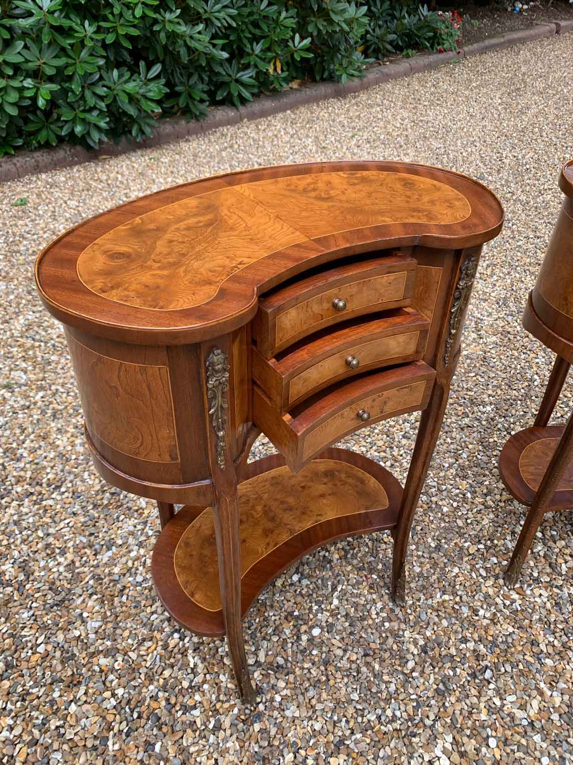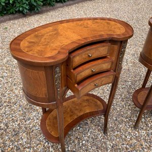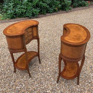 A pair of Edwardian Kidney Shaped Mahogany & Burr Walnut Bedside Tables above three fitted drawers, under-tier on shaped cabriole legs with brass mounts. Fitted with kidney shaped cut glass to protect the top veneer.
