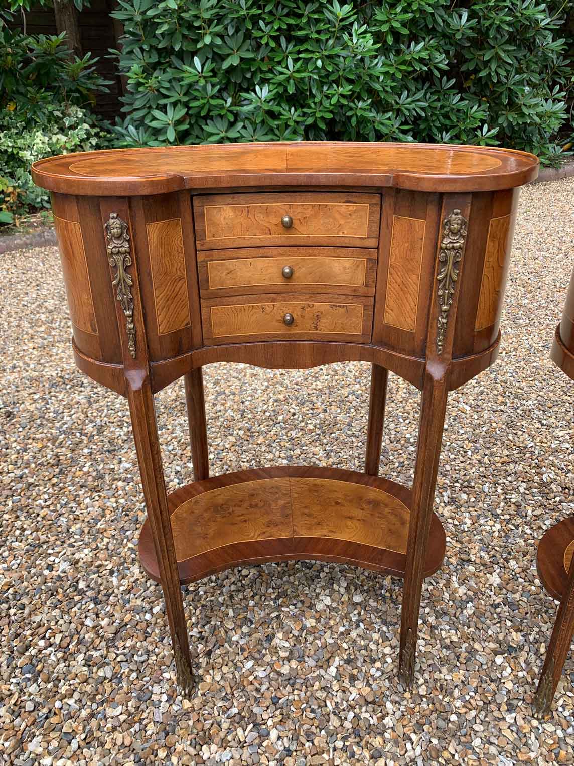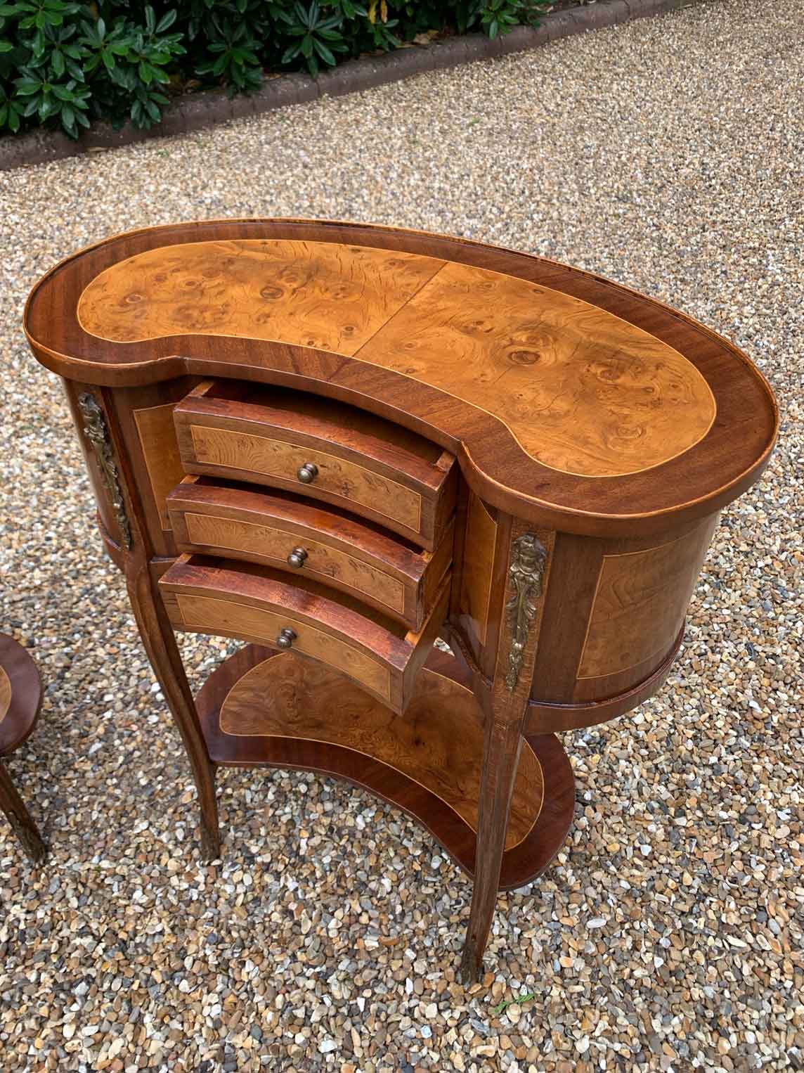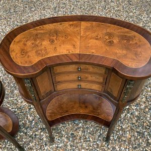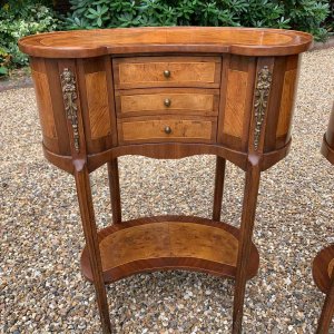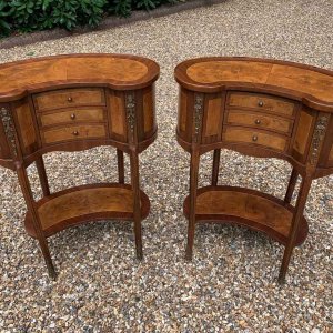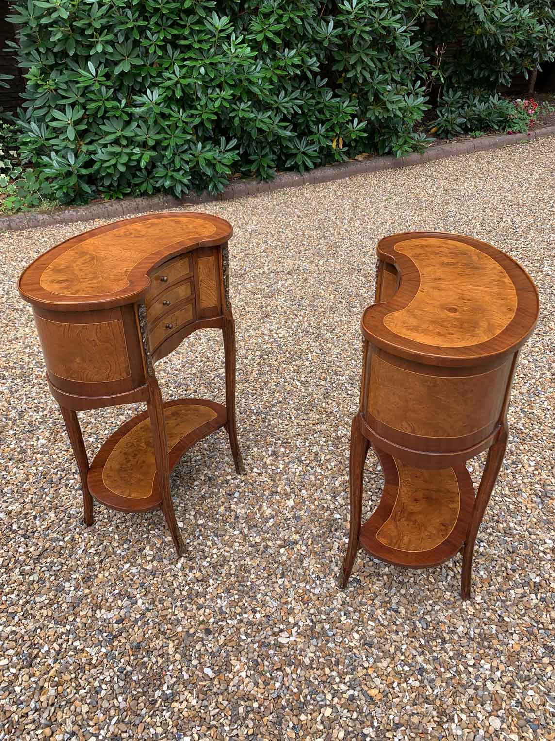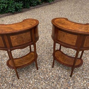 A pair of Edwardian Kidney Shaped Mahogany & Burr Walnut Bedside Tables above three fitted drawers, under-tier on shaped cabriole legs with brass mounts. Fitted with kidney shaped cut glass to protect the top veneer.