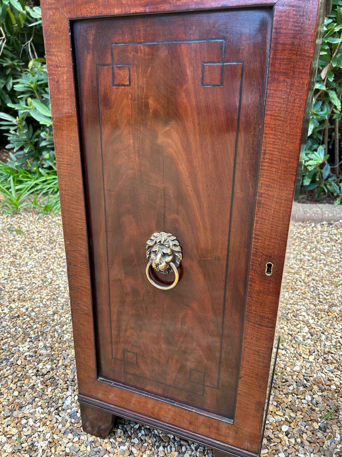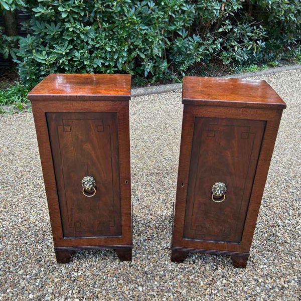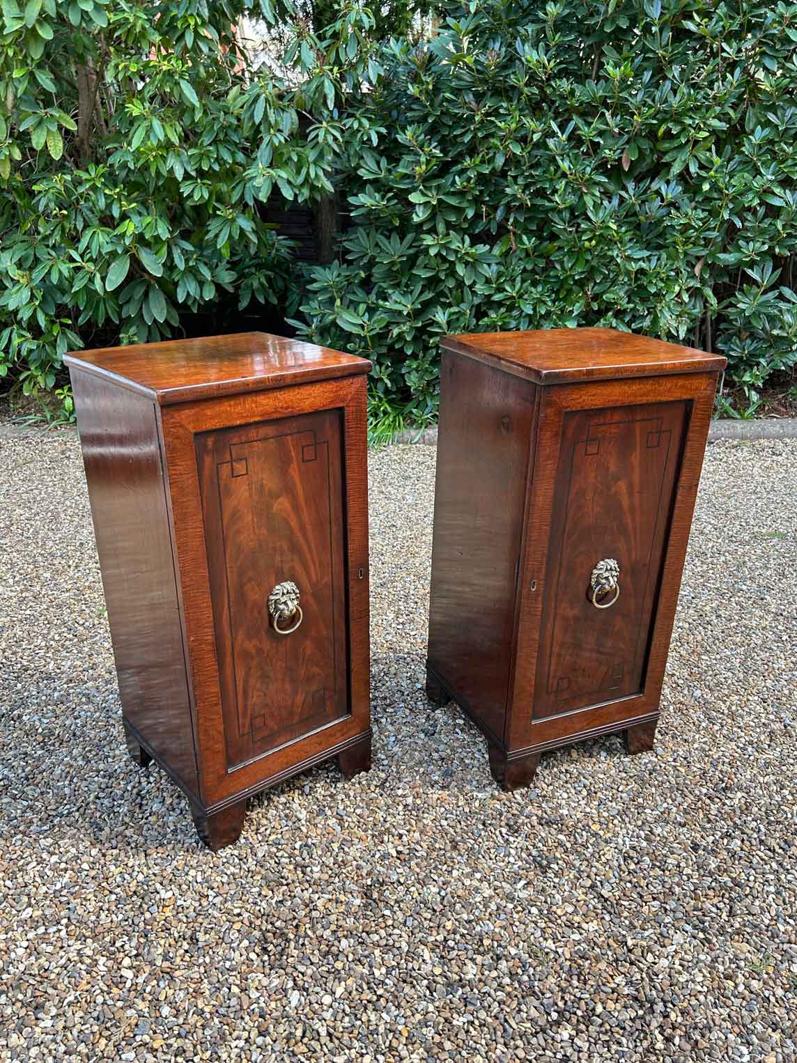 A pair of Regency Mahogany Cupboards with ebony inlay and original brass lion handles.