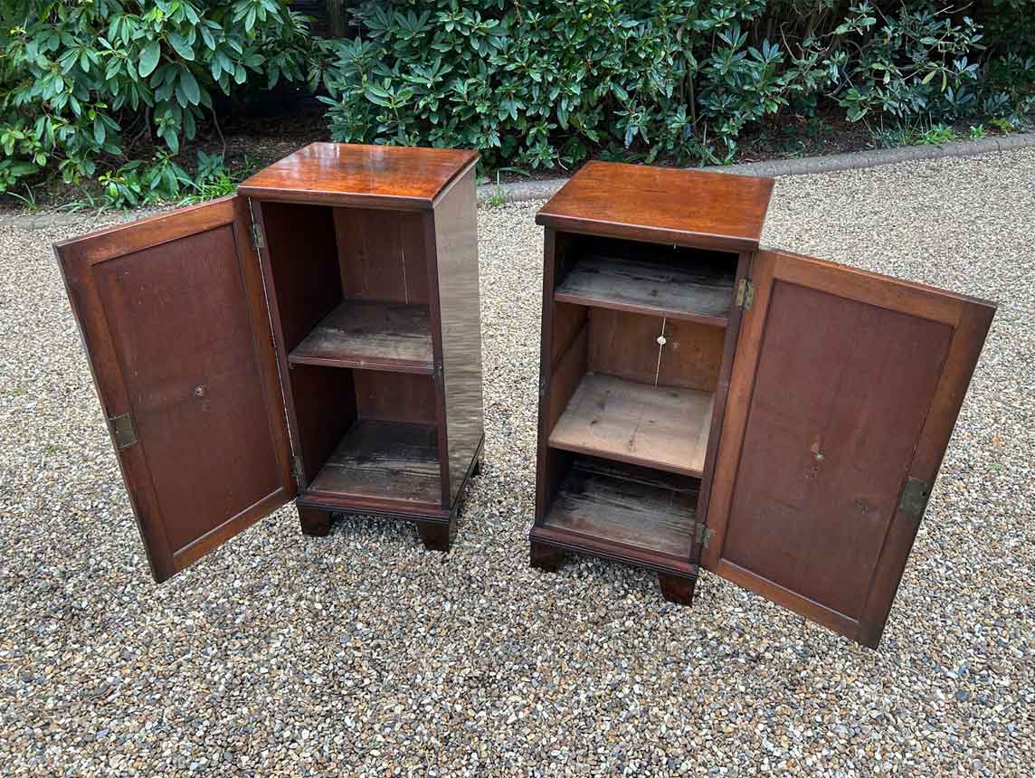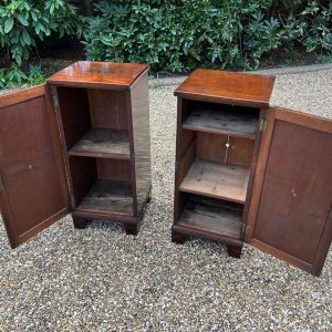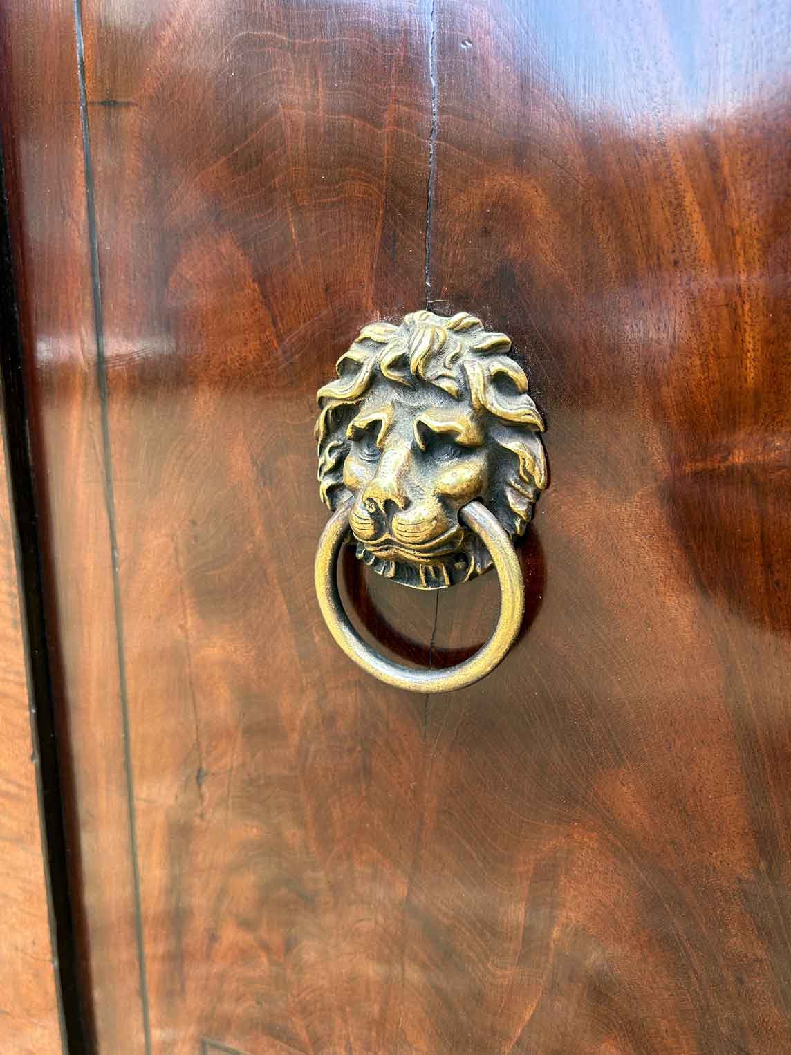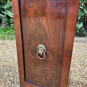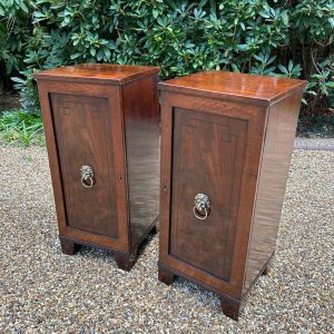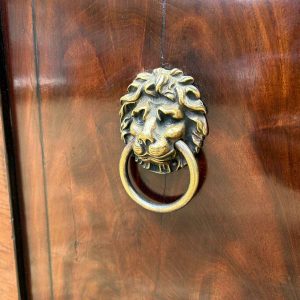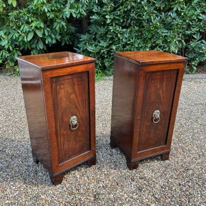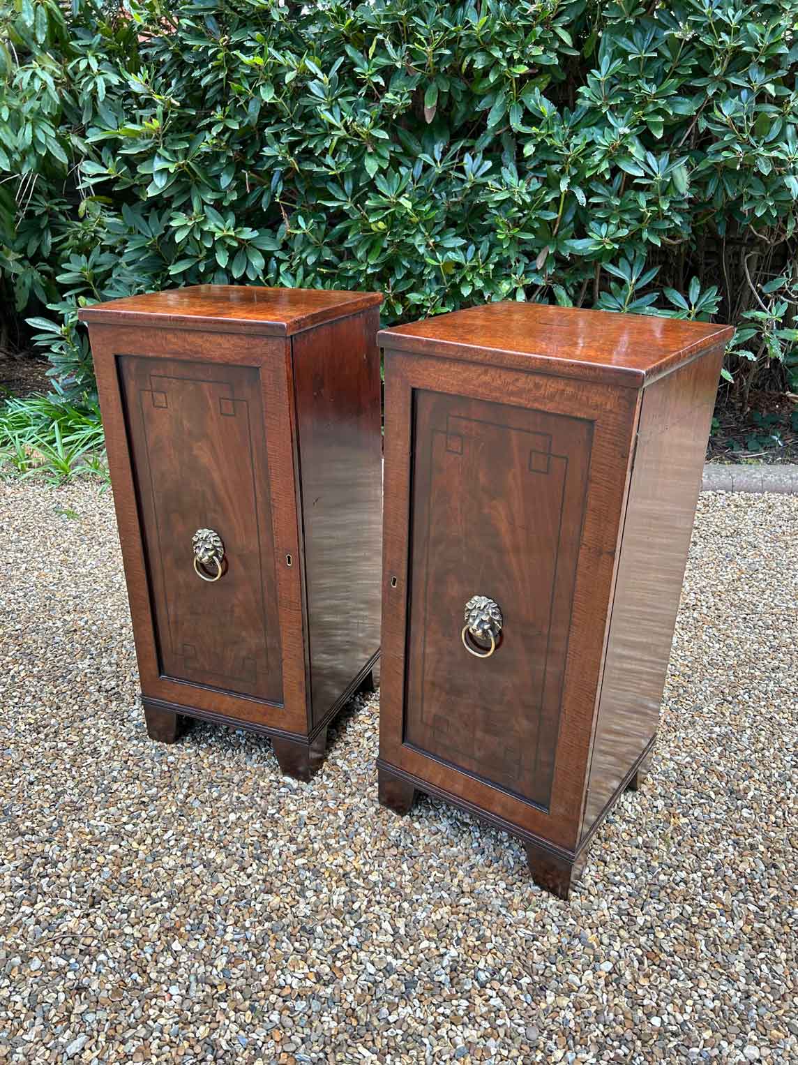 A pair of Regency Mahogany Cupboards with ebony inlay and original brass lion handles.