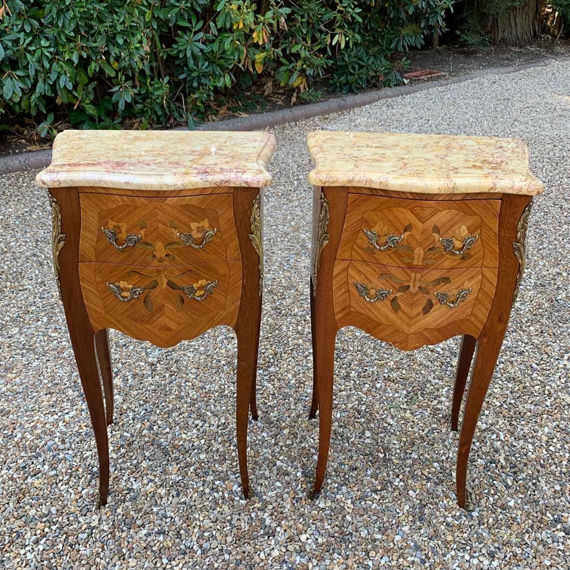 Pair of Vintage French Walnut & Kingwood Bedsides with Marble Tops
