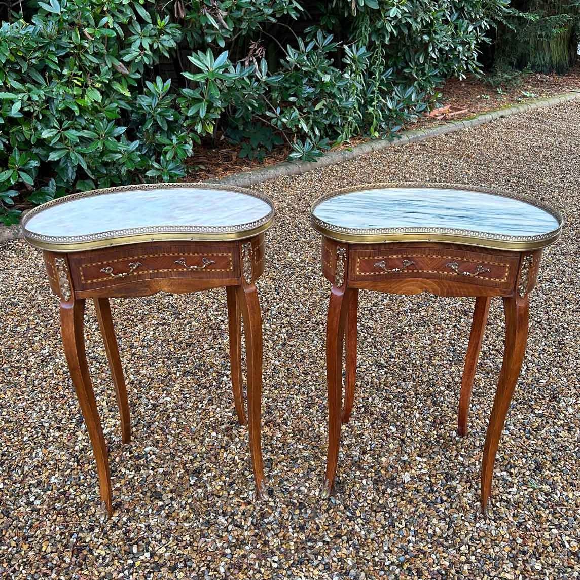 Pair of French Kidney Shaped Bedsides with Marble Tops