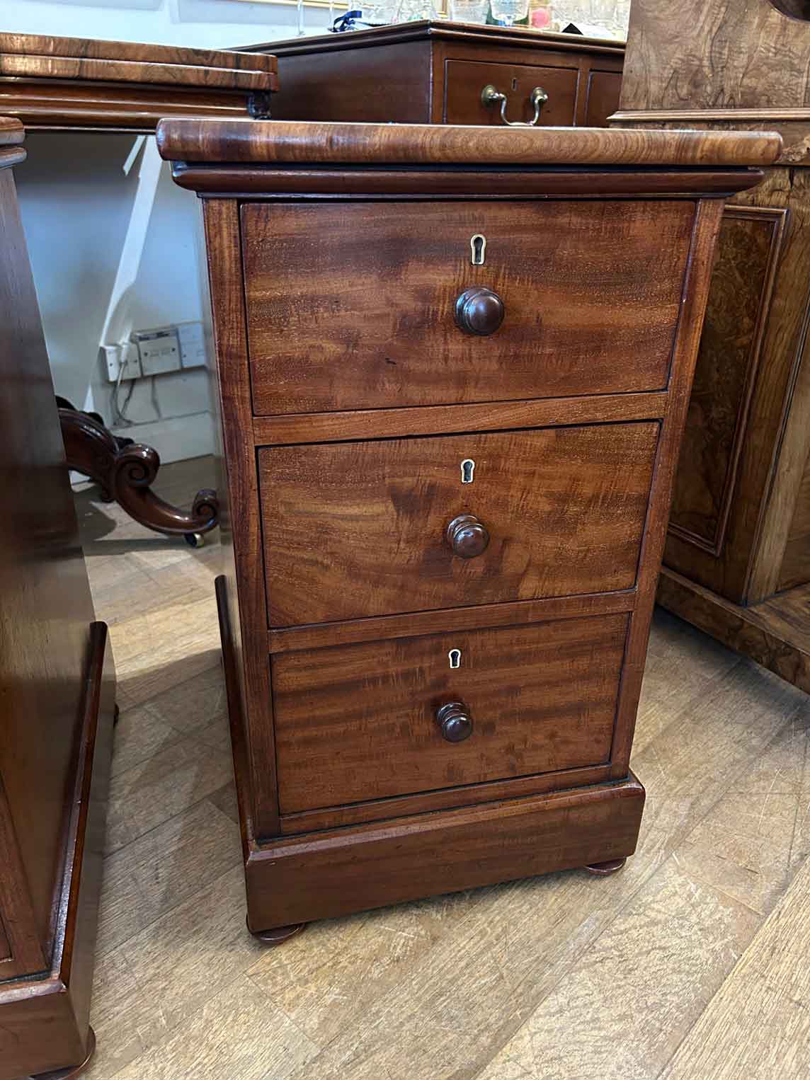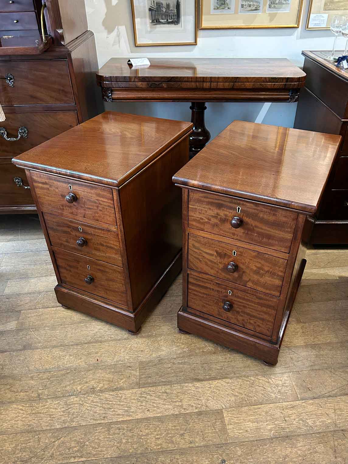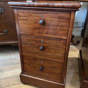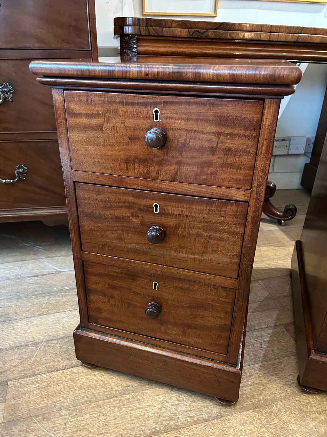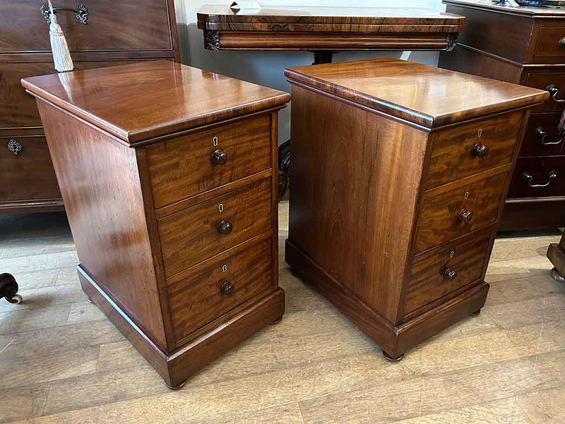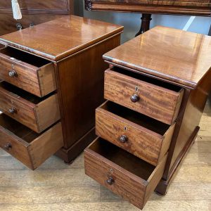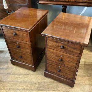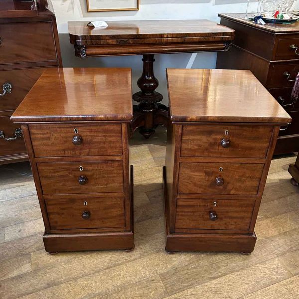 Pair of 19th Century Victorian Mahogany Bedside Chests with three fitted mahogany lined drawers and turned bun handles x2 on a plinth base.