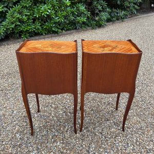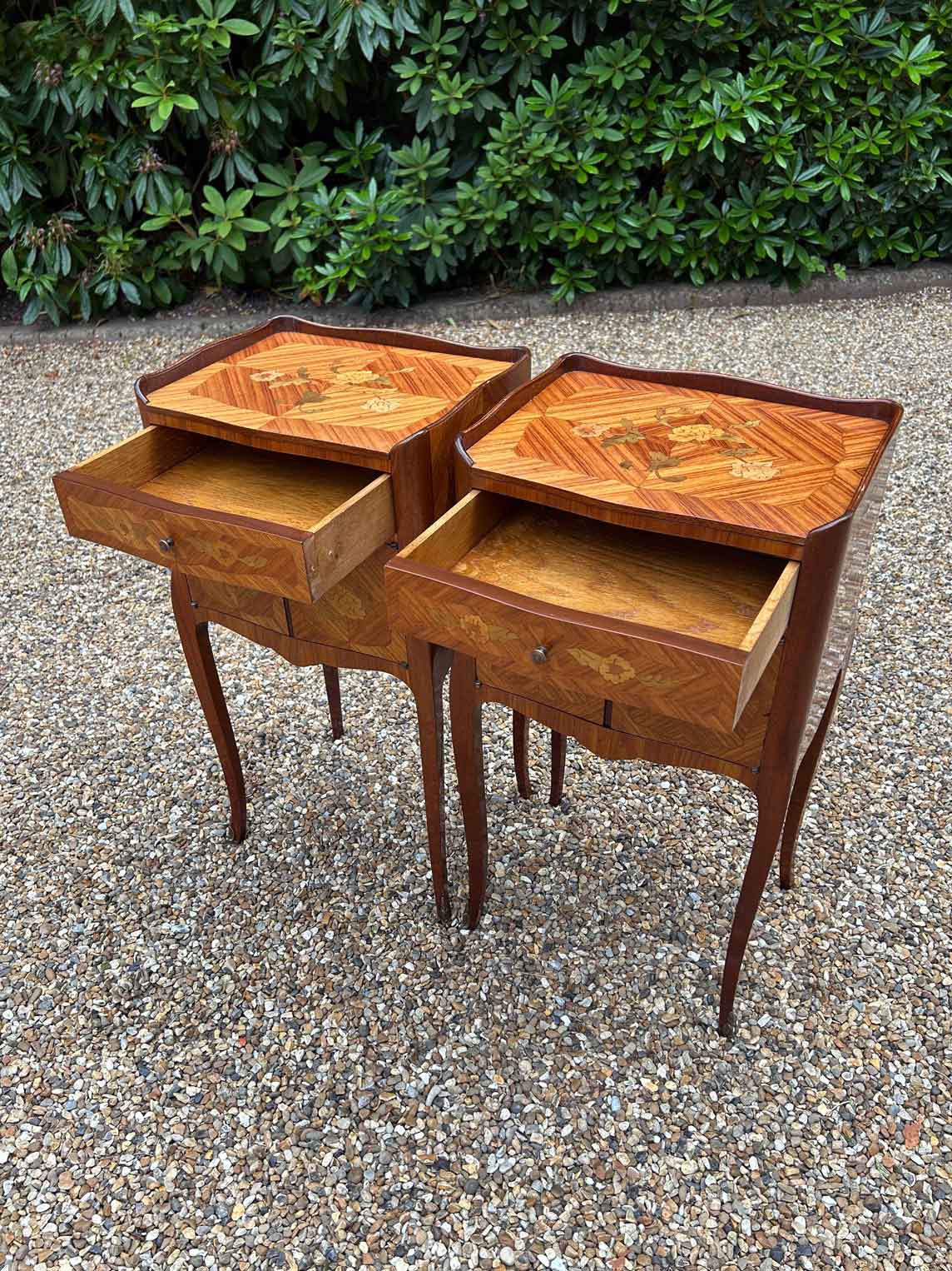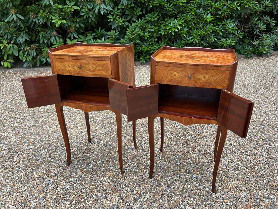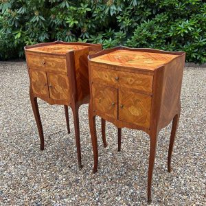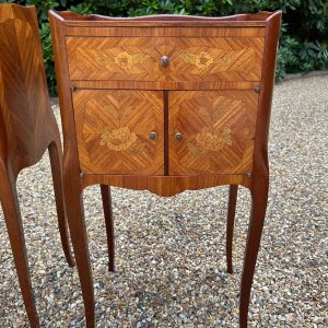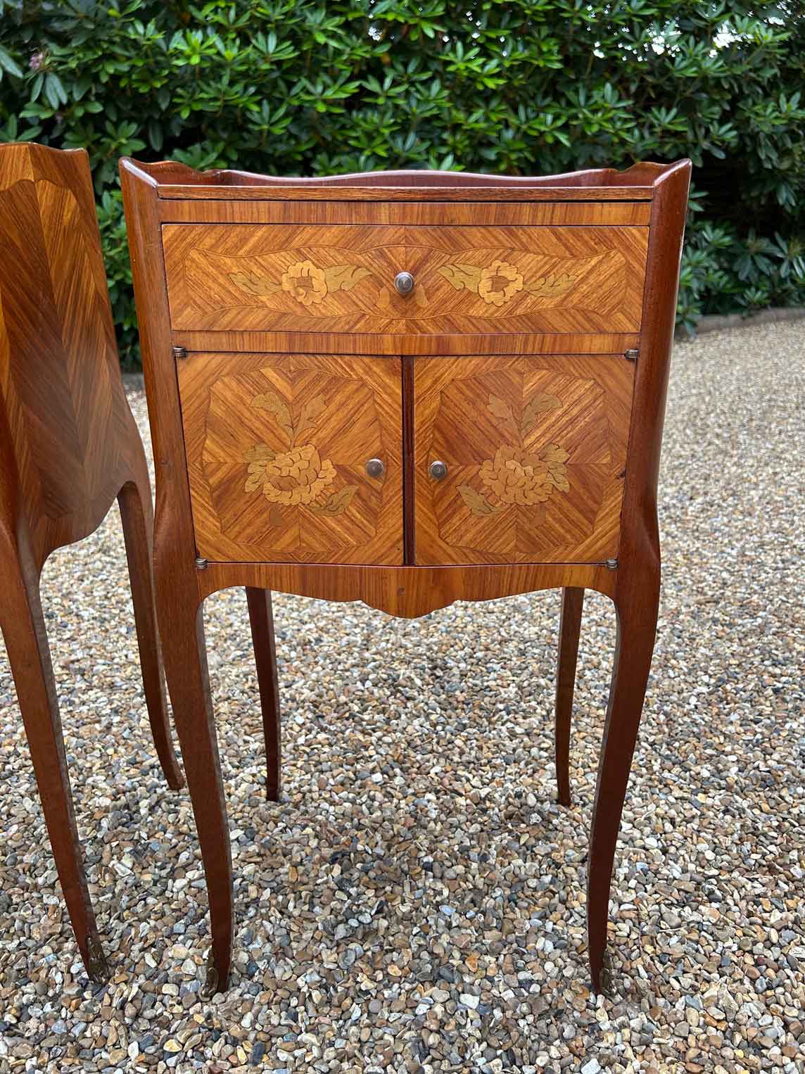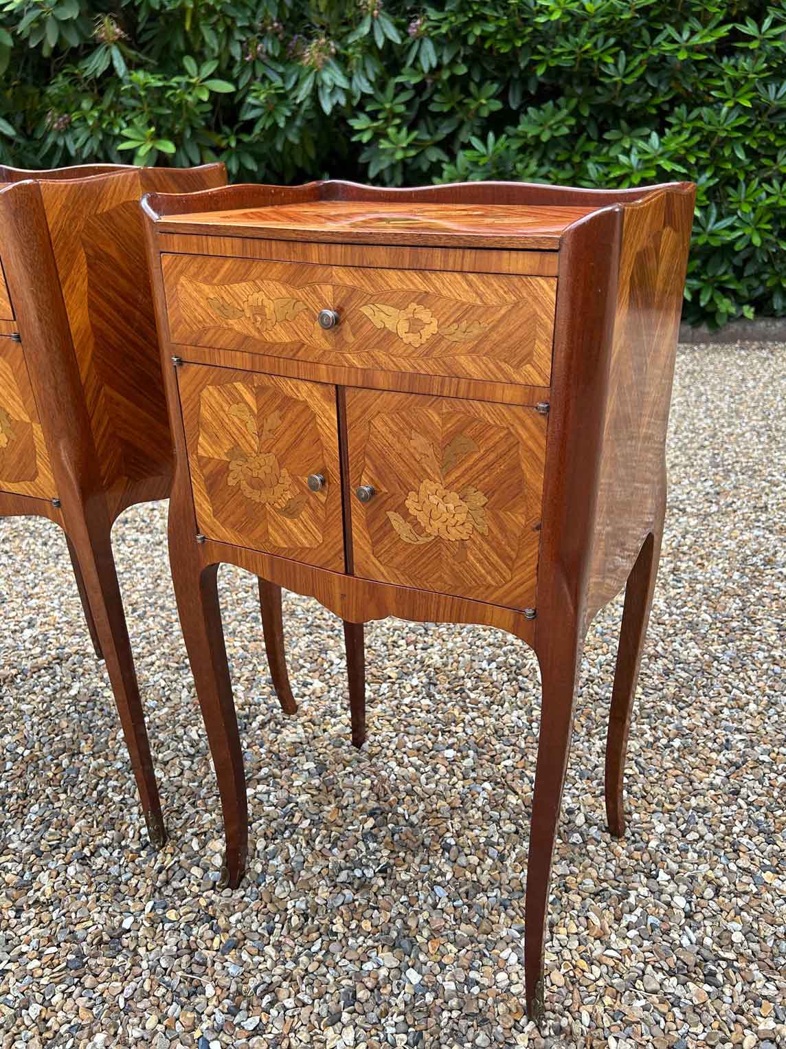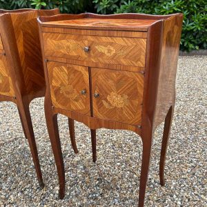 A Pair of Vintage French Kingwood Bedside Tables with floral marquetry inlay and galleried tops, fitted with one drawer, cabinet and cabriole legs.