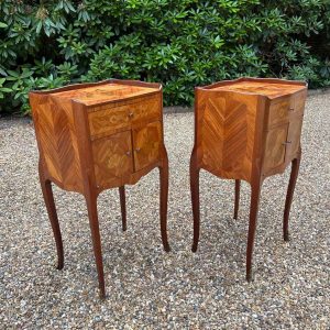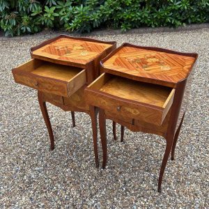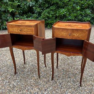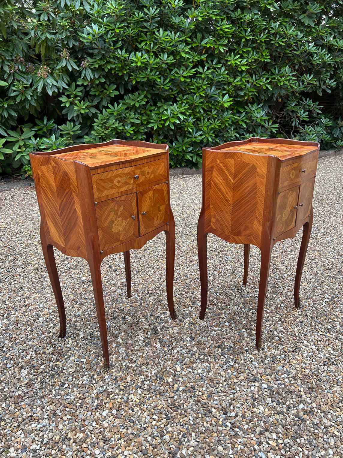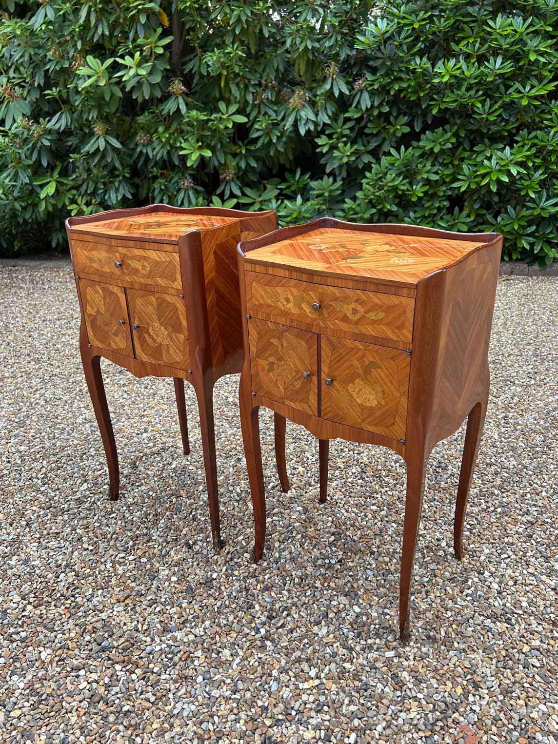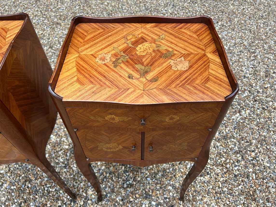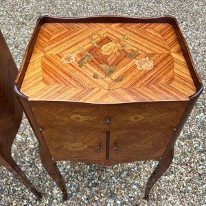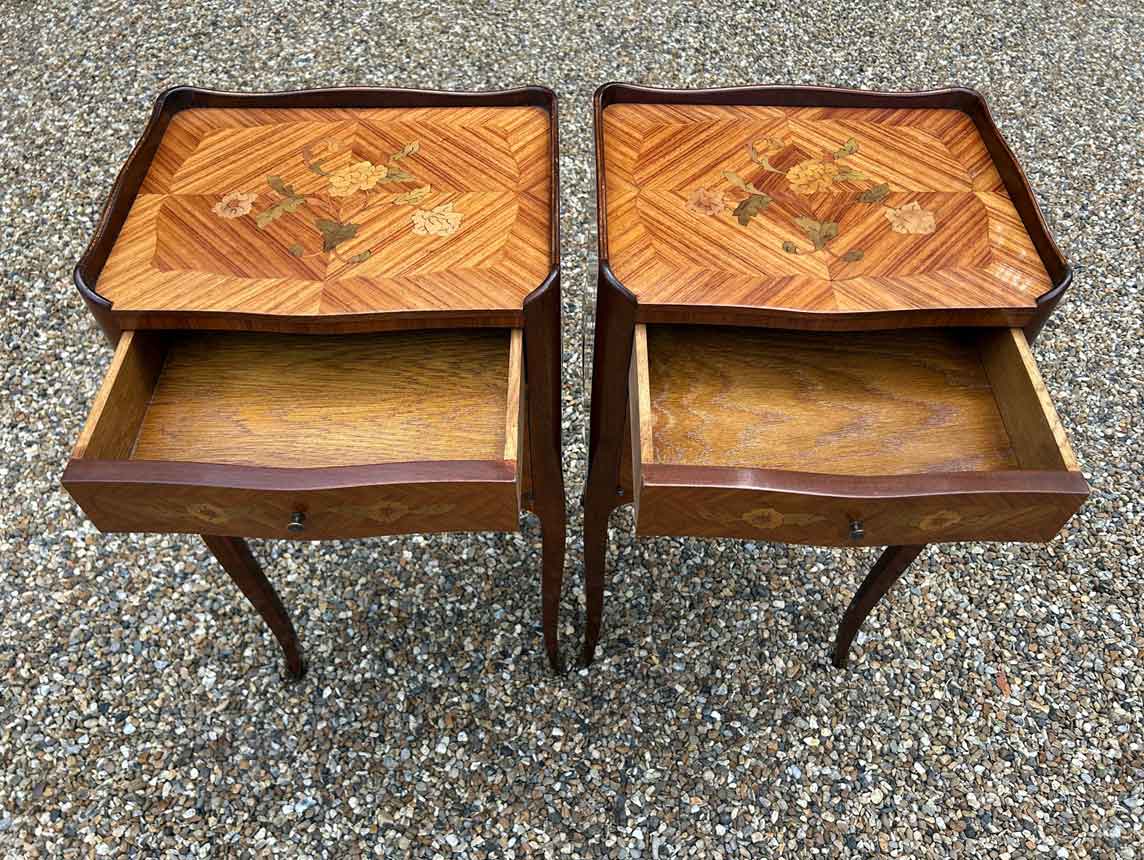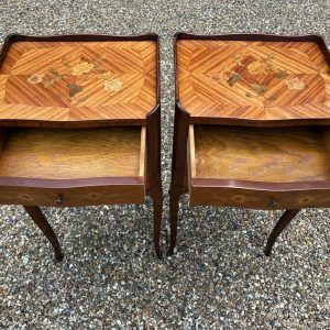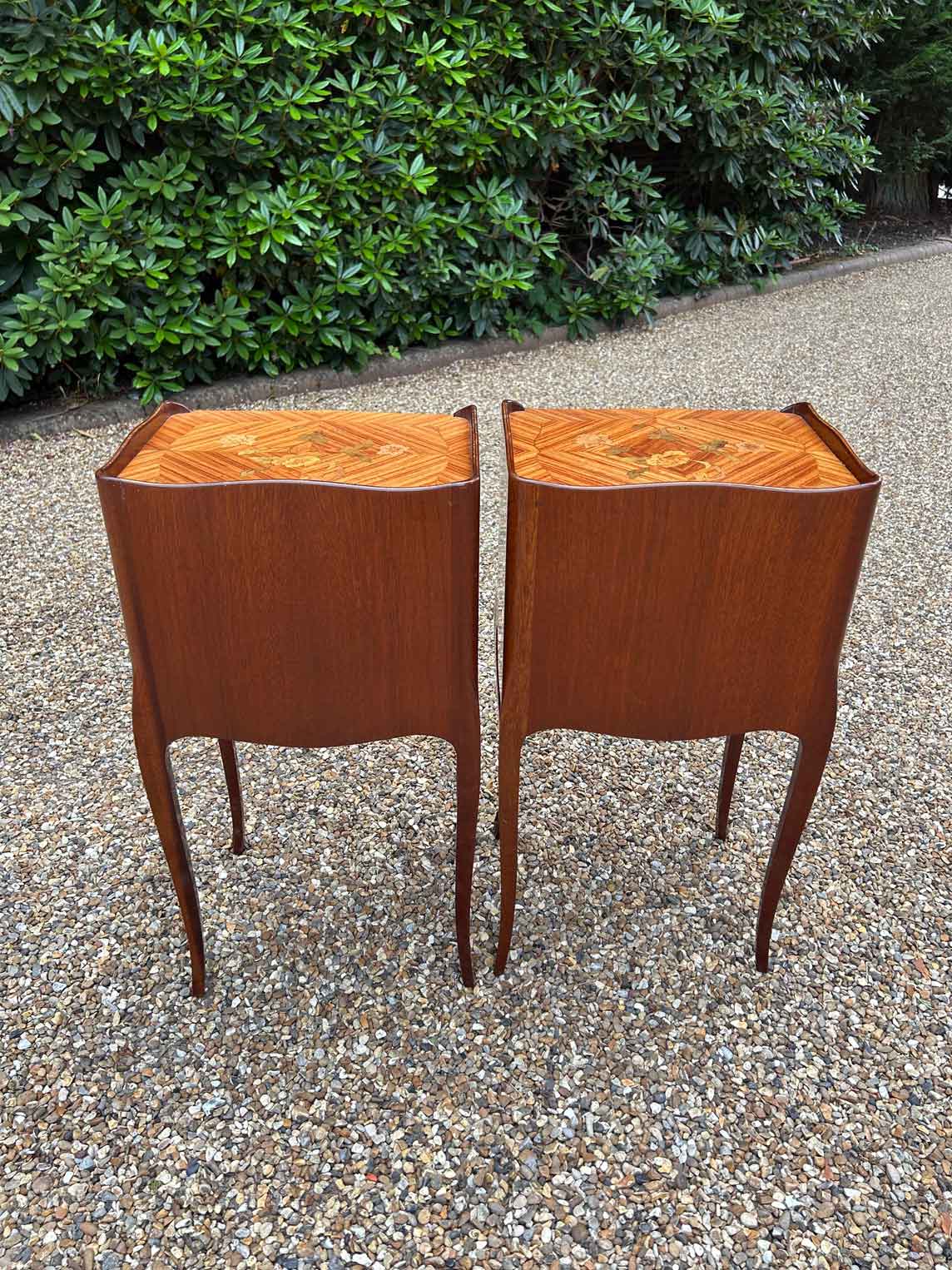 A Pair of Vintage French Kingwood Bedside Tables with floral marquetry inlay and galleried tops, fitted with one drawer, cabinet and cabriole legs.