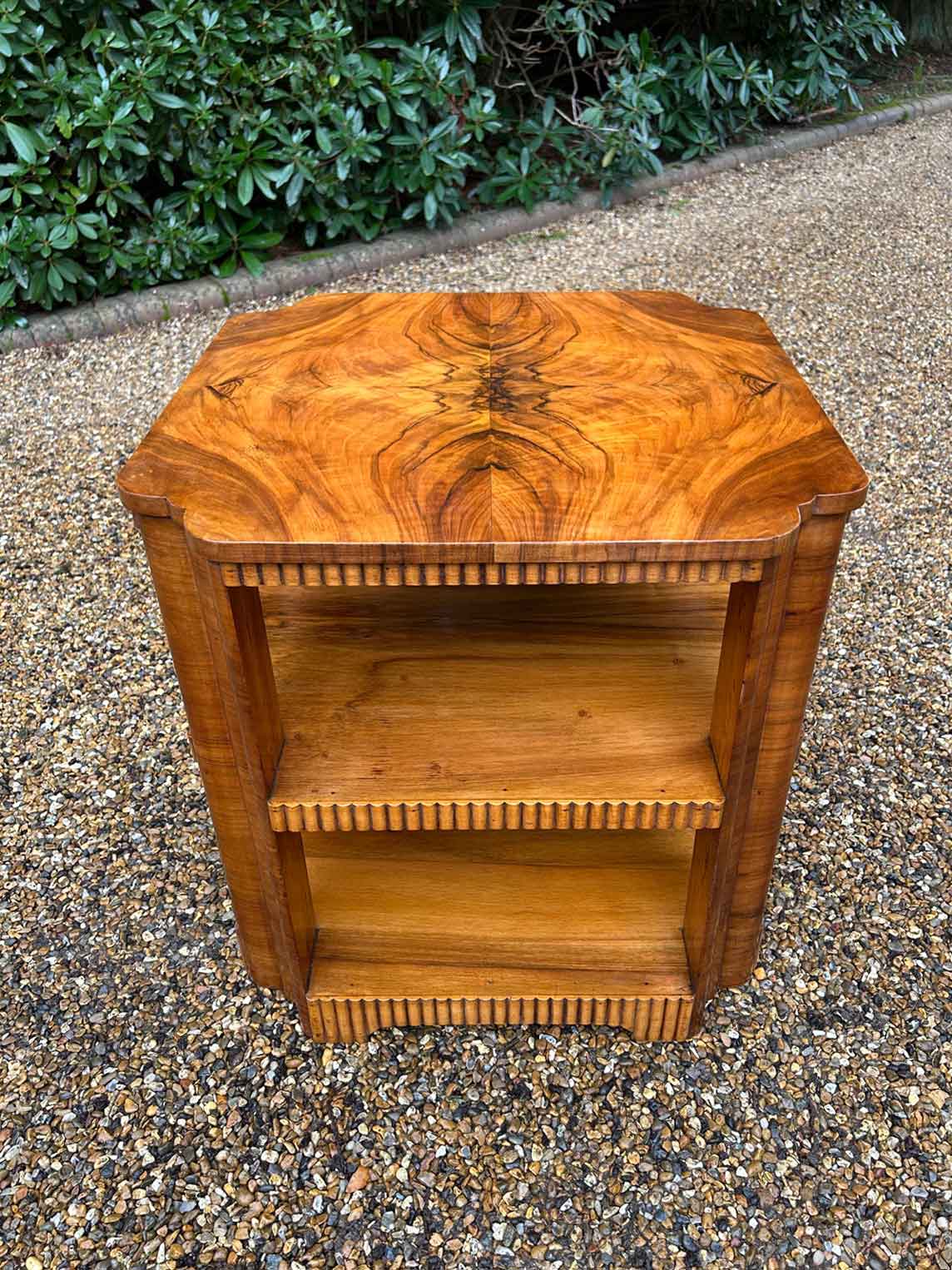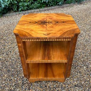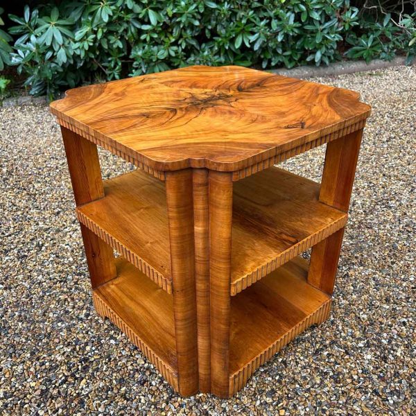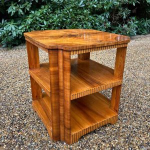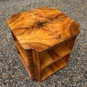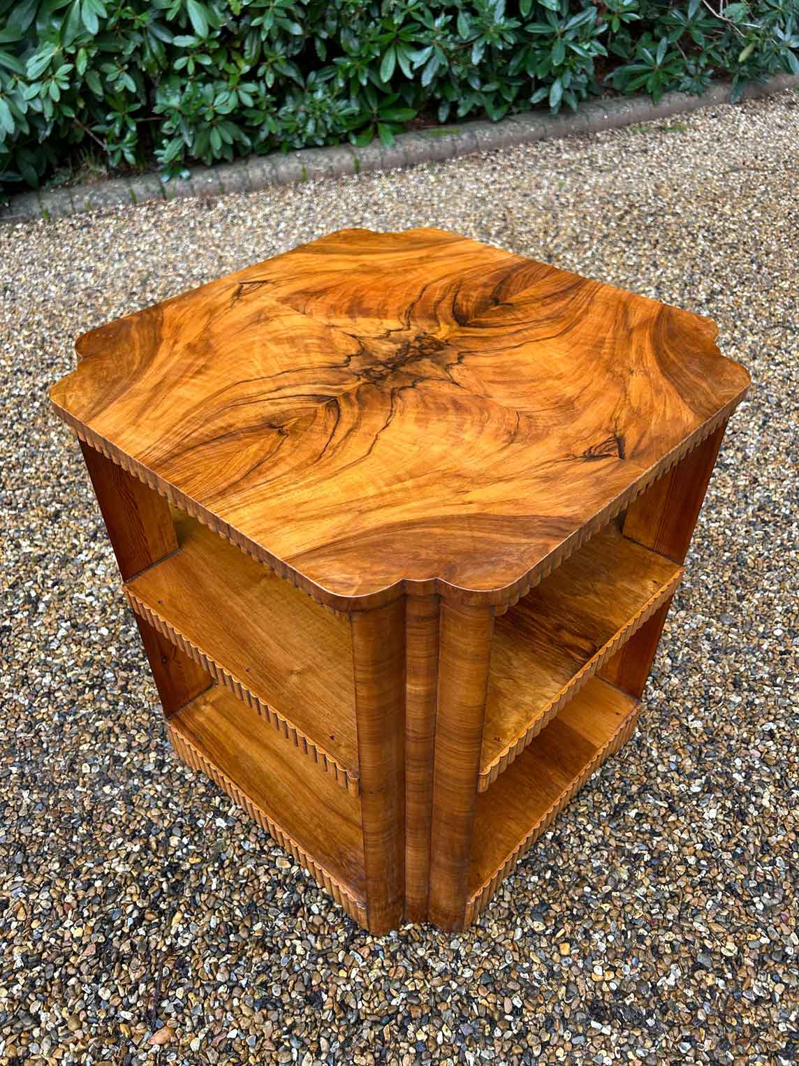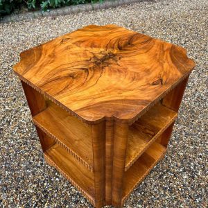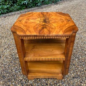 A very high quality English Art Deco Walnut Book / Coffee Table, with quartered veneered and cusped corners. Has two shelves below the table top ideal for books or magazine storage.