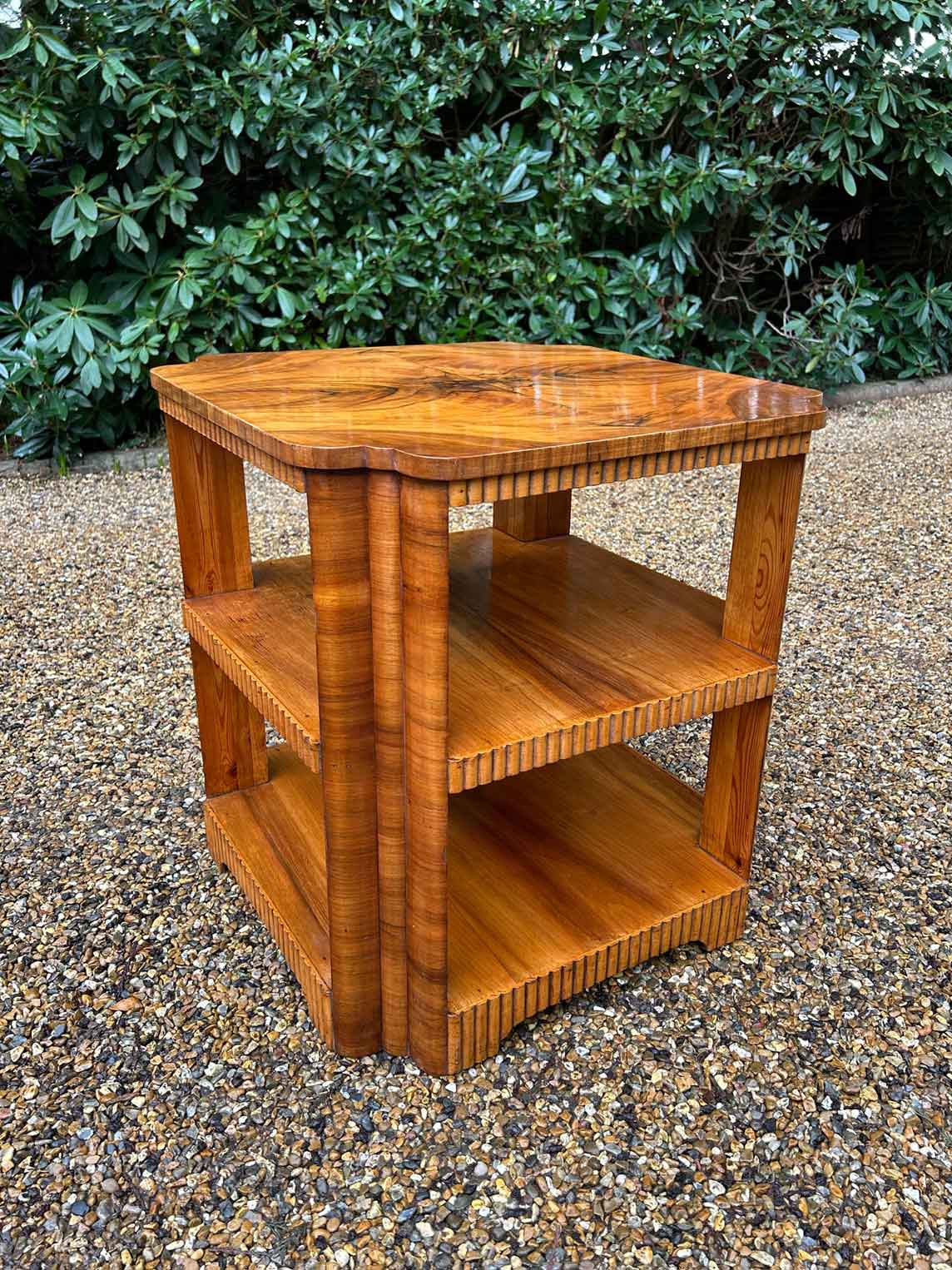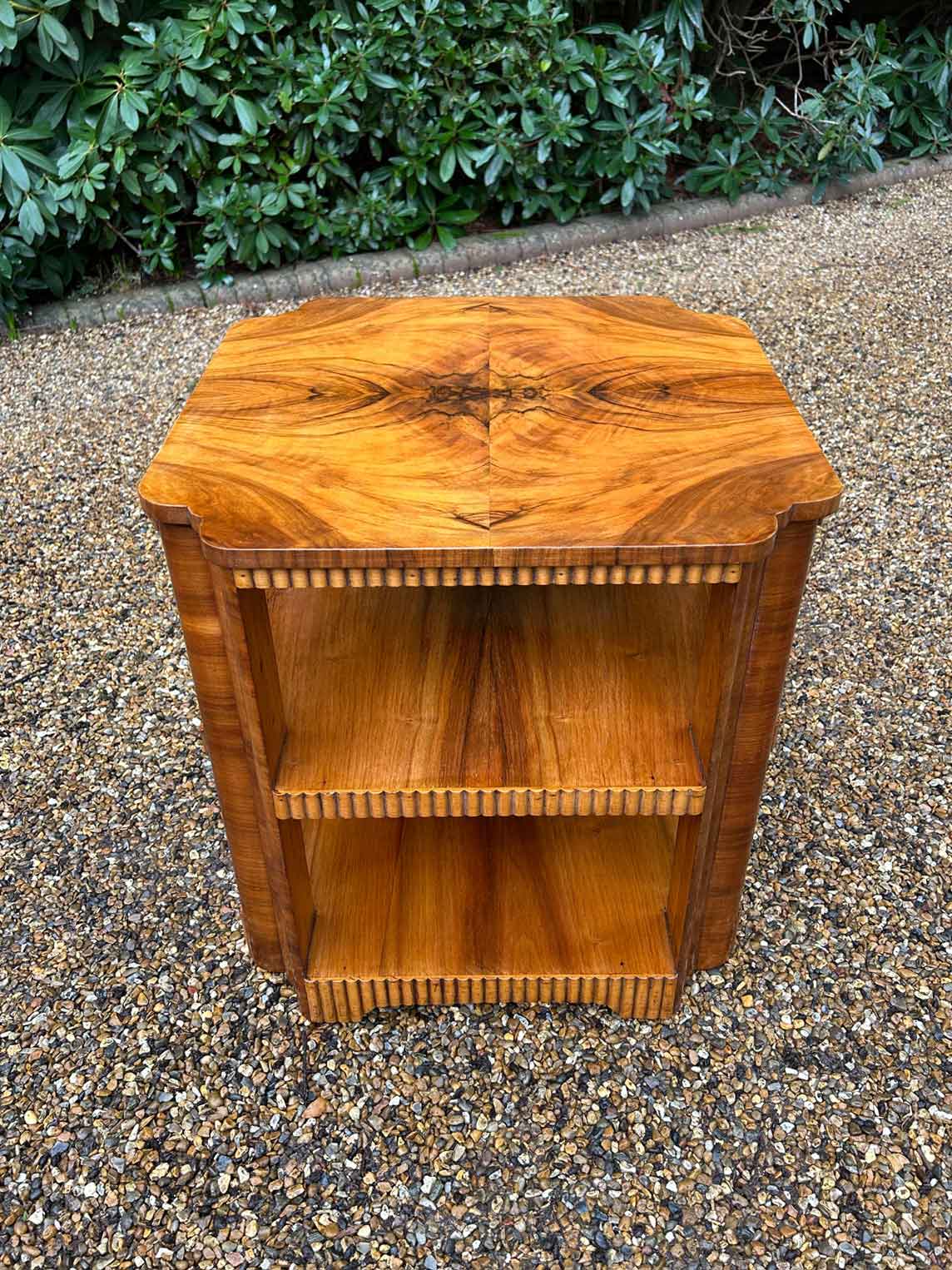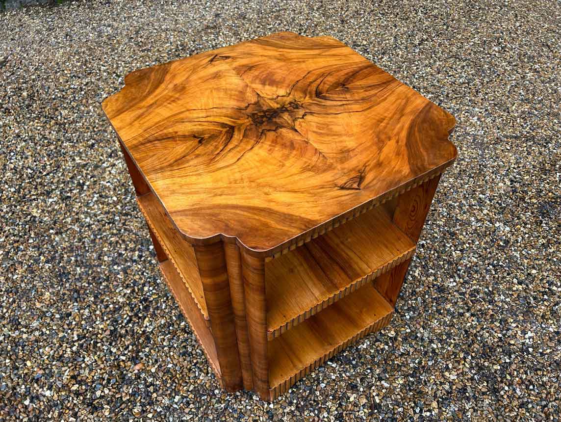 A very high quality English Art Deco Walnut Book / Coffee Table, with quartered veneered and cusped corners. Has two shelves below the table top ideal for books or magazine storage.