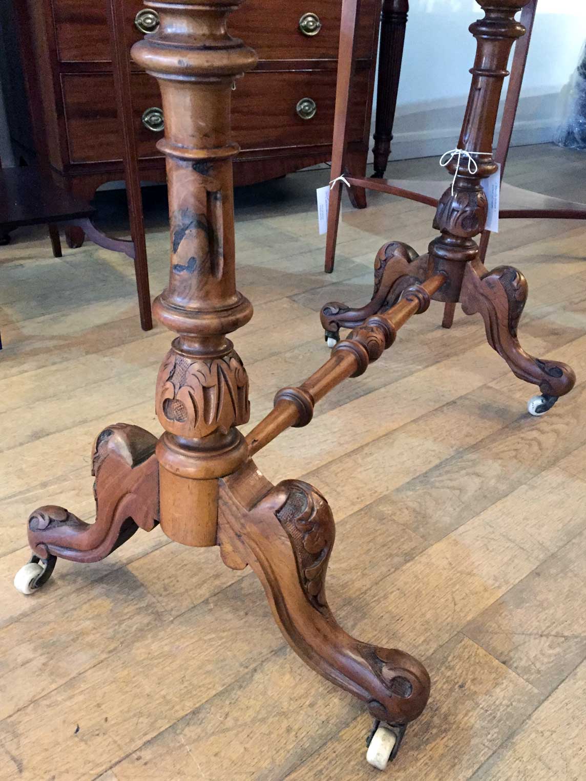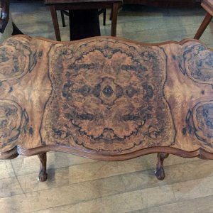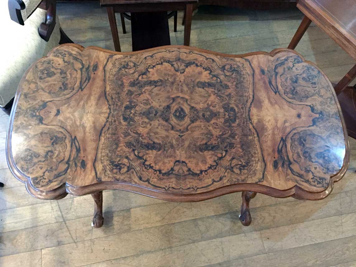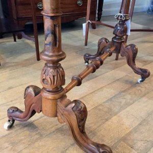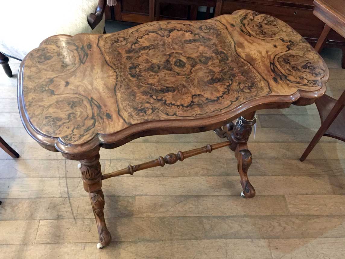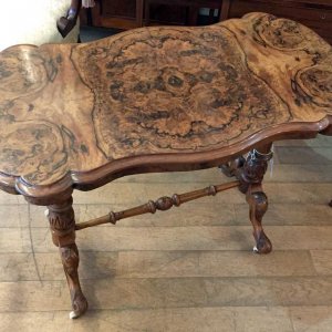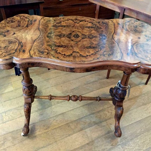 19th Century Victorian Burr Walnut Serpentine Centre Table with quarter veneer highly figured burr walnut top and frieze, serpentine in shape with a round end and an inverted corner. The turned supports are in solid walnut with finely carved decoration to the lower turnings. The cabriole legs are well executed and proportioned and terminate with their original white china castors.