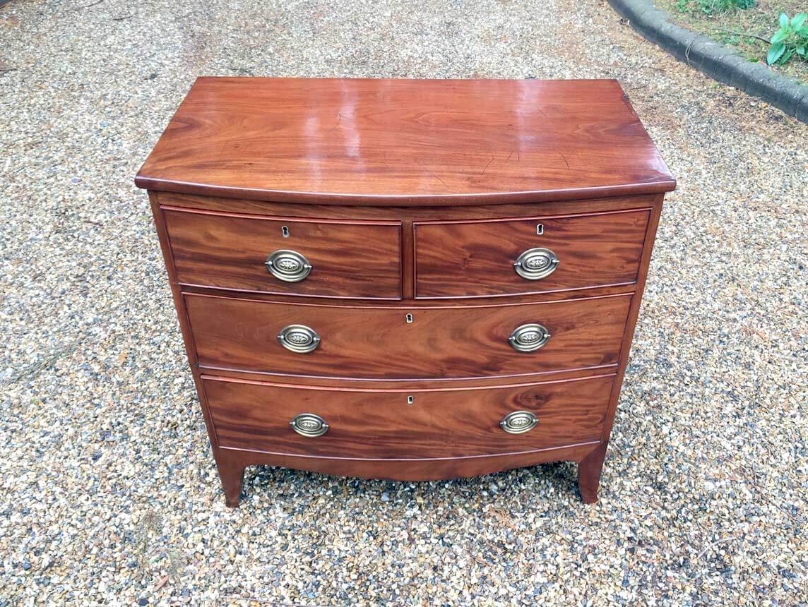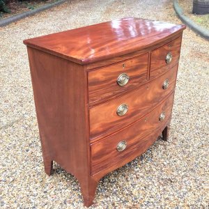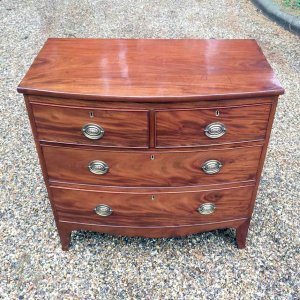 Georgian bow fronted Chest of Drawers with brass handles, two short and two long with splayed feet.