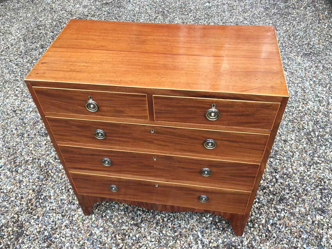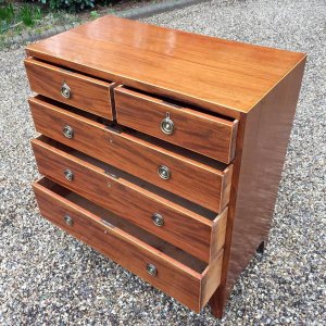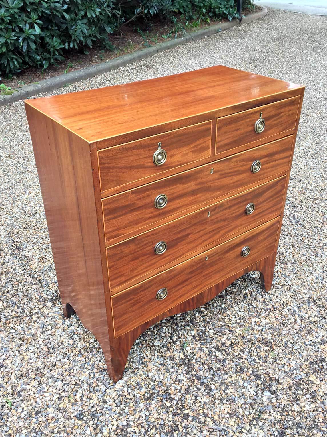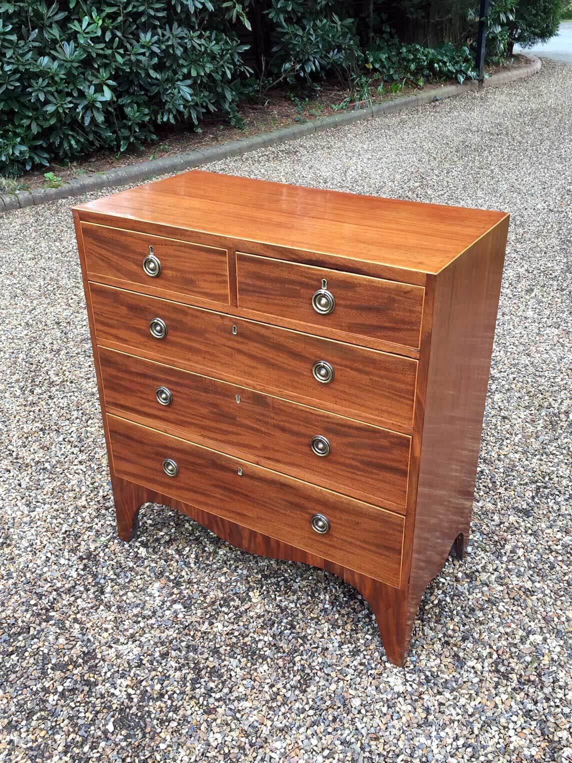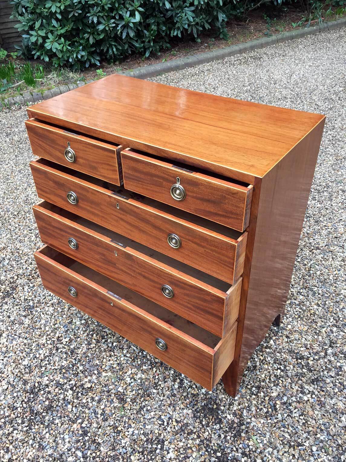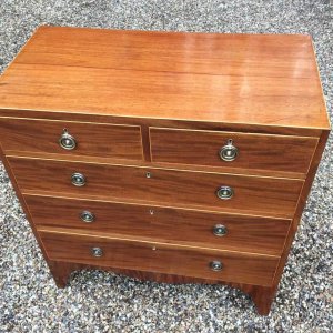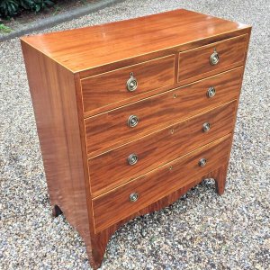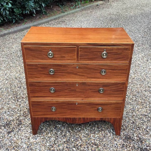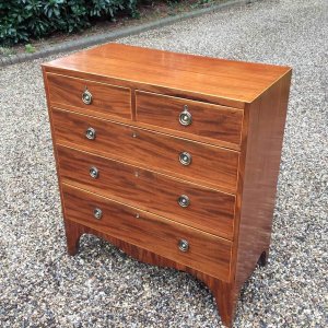 Georgian Mahogany Chest Of Drawers. Two short and three long drawers with brass handles and original splayed feet.