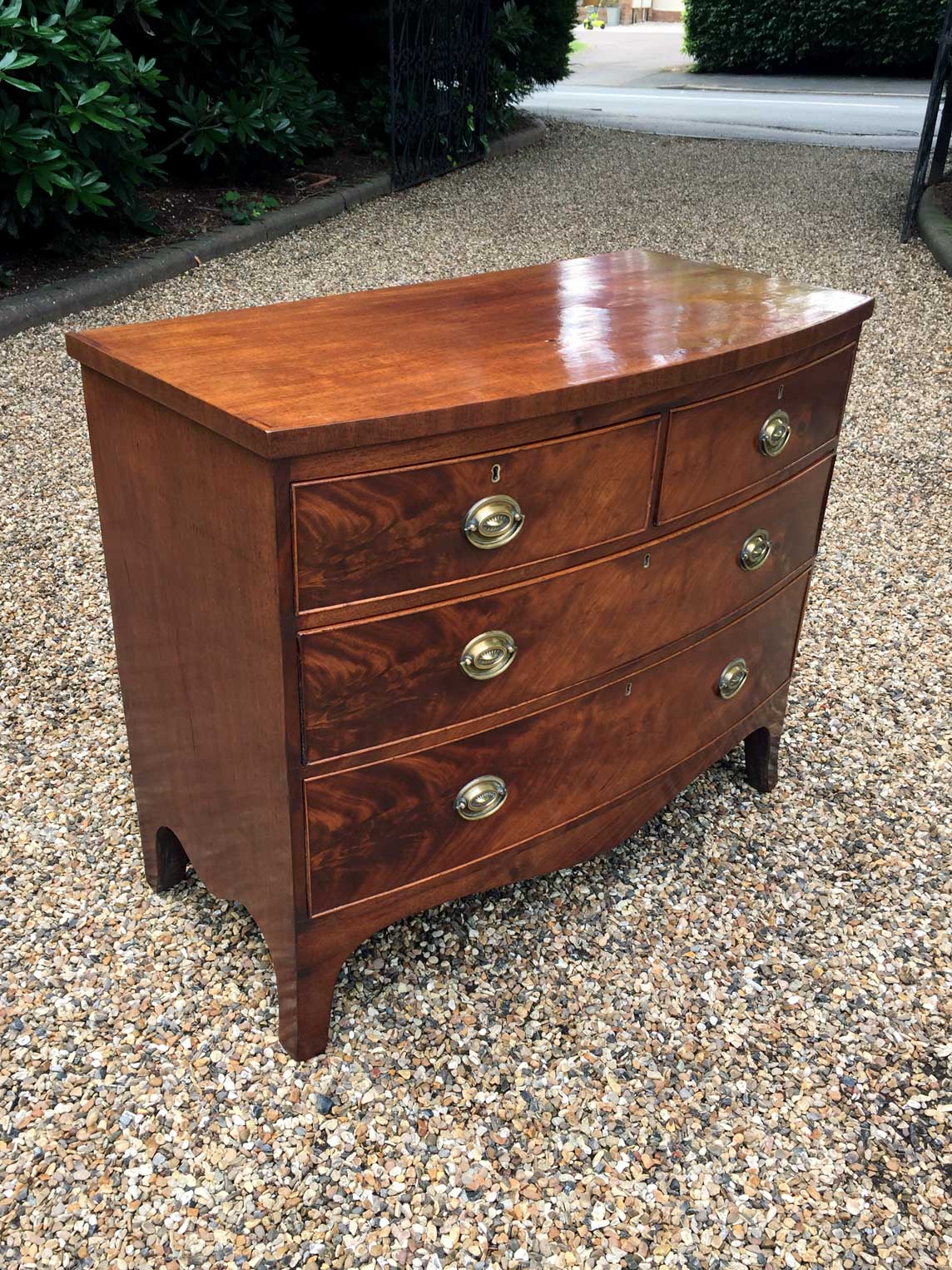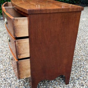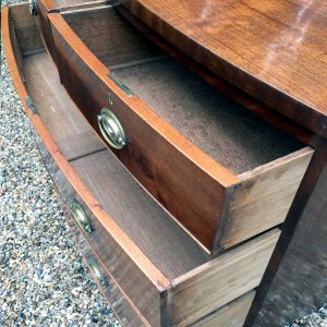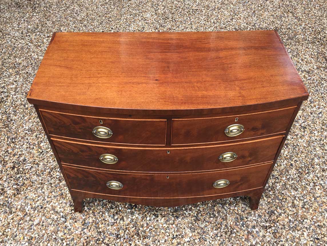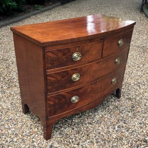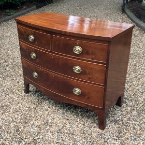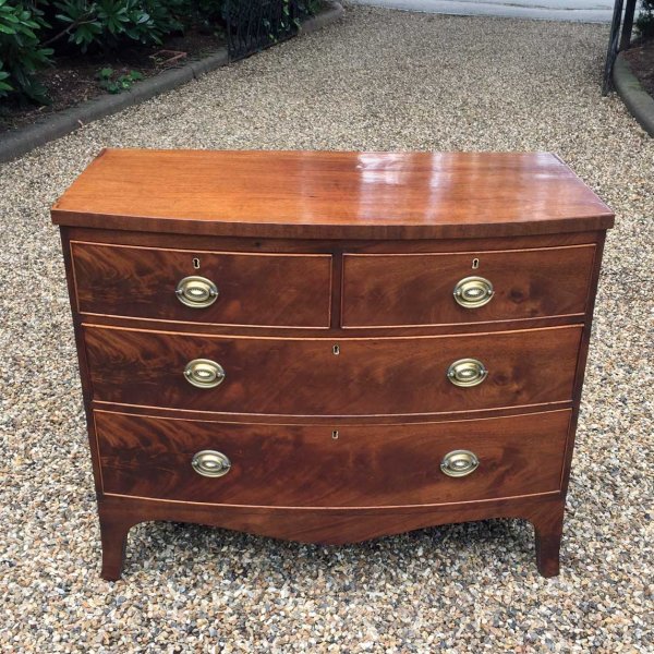 Georgian Mahogany Bow Fronted Chest of Drawers with oval brass handles, two short and two long with splayed feet.