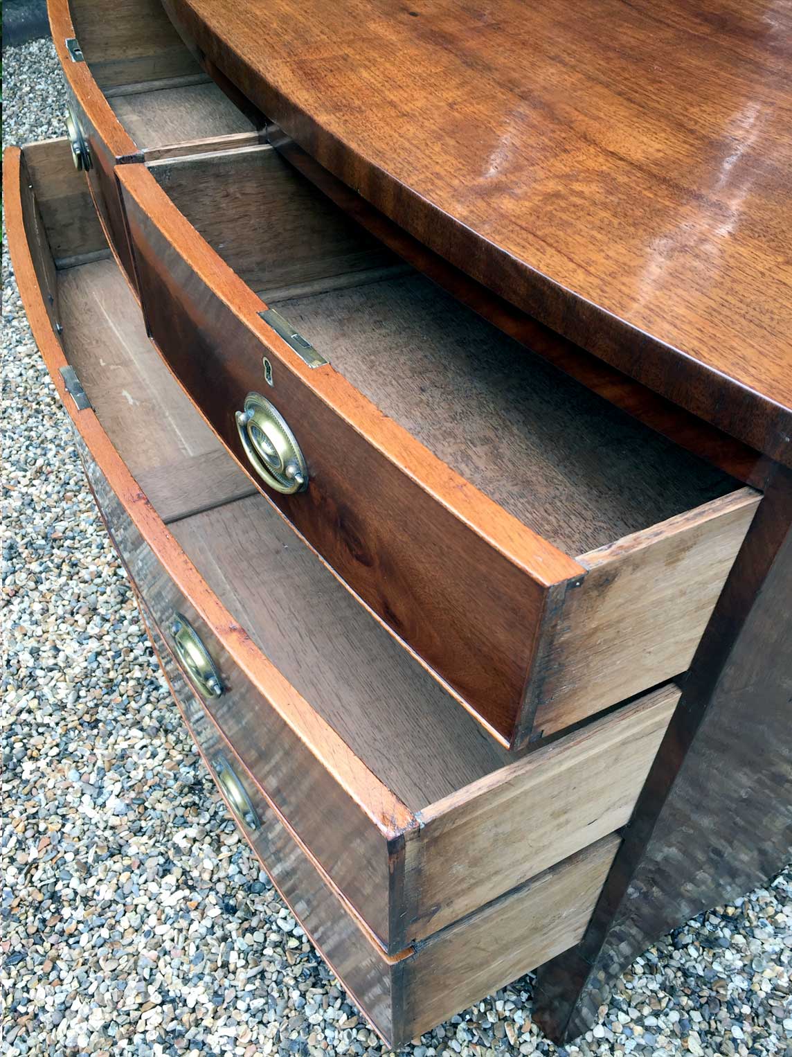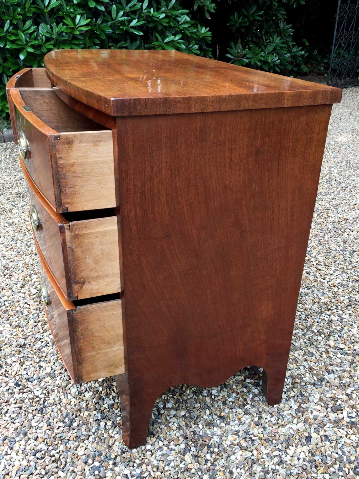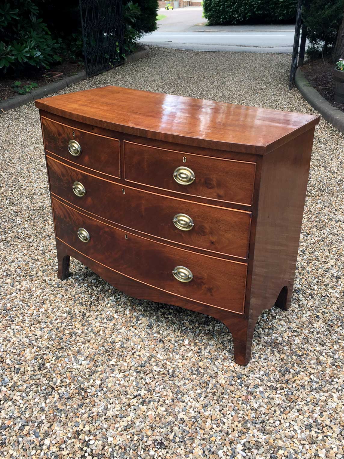 Georgian Mahogany Bow Fronted Chest of Drawers with oval brass handles, two short and two long with splayed feet.