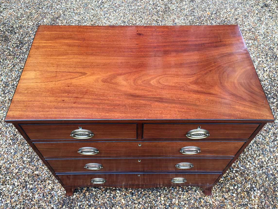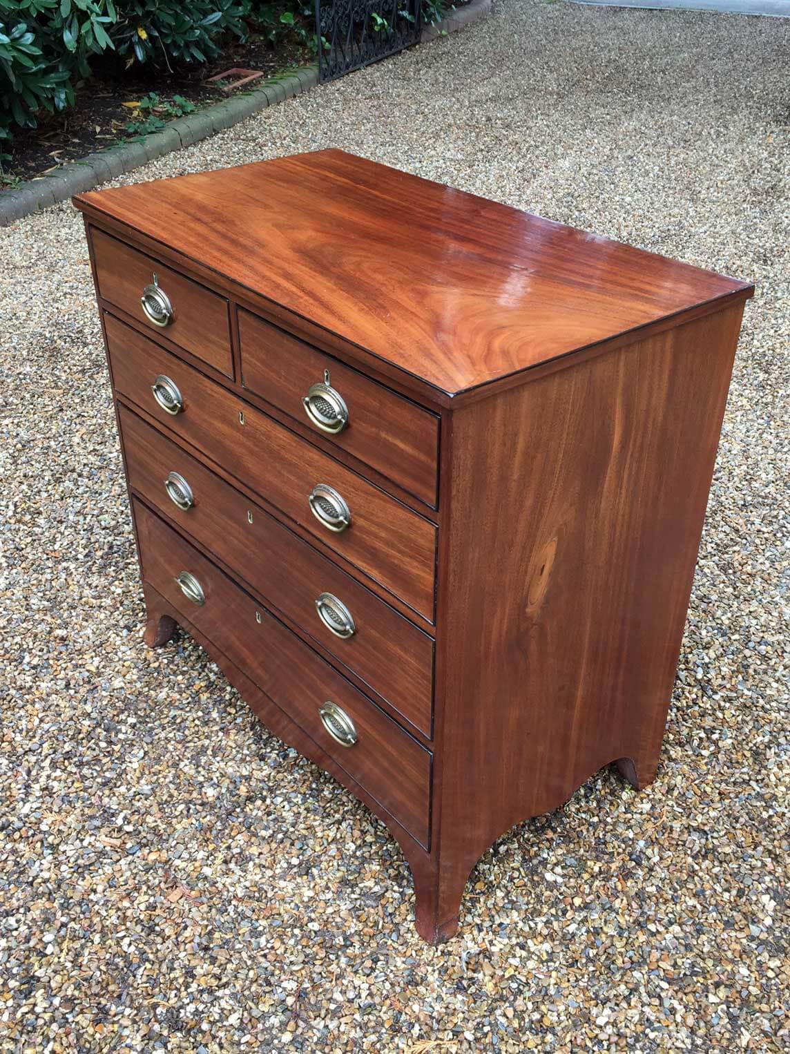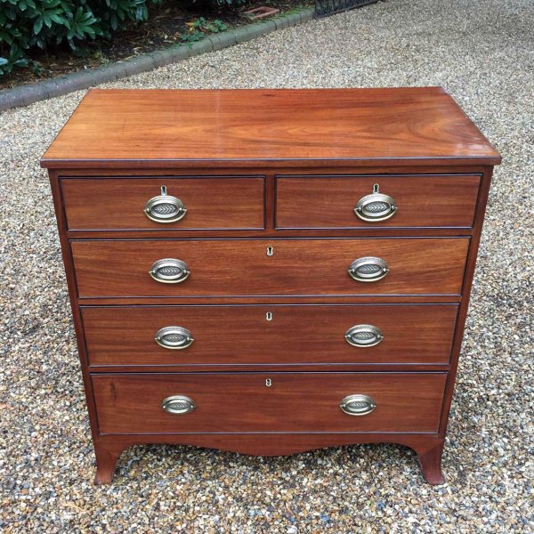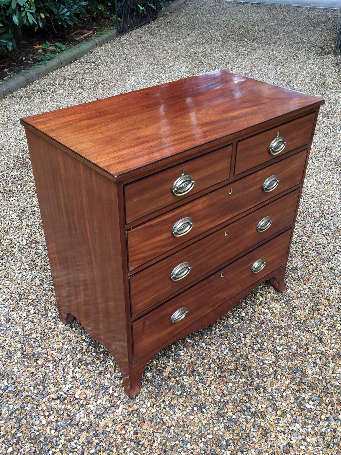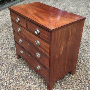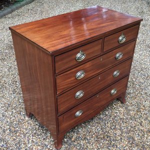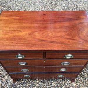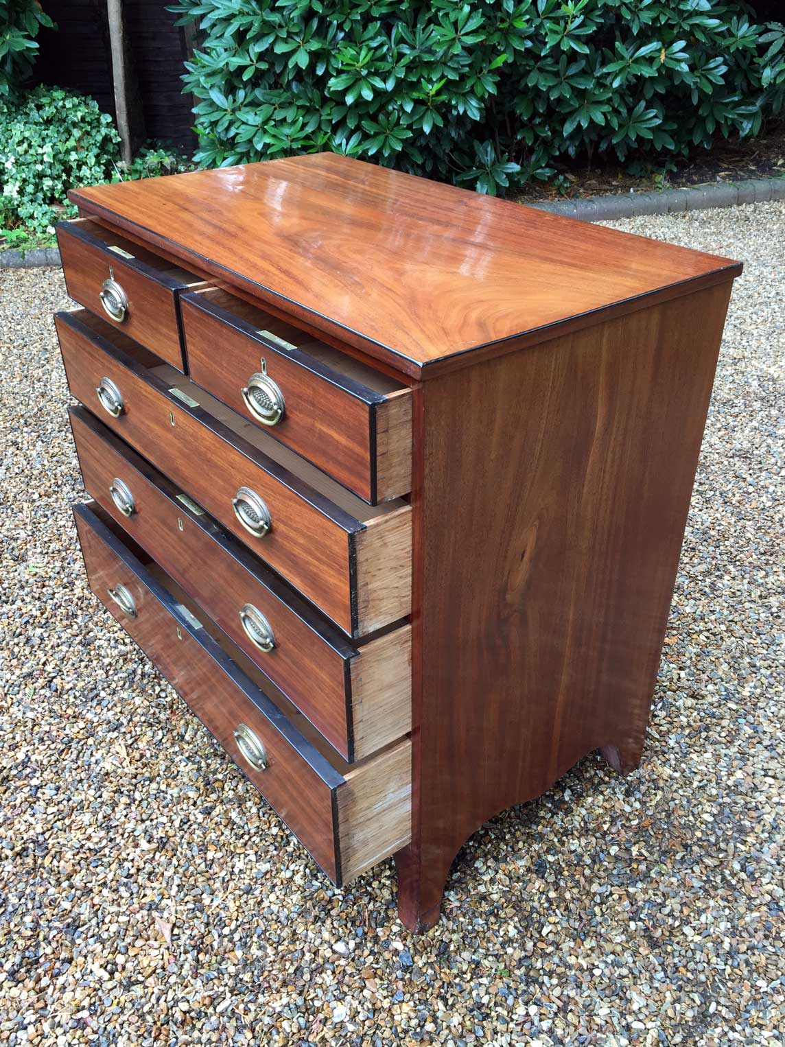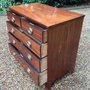 A very good quality Georgian Mahogany Chest of Drawers with brass oval handles, two short and three long drawers with ebony banding and splayed feet.