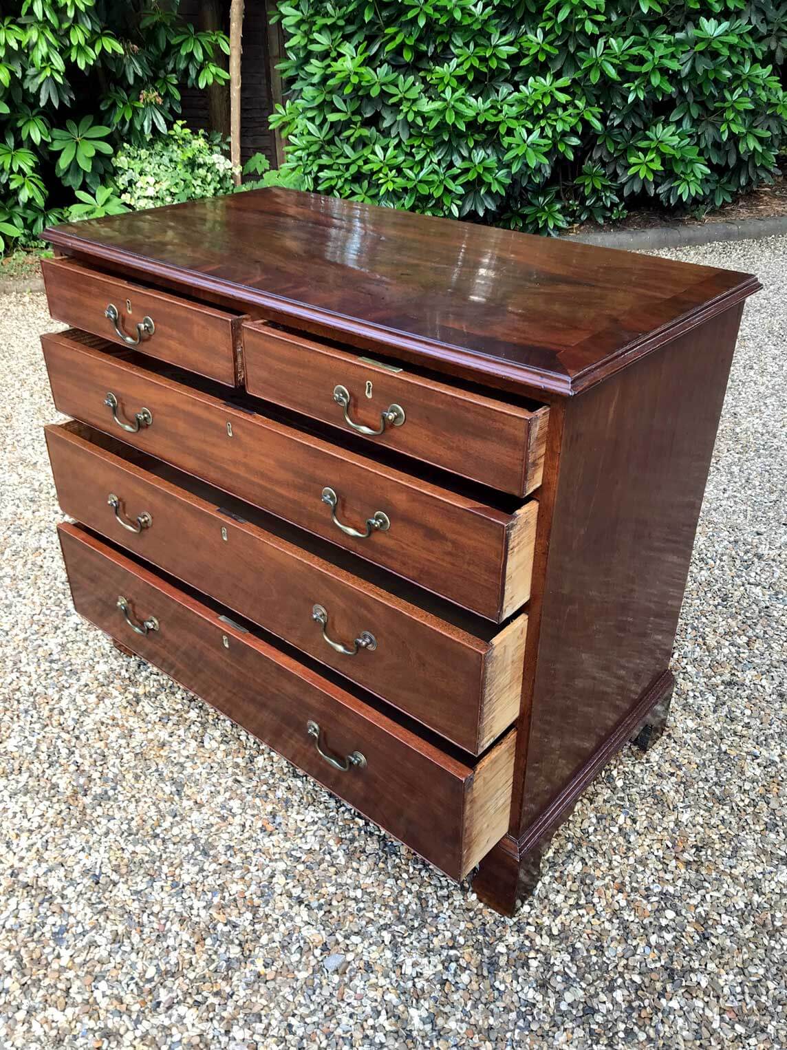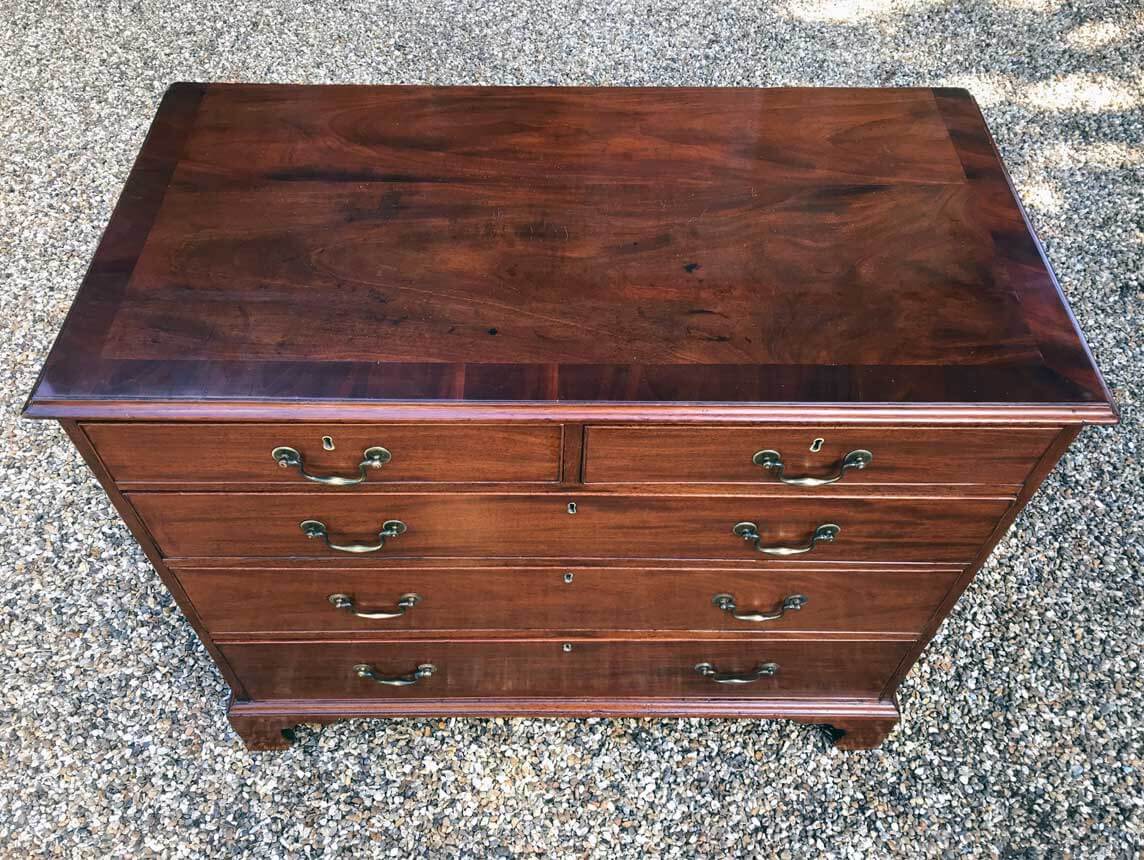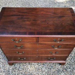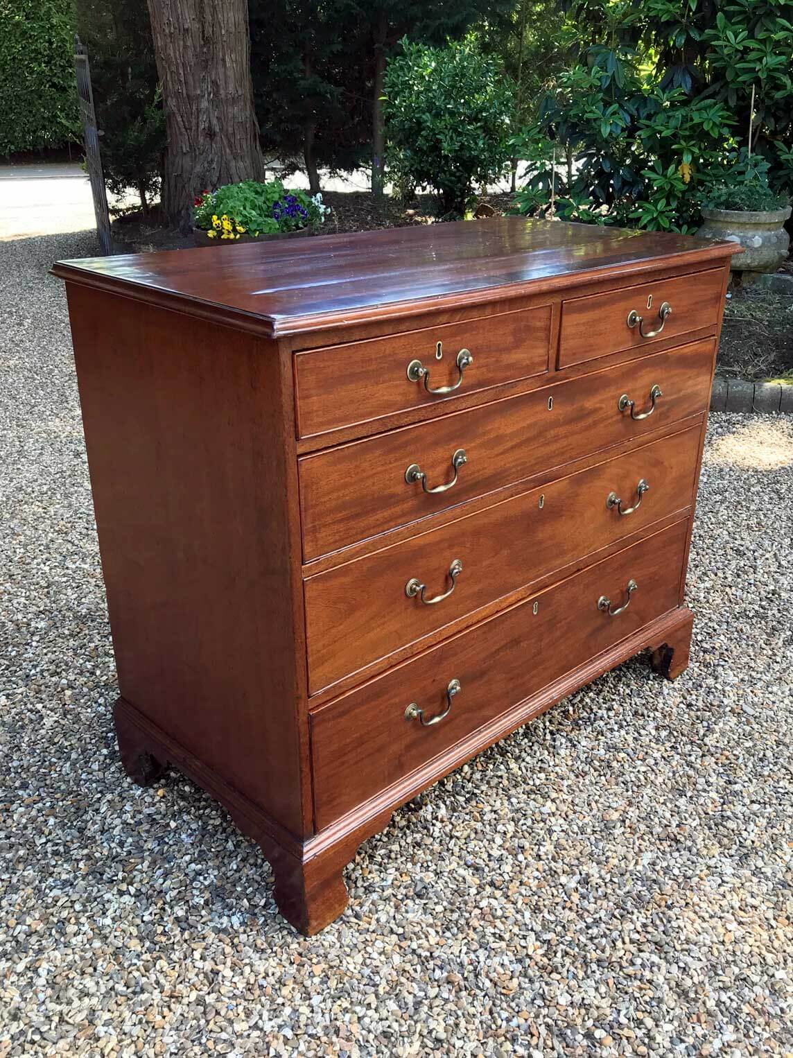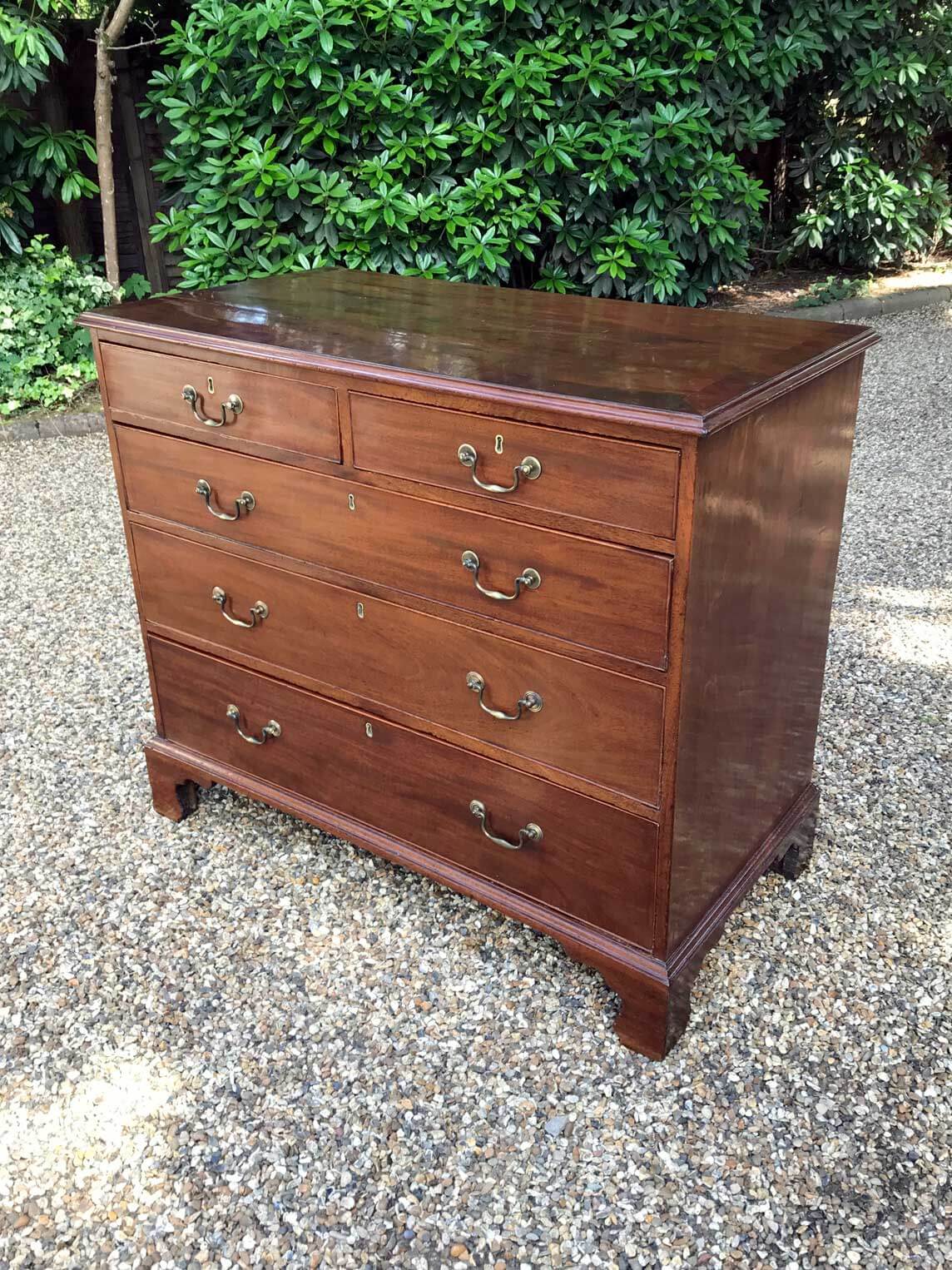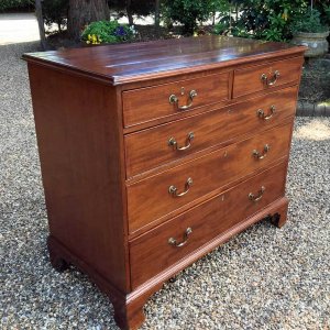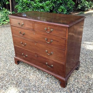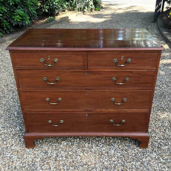A George III Mahogany Chest Of Drawers with two short and three graduated long drawers with original brass swan neck handles, on bracket feet.