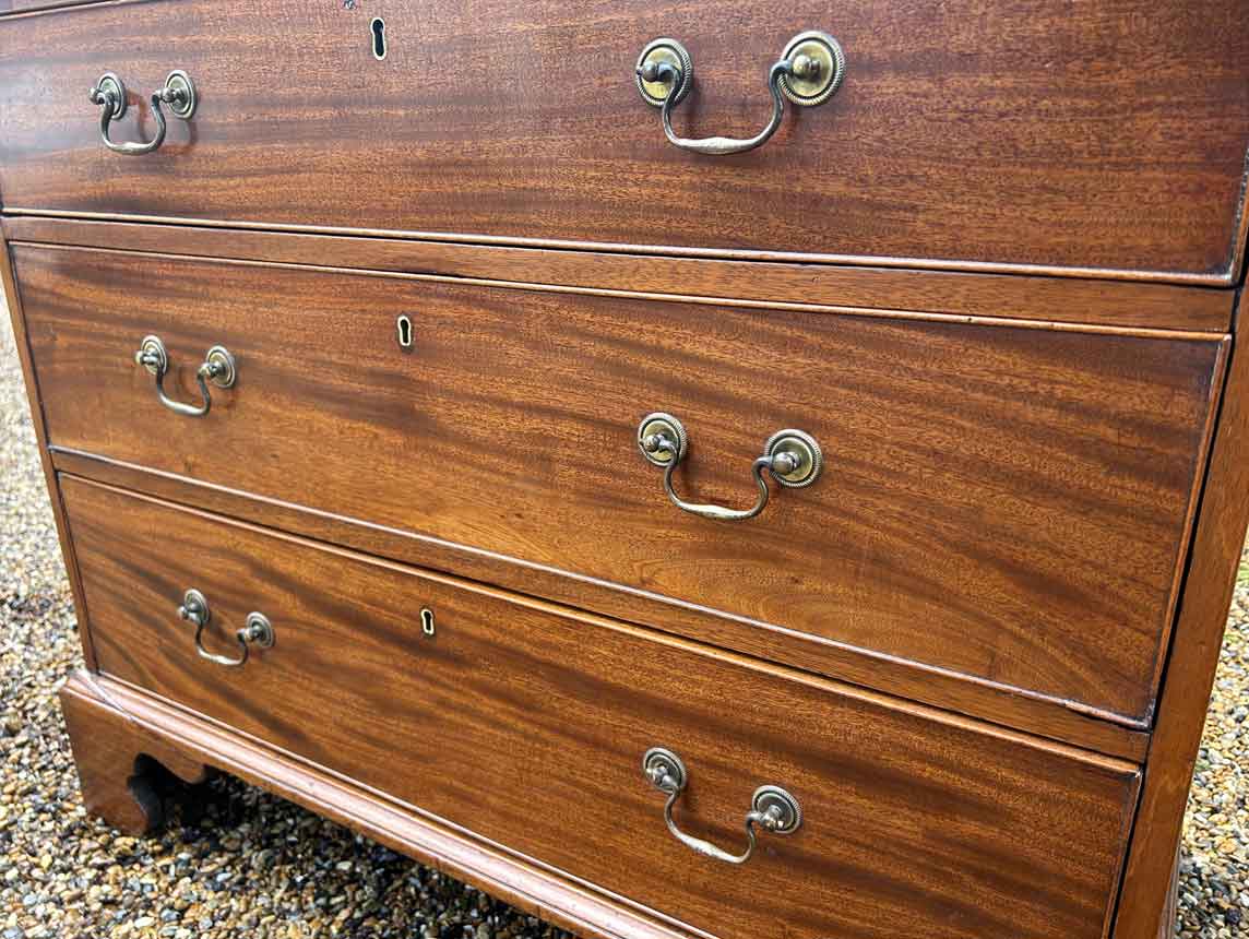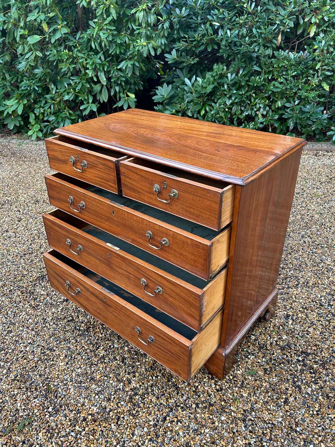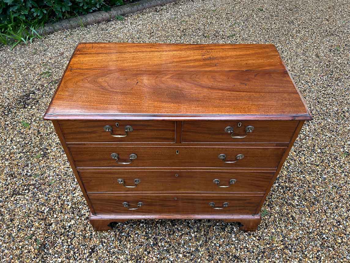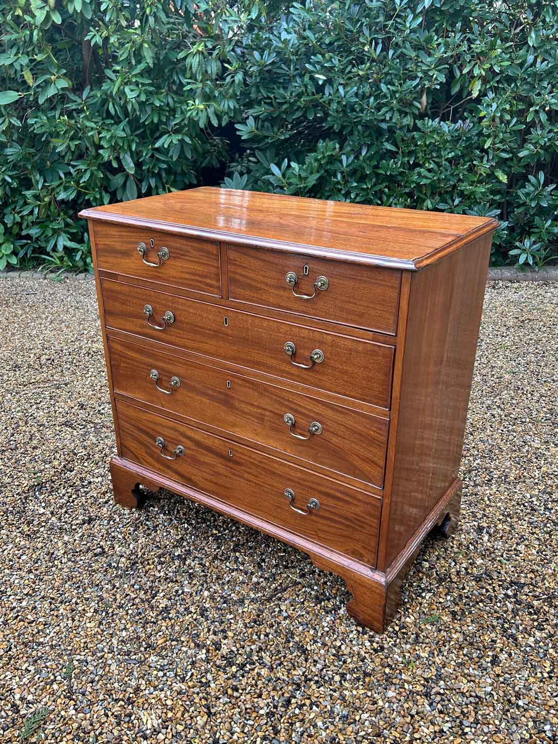 19th Century George III Mahogany Chest Of Drawers with two short and three long graduated drawers, original brass swan neck handles, on bracket feet.