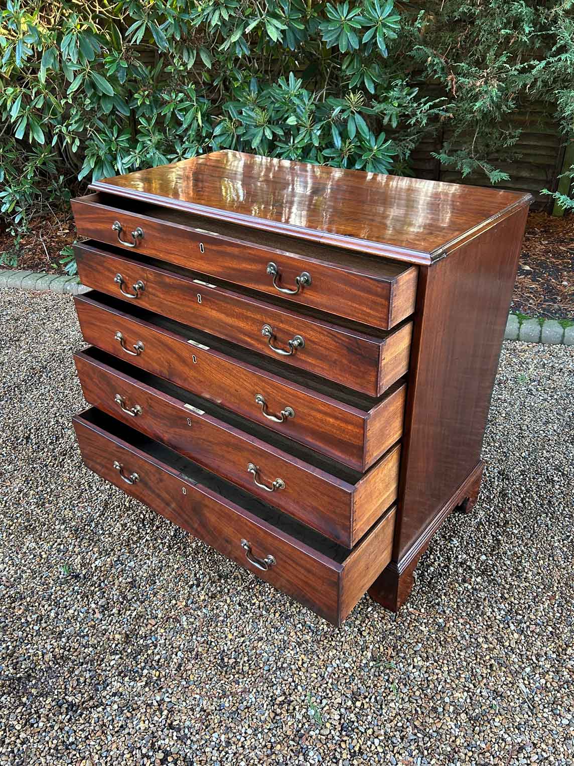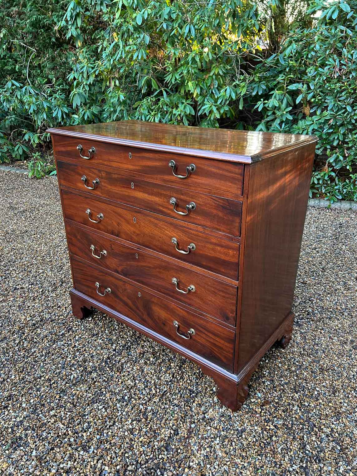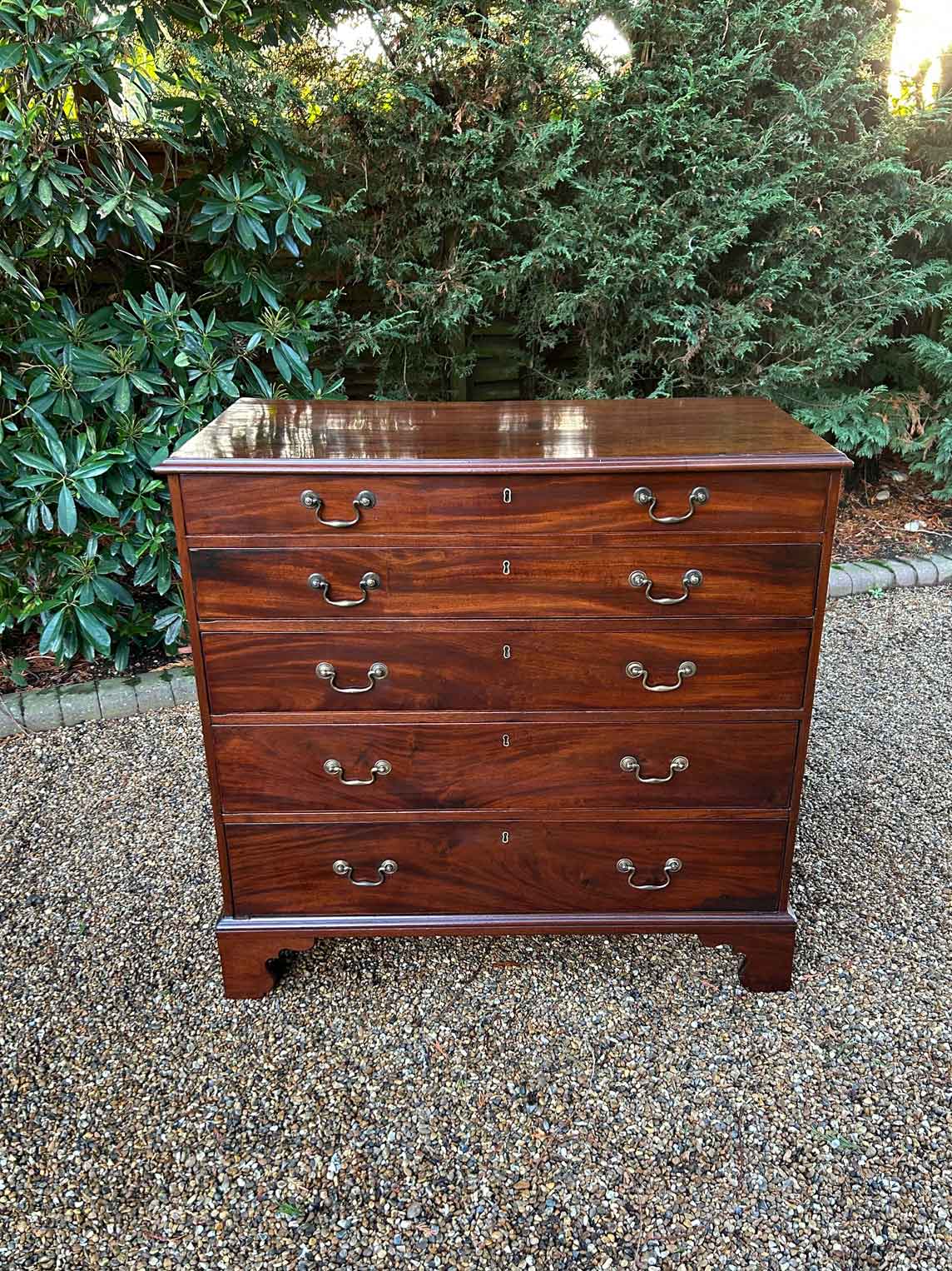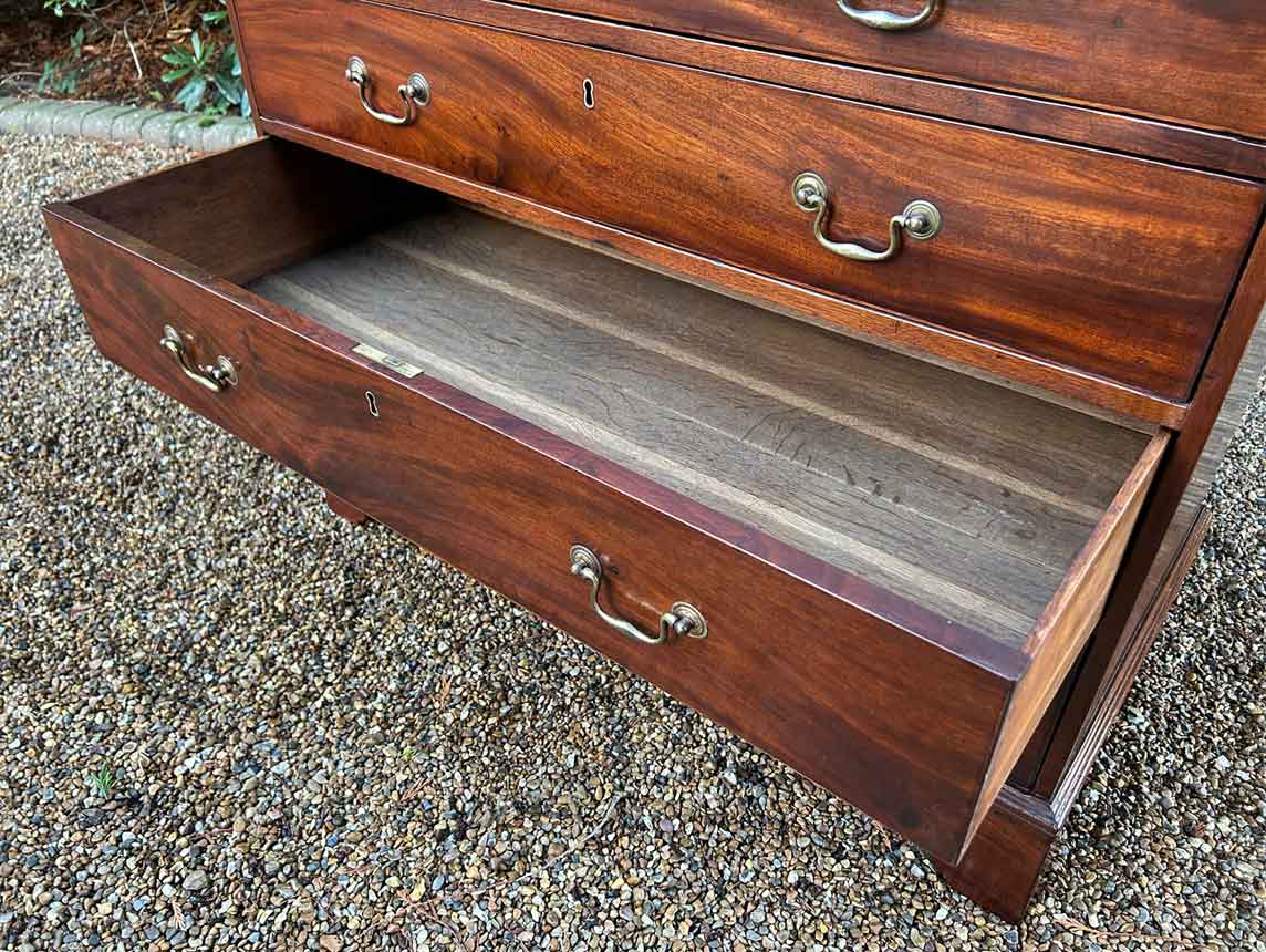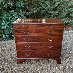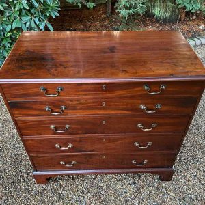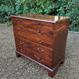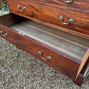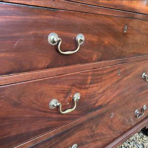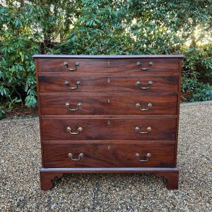 18th Century Georgian Mahogany Chest Of Drawers with five long graduated oak lined drawers, brass swan neck handles on bracket feet.