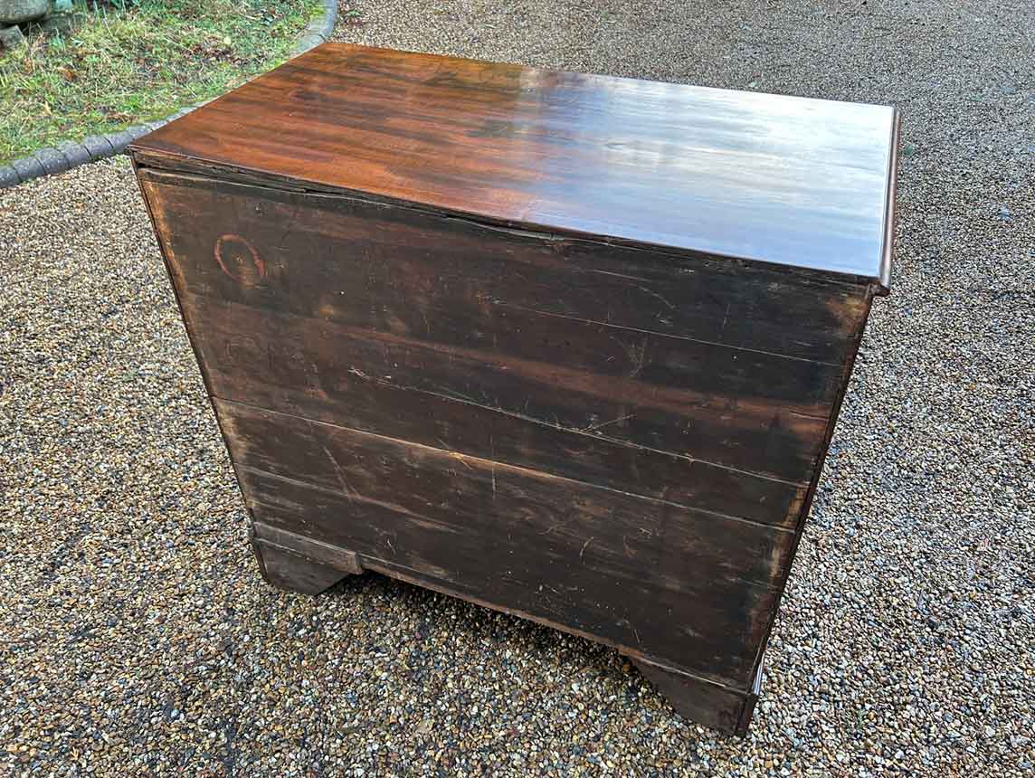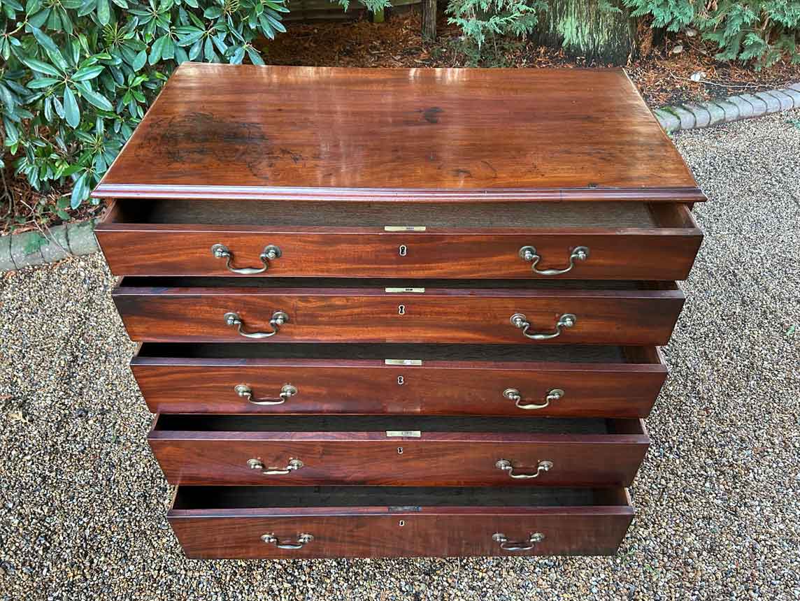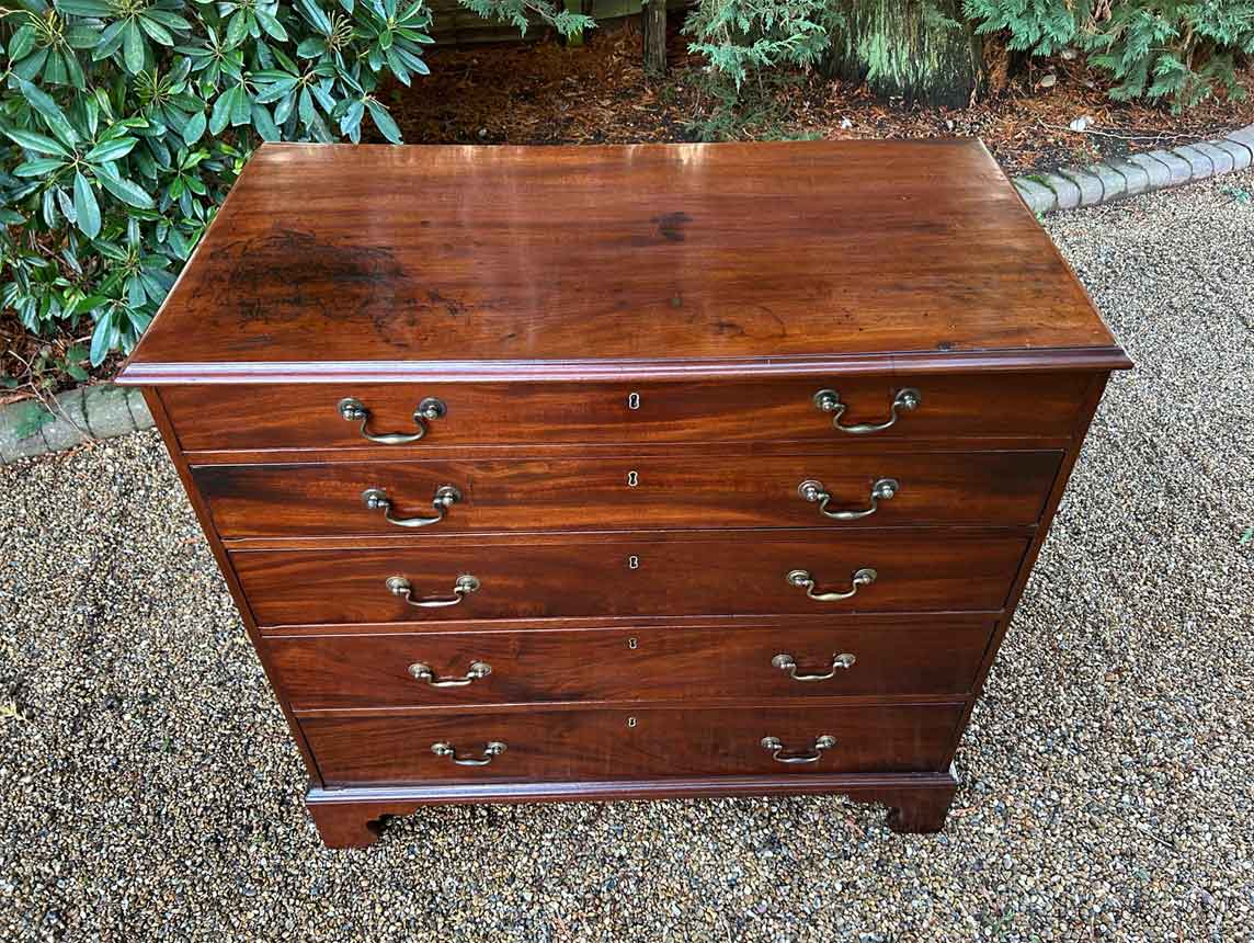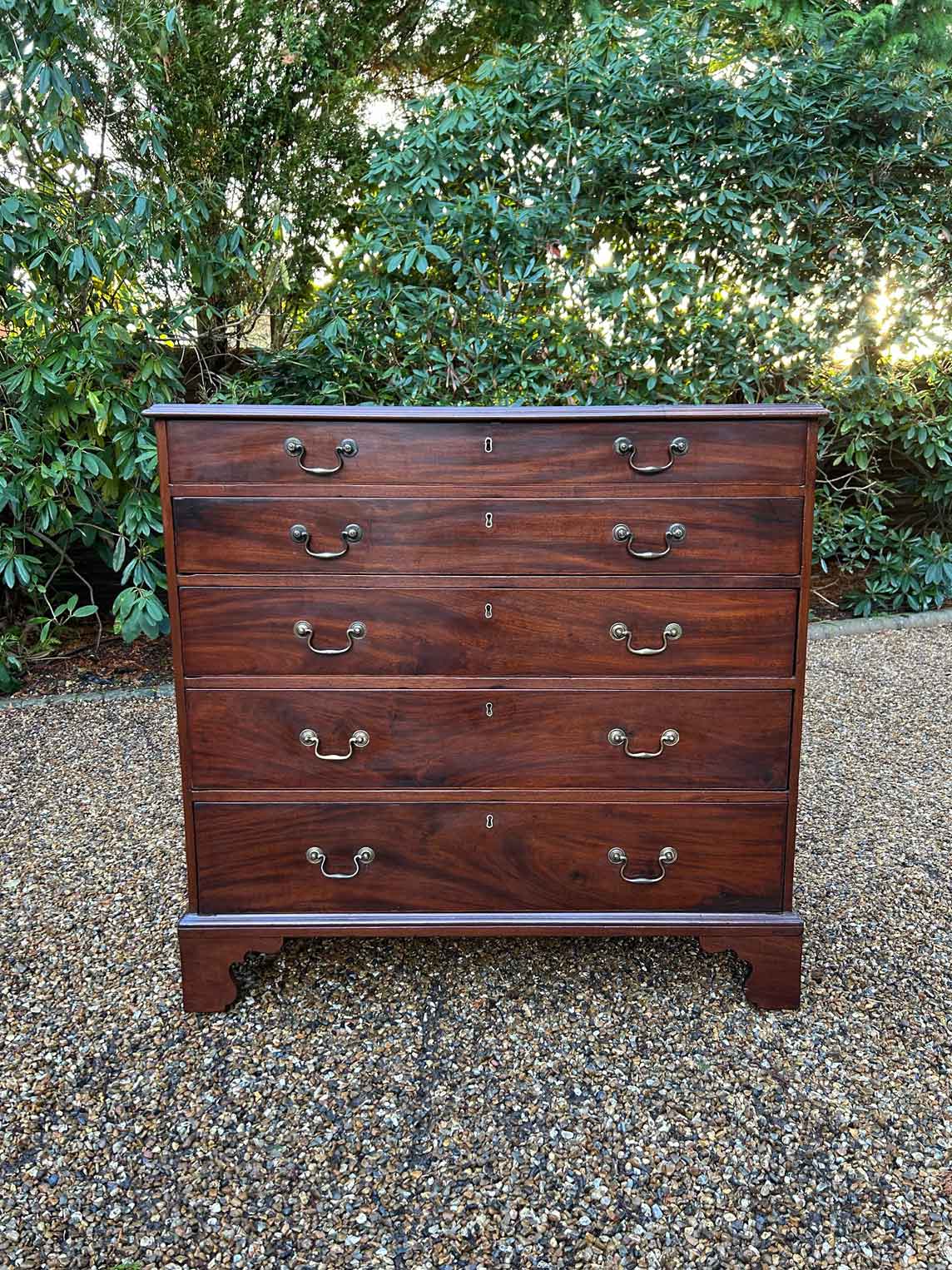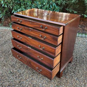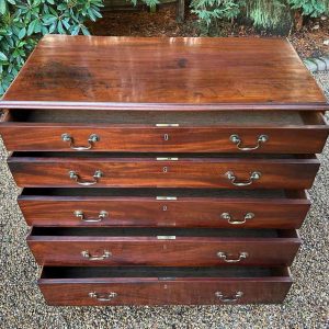 18th Century Georgian Mahogany Chest Of Drawers with five long graduated oak lined drawers, brass swan neck handles on bracket feet.