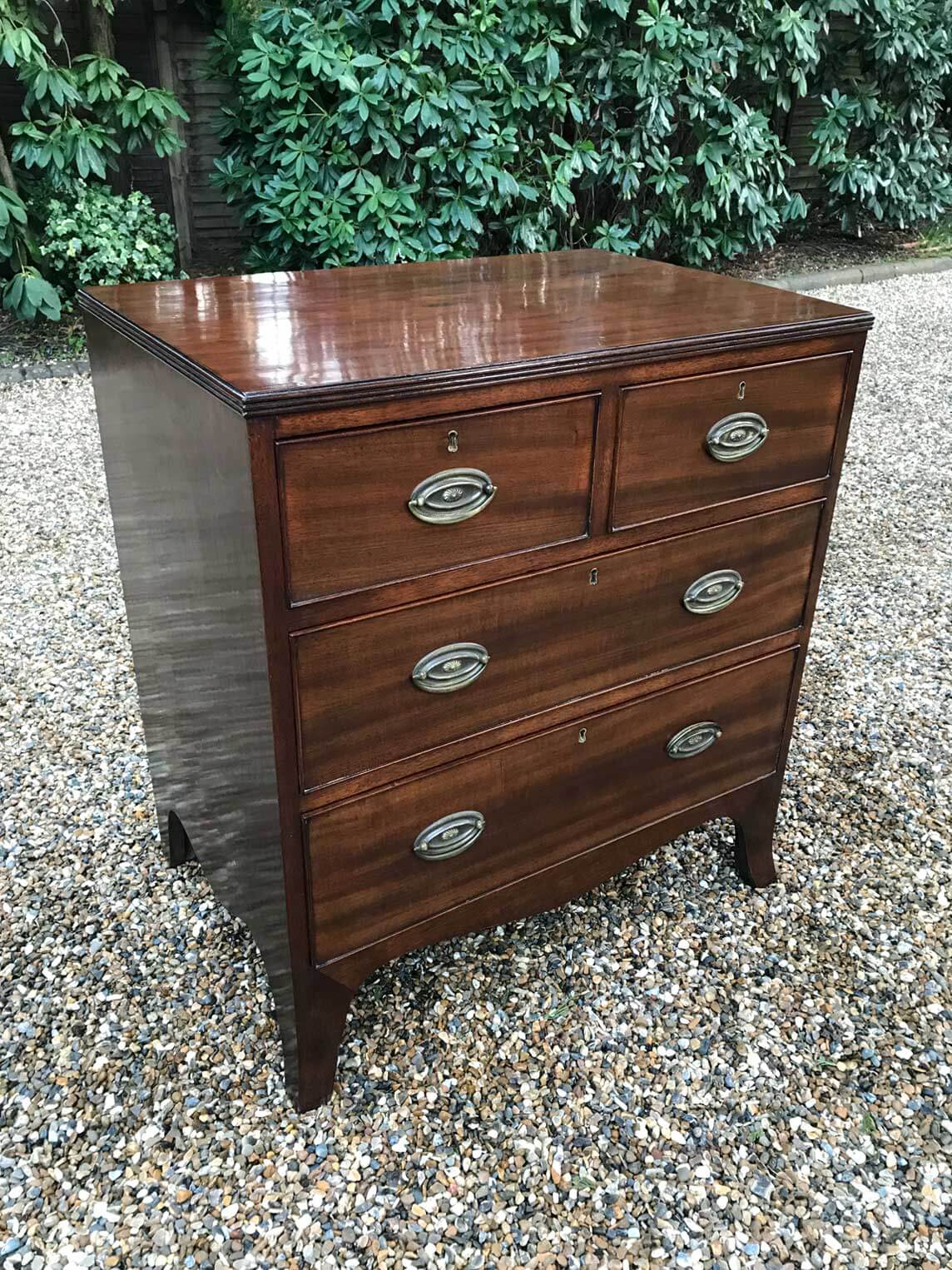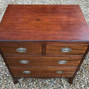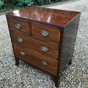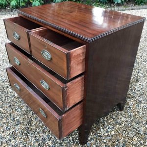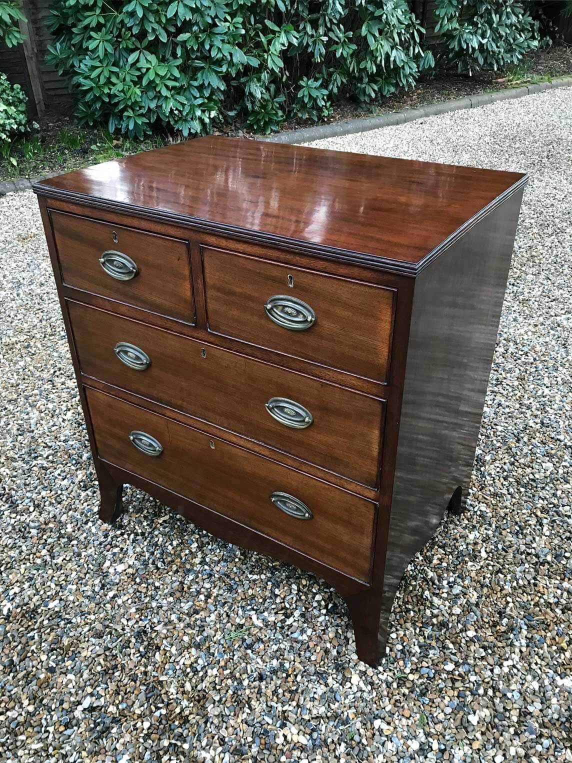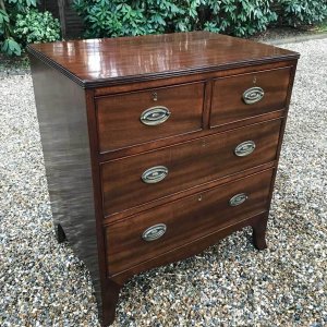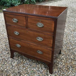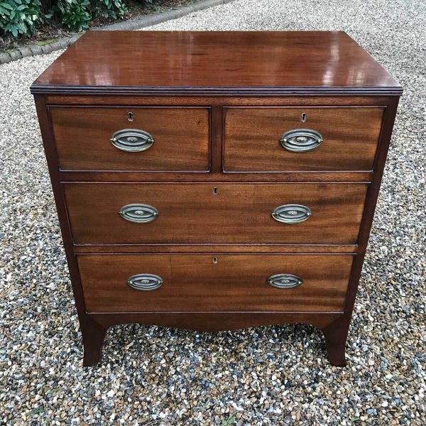 Late 18th Century George III Mahogany Chest Of Drawers with two short and two long mahogany lined drawers, with solid brass oval handles and splayed feet.