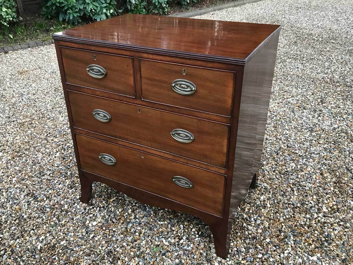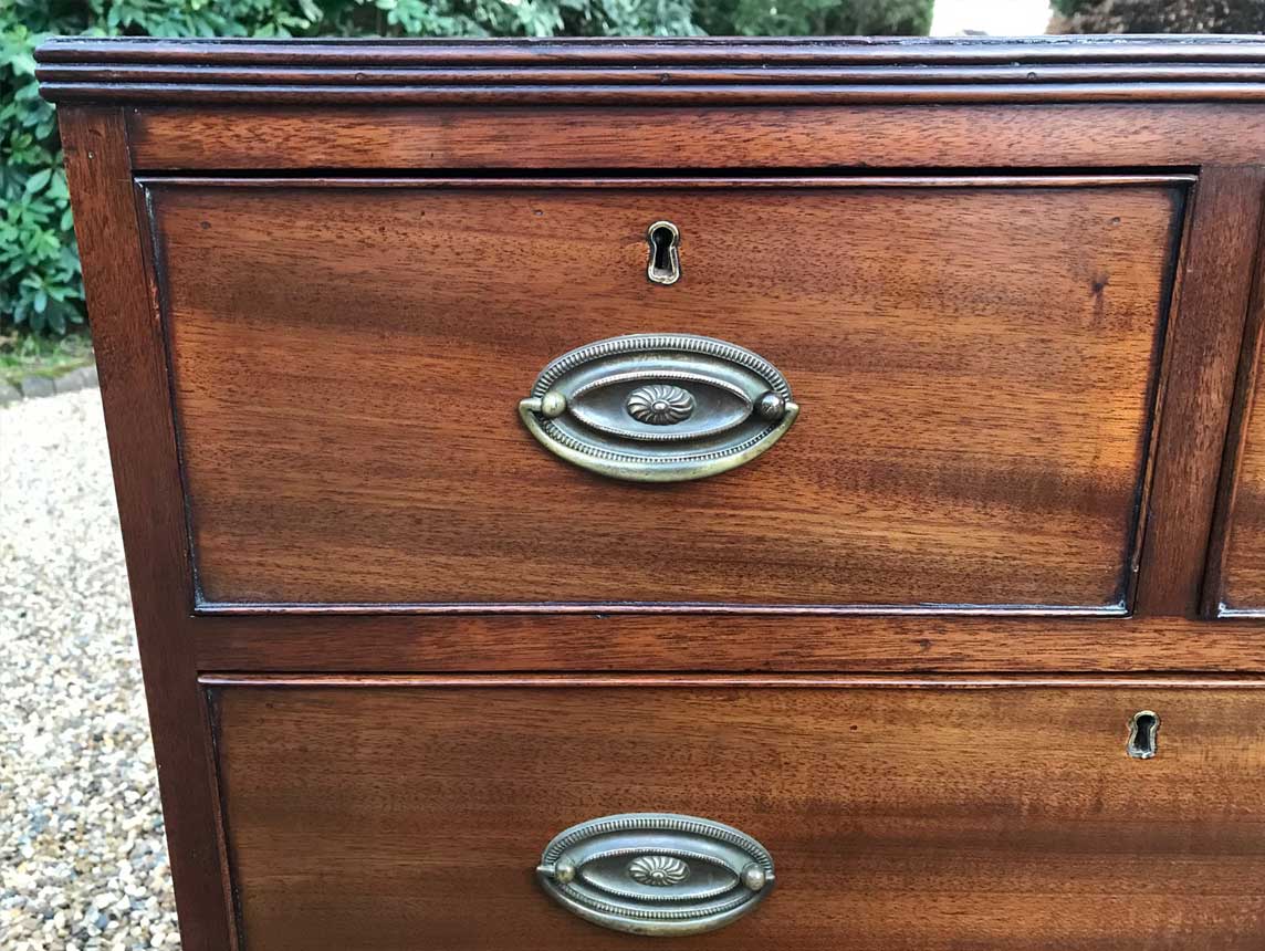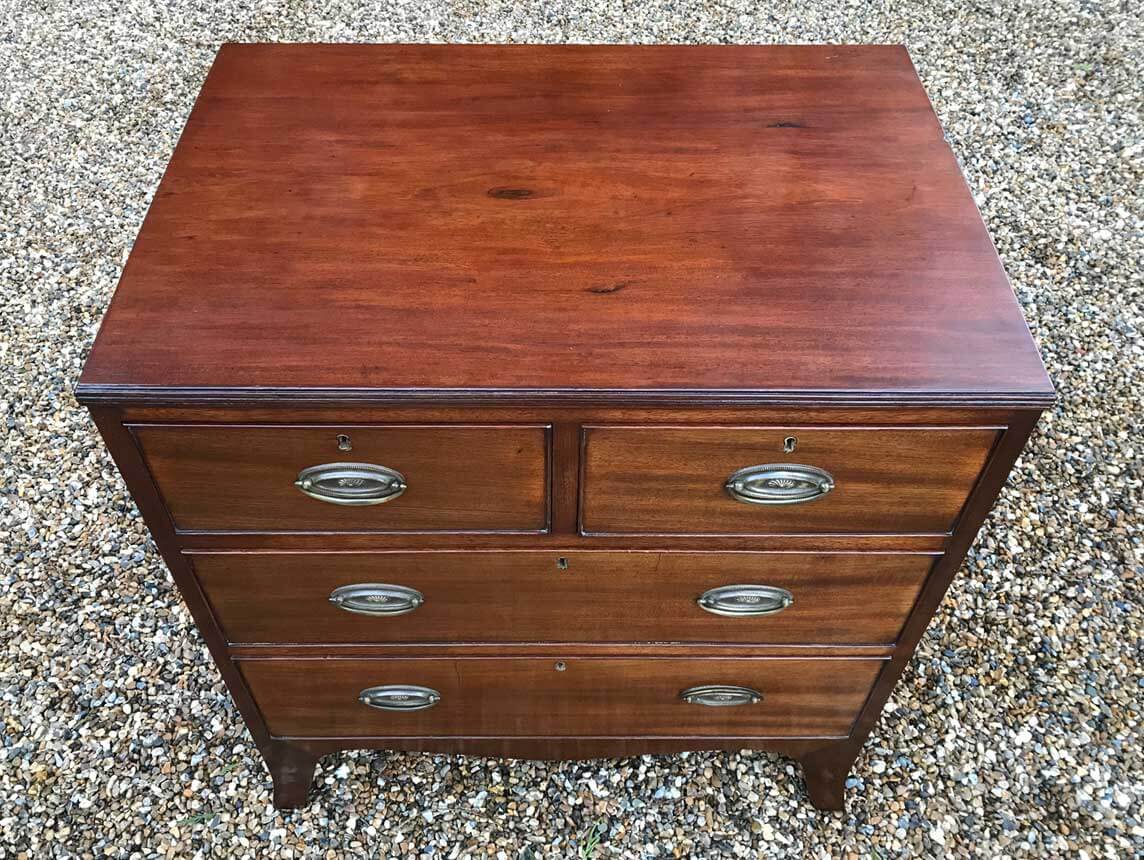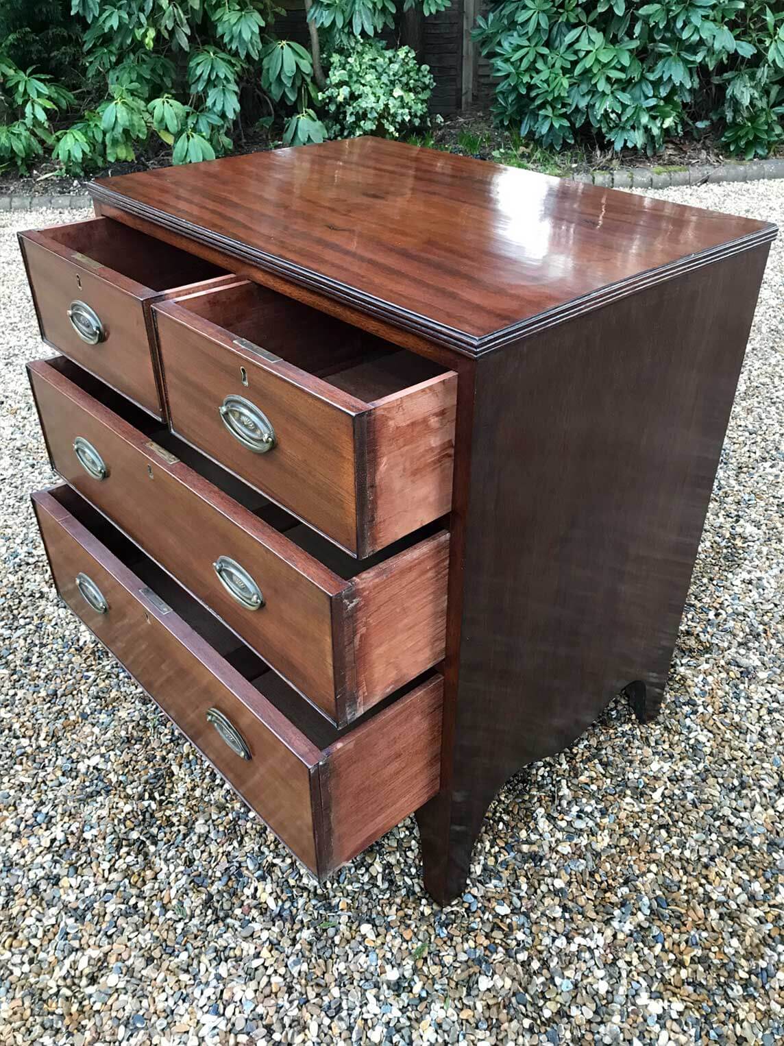 Late 18th Century George III Mahogany Chest Of Drawers with two short and two long mahogany lined drawers, with solid brass oval handles and splayed feet.