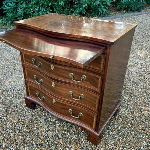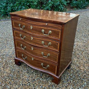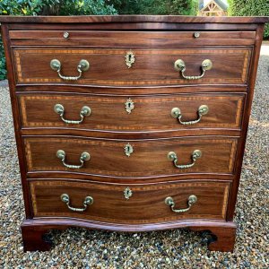 Georgian Mahogany Serpentine Chest Of Drawers, heavily inlaid with a brushing slide. Four long oak lined drawers and brass fittings throughout.