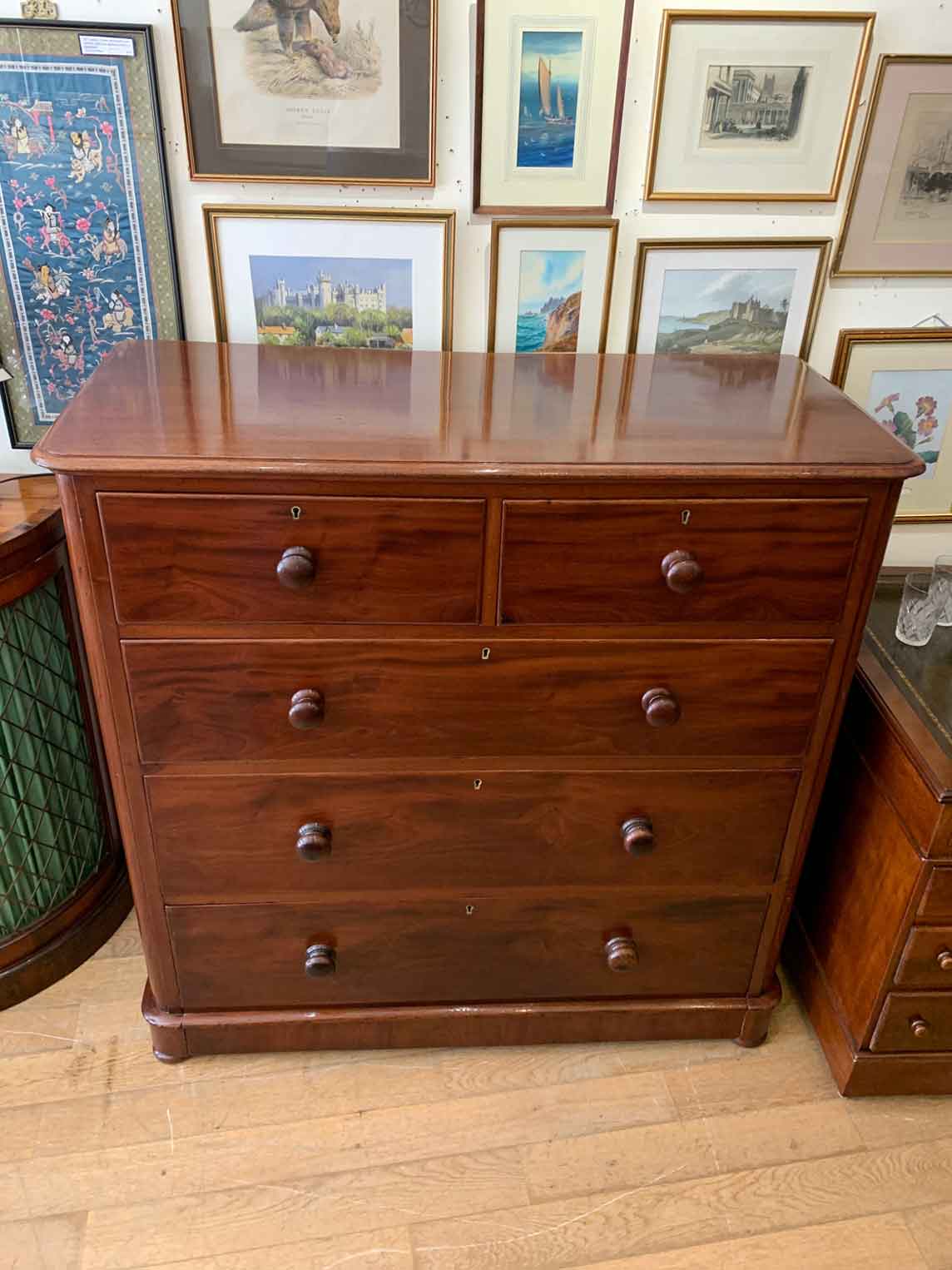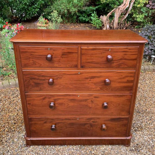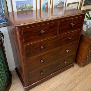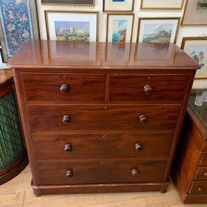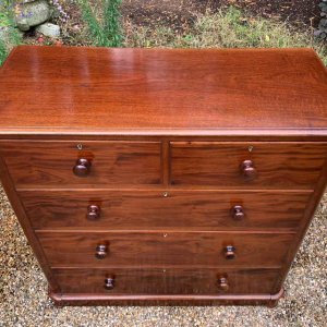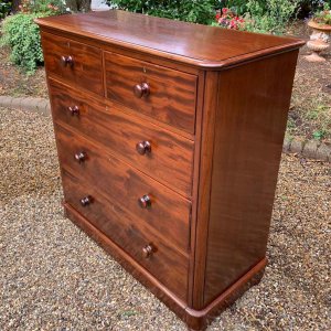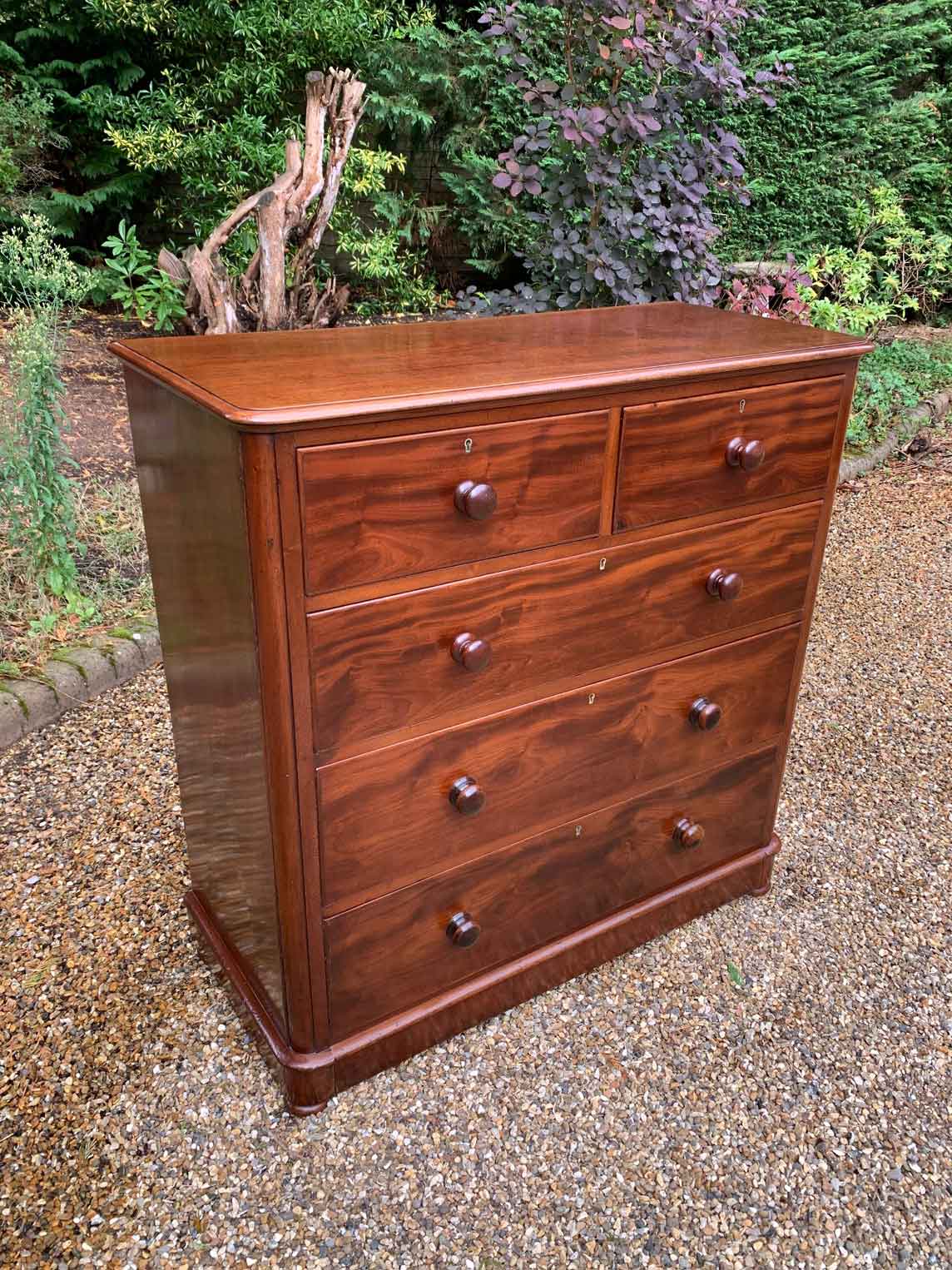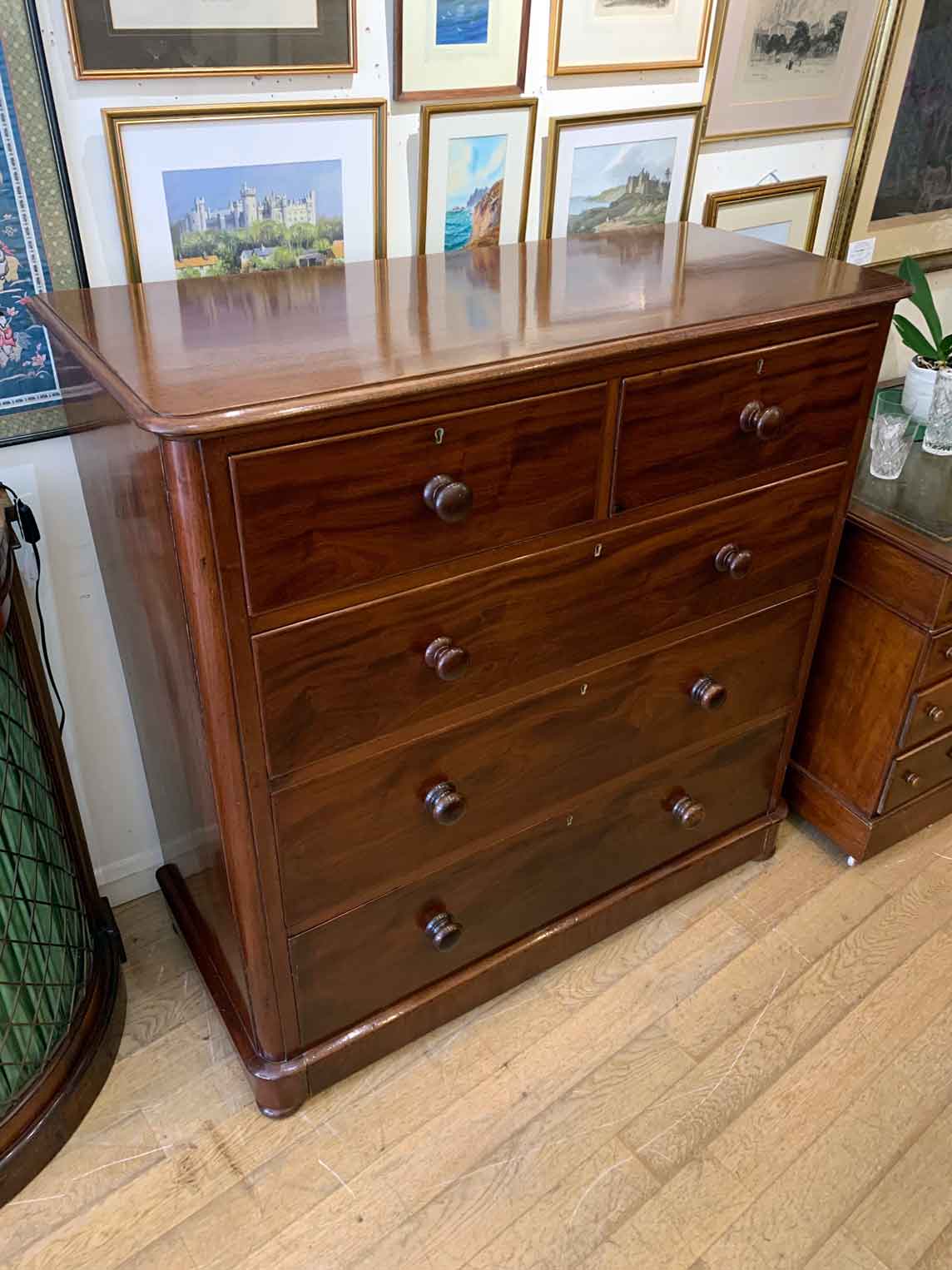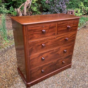 19th Century Victorian Mahogany Chest Of Drawers with two short, three long solid mahogany drawers with bun handles, raised on a platform base.