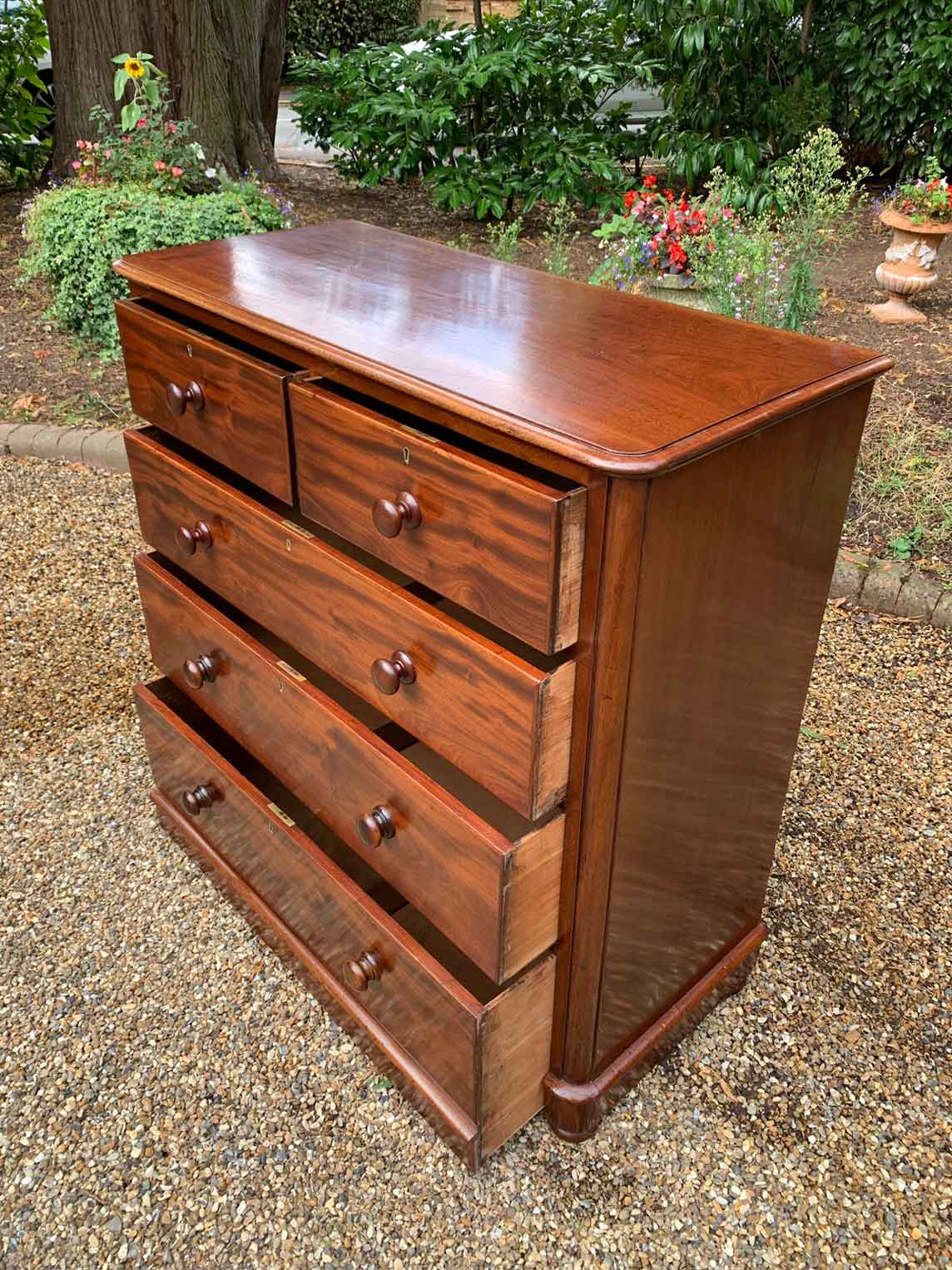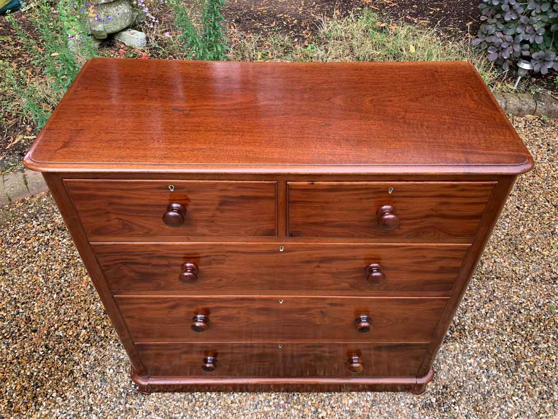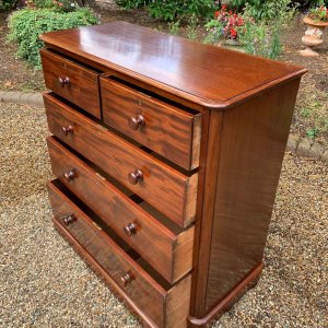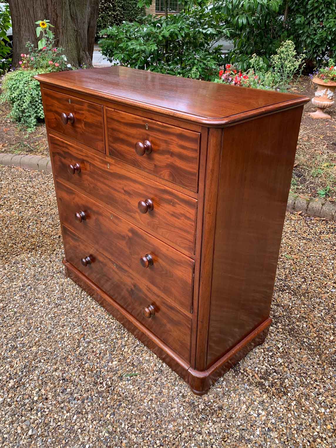 19th Century Victorian Mahogany Chest Of Drawers with two short, three long solid mahogany drawers with bun handles, raised on a platform base.